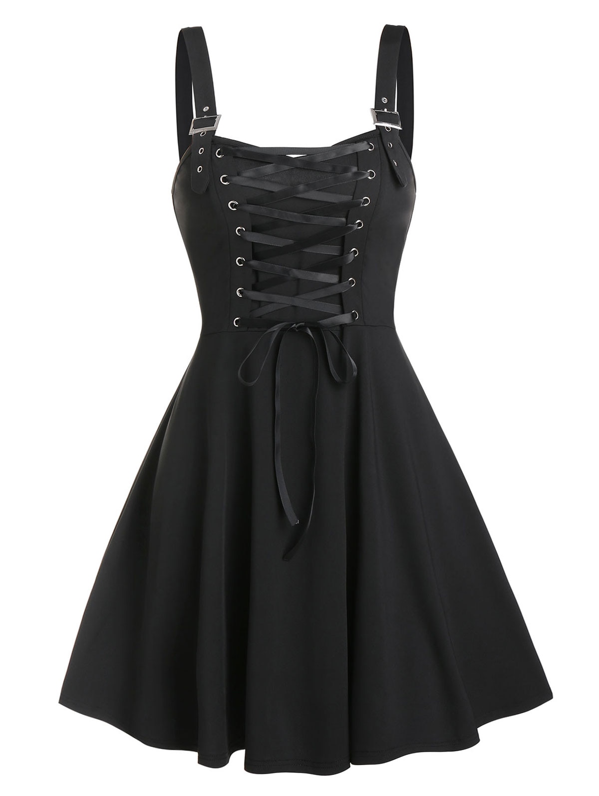 Sexy Lace Up Buckle Strap A Line Dress Gothic Harajuku Vintage Summer Sleeveless Party Dress Women Plus Size Casual Dress