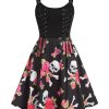 Rose Flower Print High Waist A Line Summer Sexy Dress Spaghetti Strap Women Mini Dress Night Club Party Dress Casual Home Dress