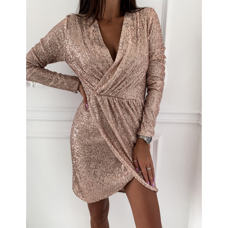 Sequined Asymmetric Mini Dress Women Long Sleeve V-neck Mini Party Dress Sequin Sexy Vestidos