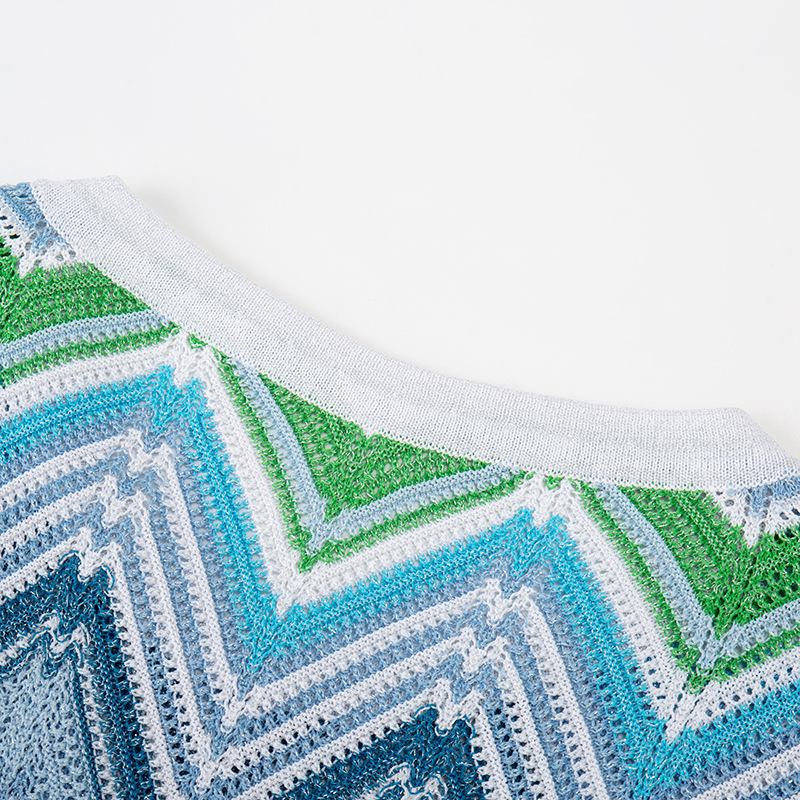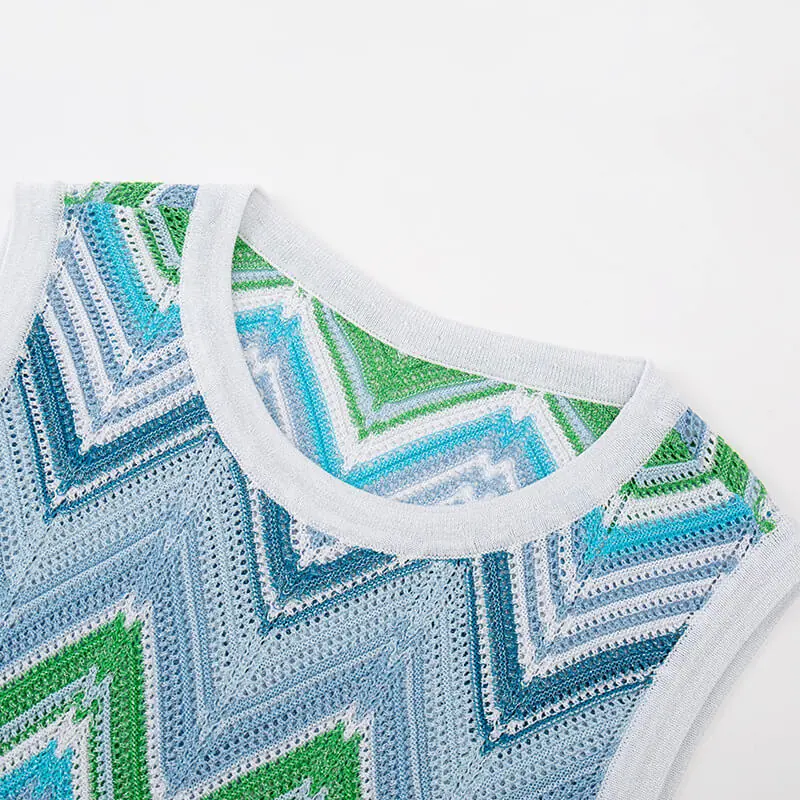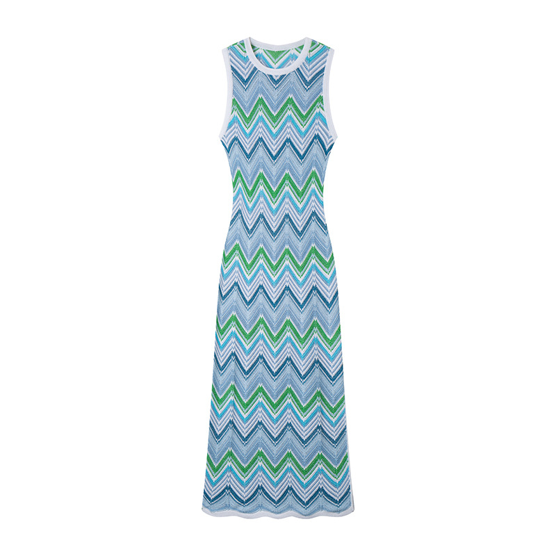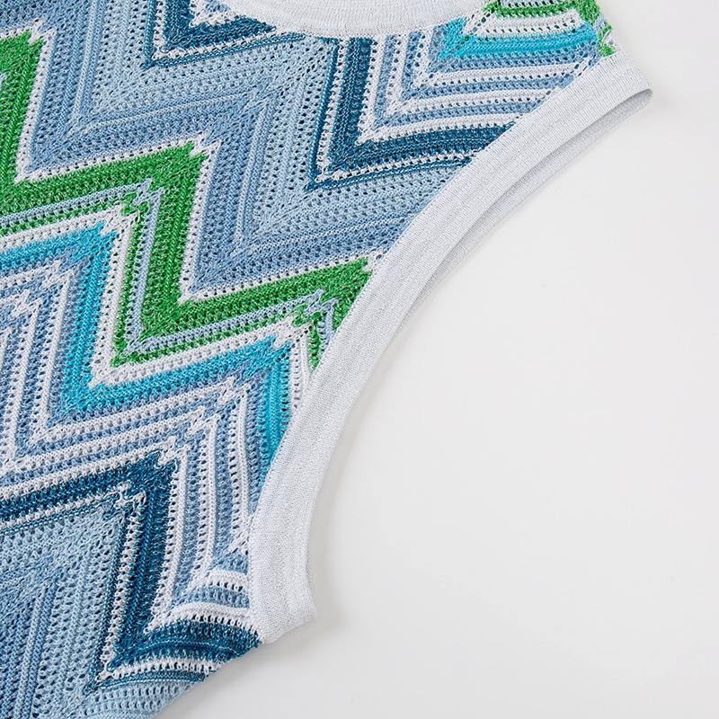 - Design Details: Sleeveless, Round Neck, High – waisted, Mid – length, Chevron Stripe, Hollow Out