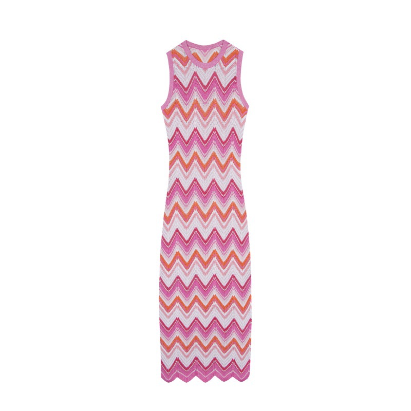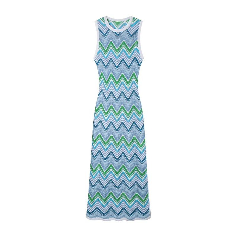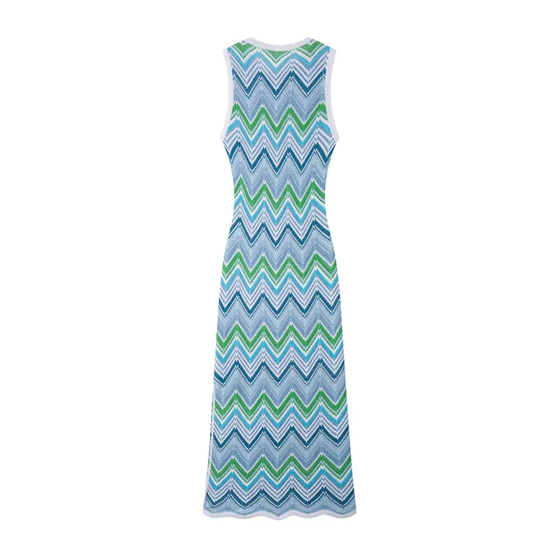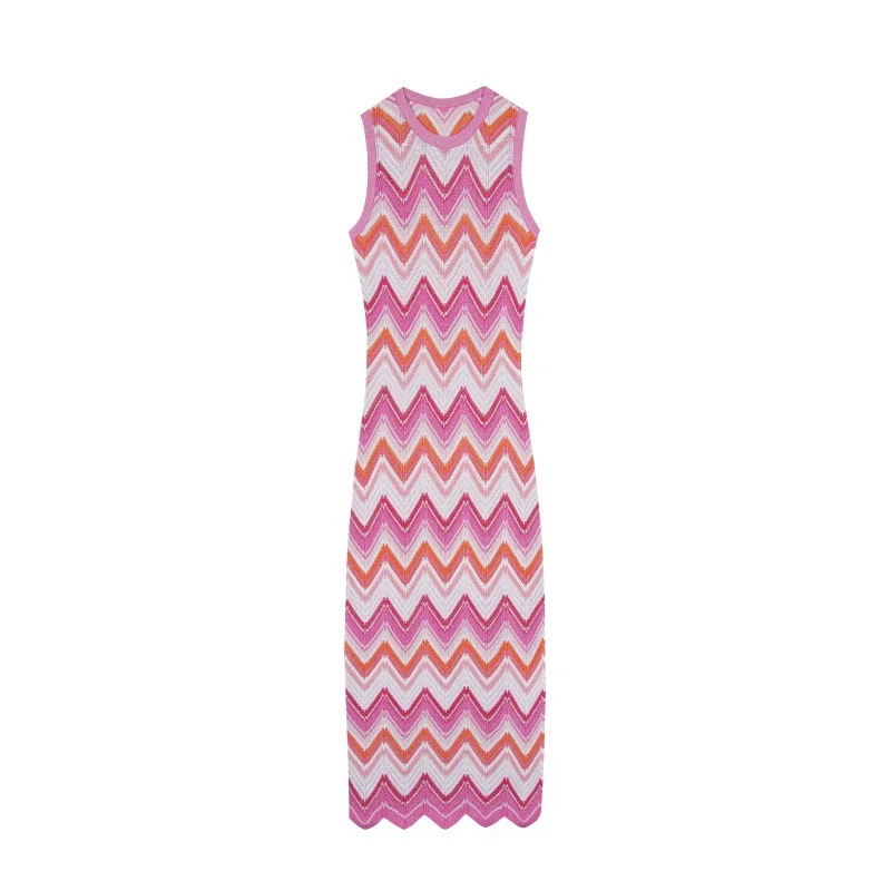 Skin-Friendly Cooling Elegant Sleeveless Round Neck Chevron Stripe Midi Knit Dress High Waisted Office