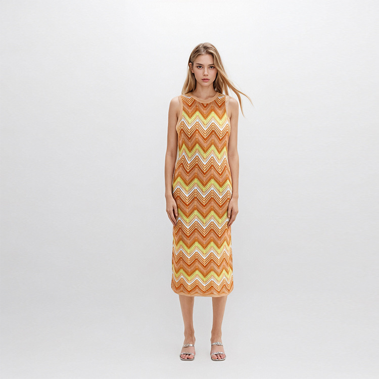 Stay cool and chic at the office or during casual outings with this sleeveless round neck midi knit dress! The chevron stripe pattern and high – waisted A – line silhouette flatter your figure, while the skin – friendly regenerated cellulose fiber fabric ensures all – day comfort. With a subtle hollow – out detail and elegant office – ready style, this dress is available in light blue, orange, or pink to suit your taste. Ideal for spring and summer, it seamlessly blends professionalism and relaxed charm.