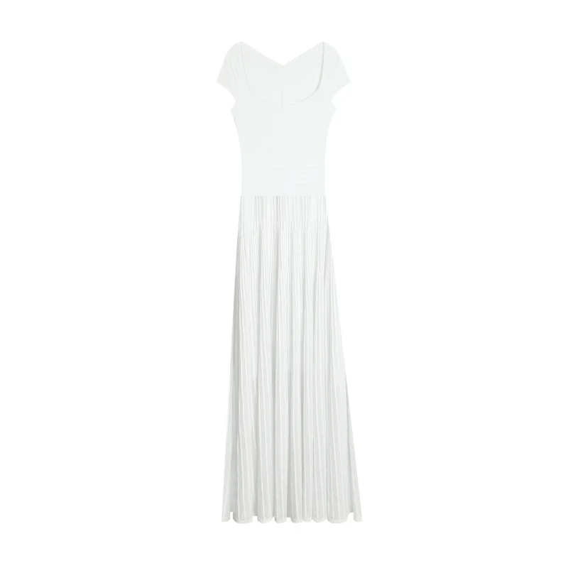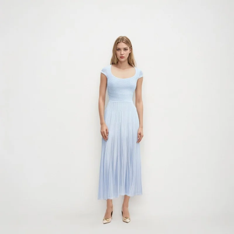 - Design Details: Square neck, regular short sleeves, high waist, A-line silhouette, midi length, subtle hollow out craft, solid color