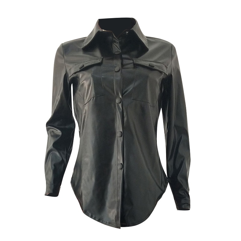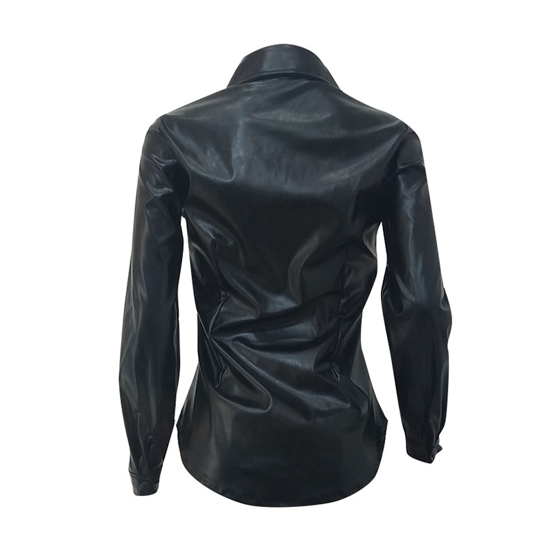 Solid Black Pu Leather Shirt Women Turn Down Collar Long Sleeve T Shirt Streetwear - Hplify