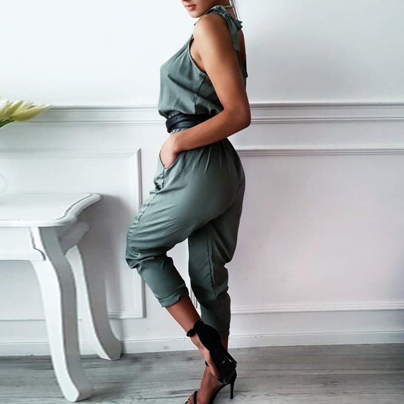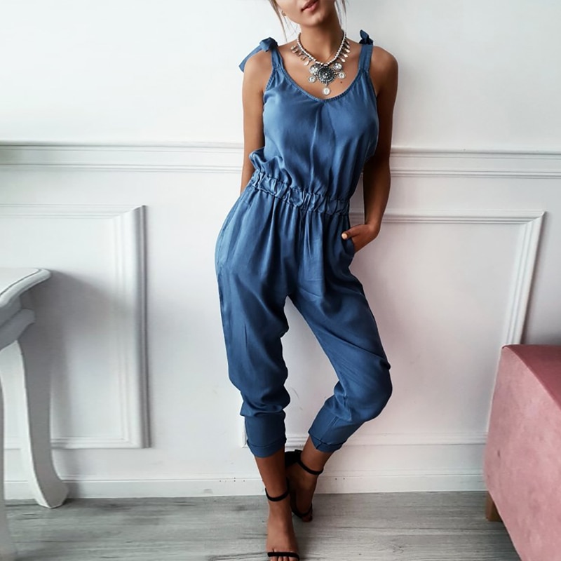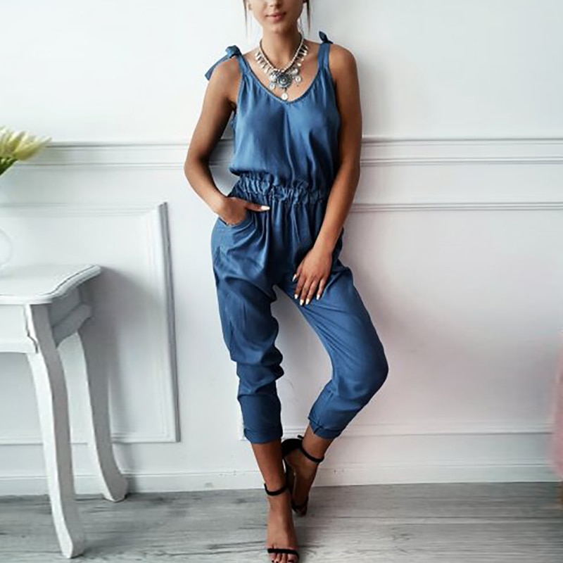 Solid color long jumpsuit for women Sleeveless casual rompers womens jumpsuit Summer elastic waist overalls femme bodysuit - Hplify