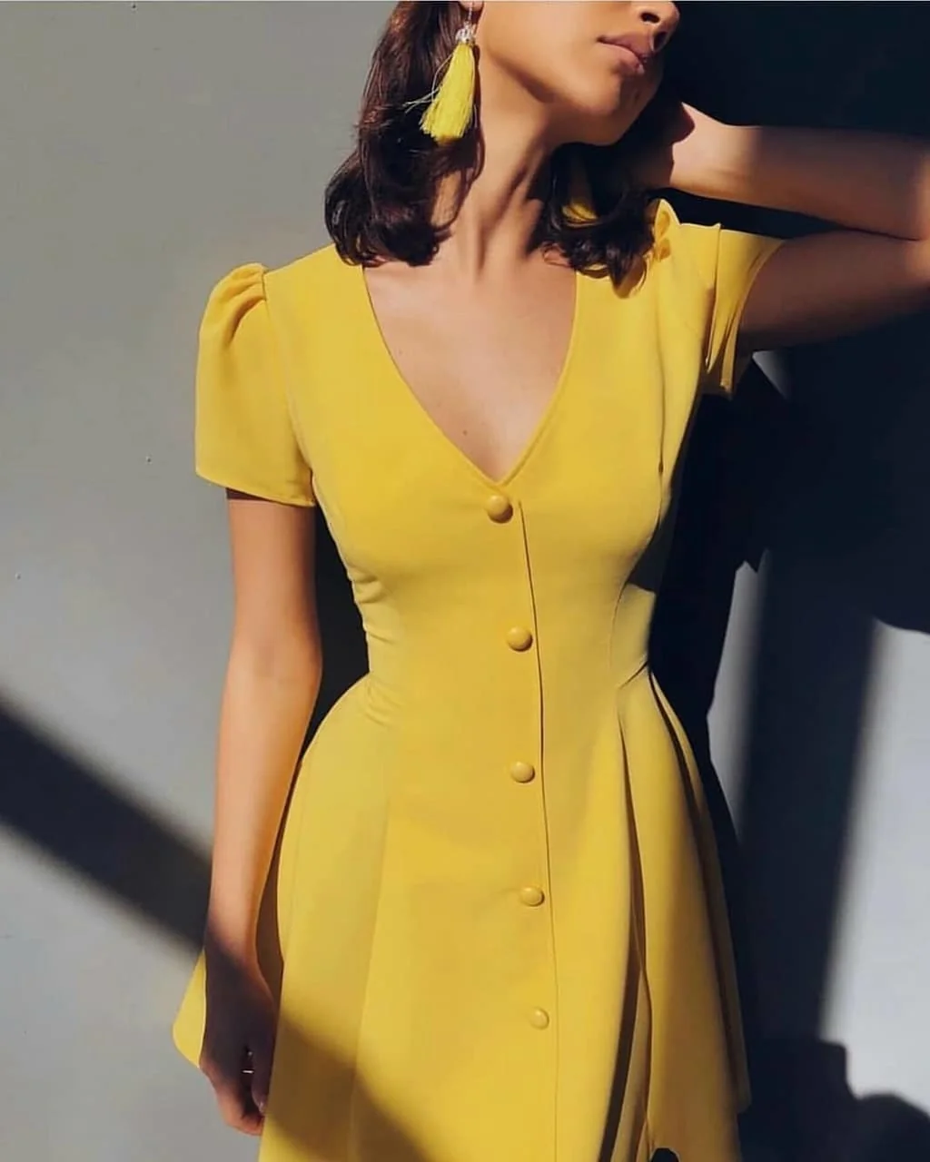 The Best Solid color V-neck short-sleeve single-row button high-waist dress Online - Hplify
