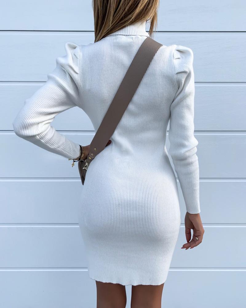 Solid Ribbed Puff Sleeve Bodycon Dress women white mini pencil dress - Hplify