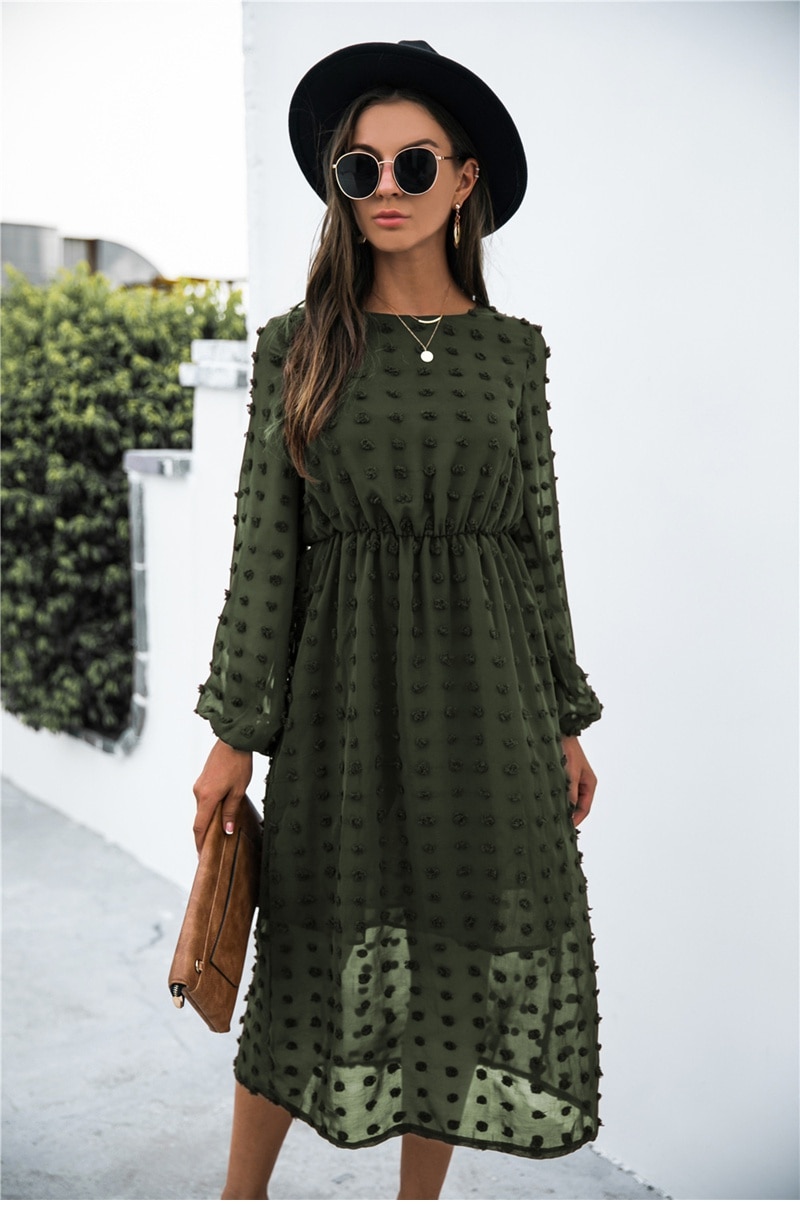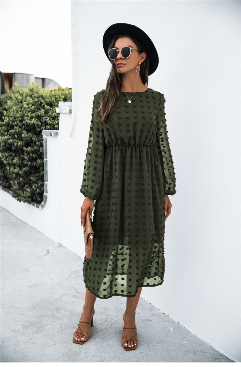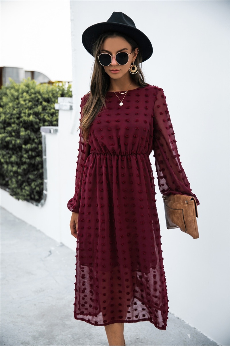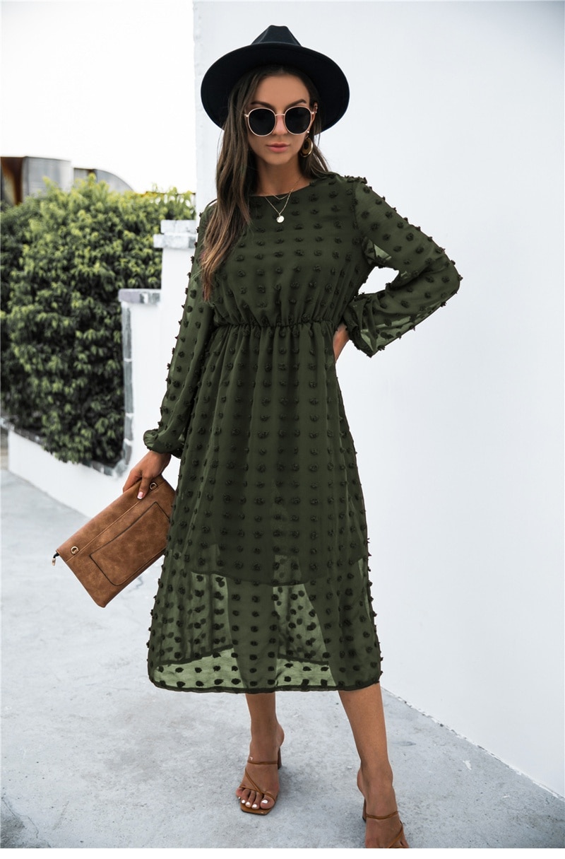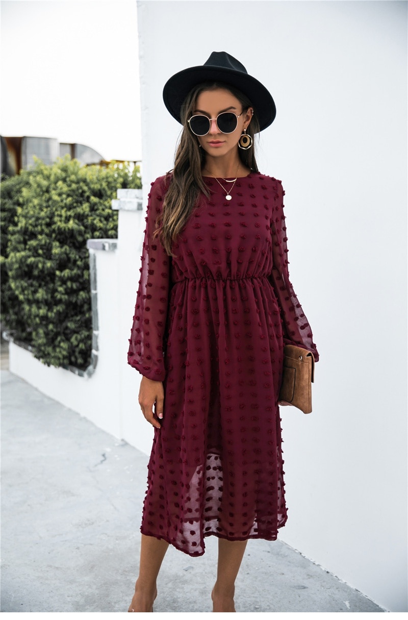 Spring Autumn Long Sleeve Jacquard Hair Ball Dress For Women O Neck Waist Casual All Match Solid Color Long Dress