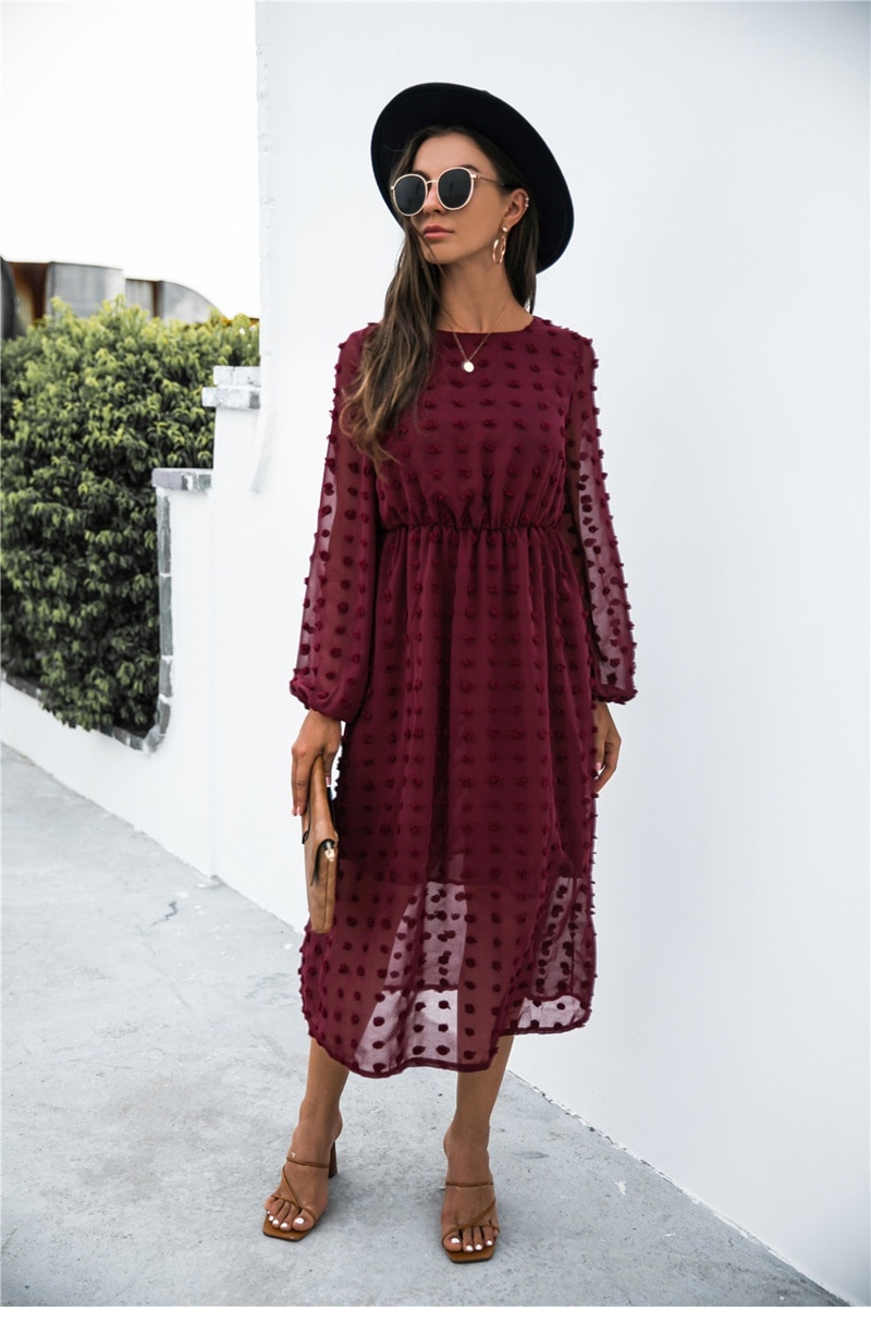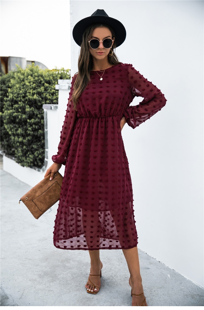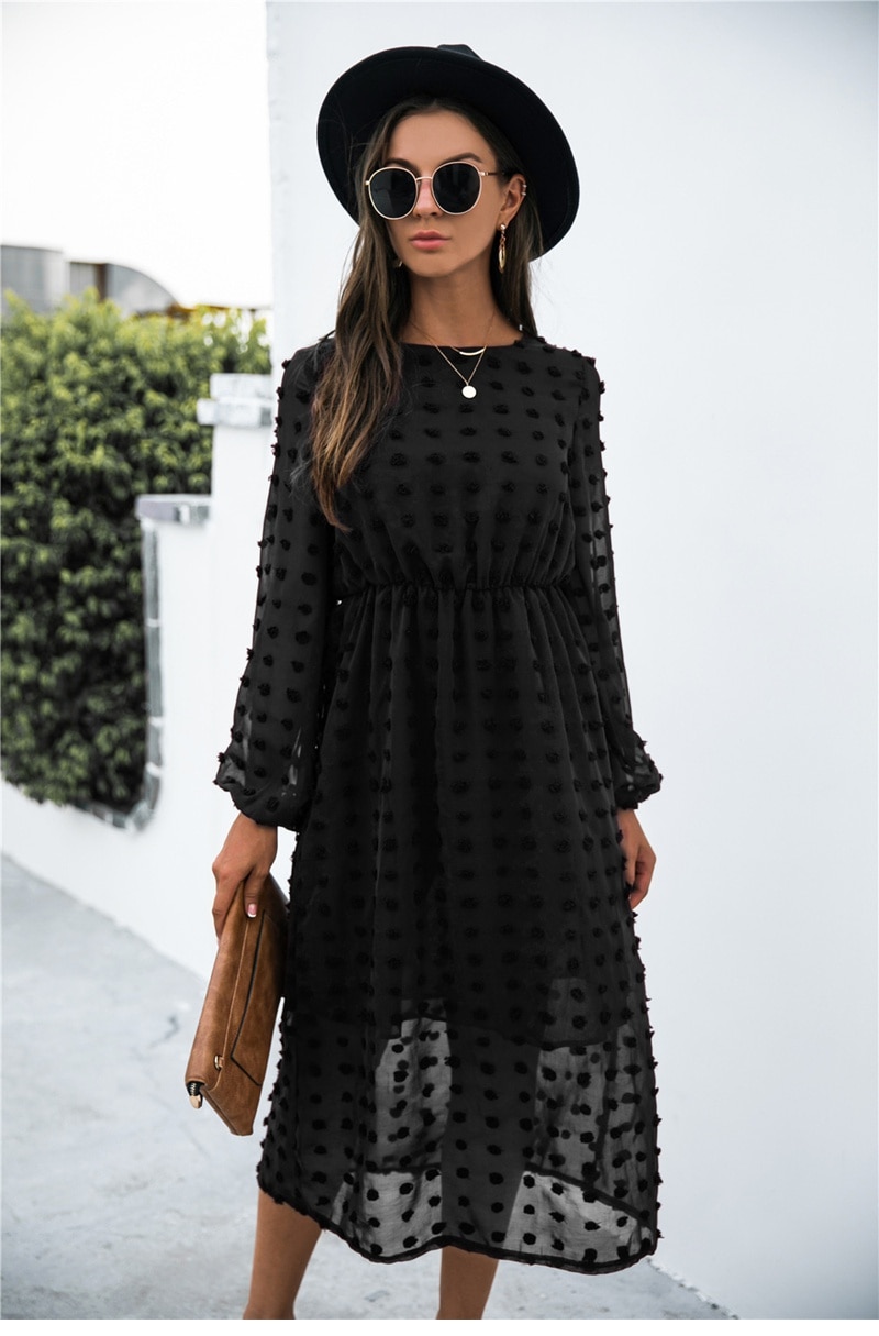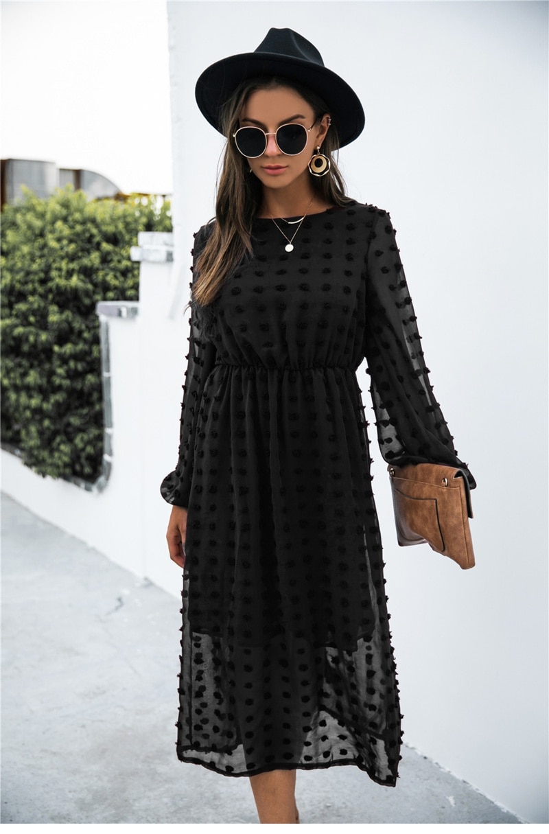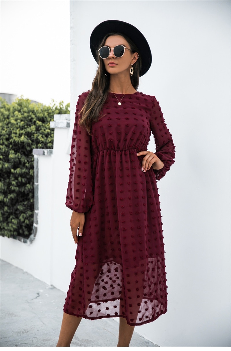 Spring Autumn Long Sleeve Jacquard Hair Ball Dress For Women O Neck Waist Casual All Match Solid Color Long Dress