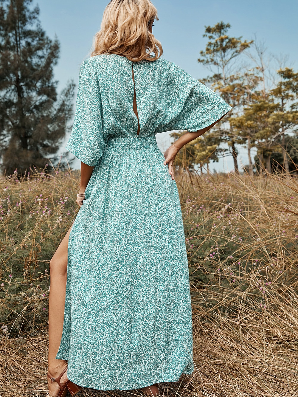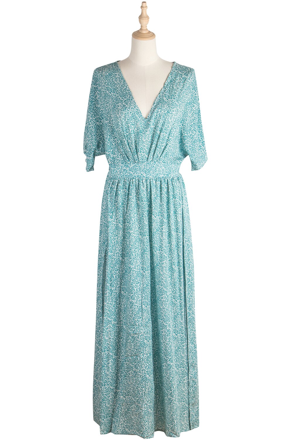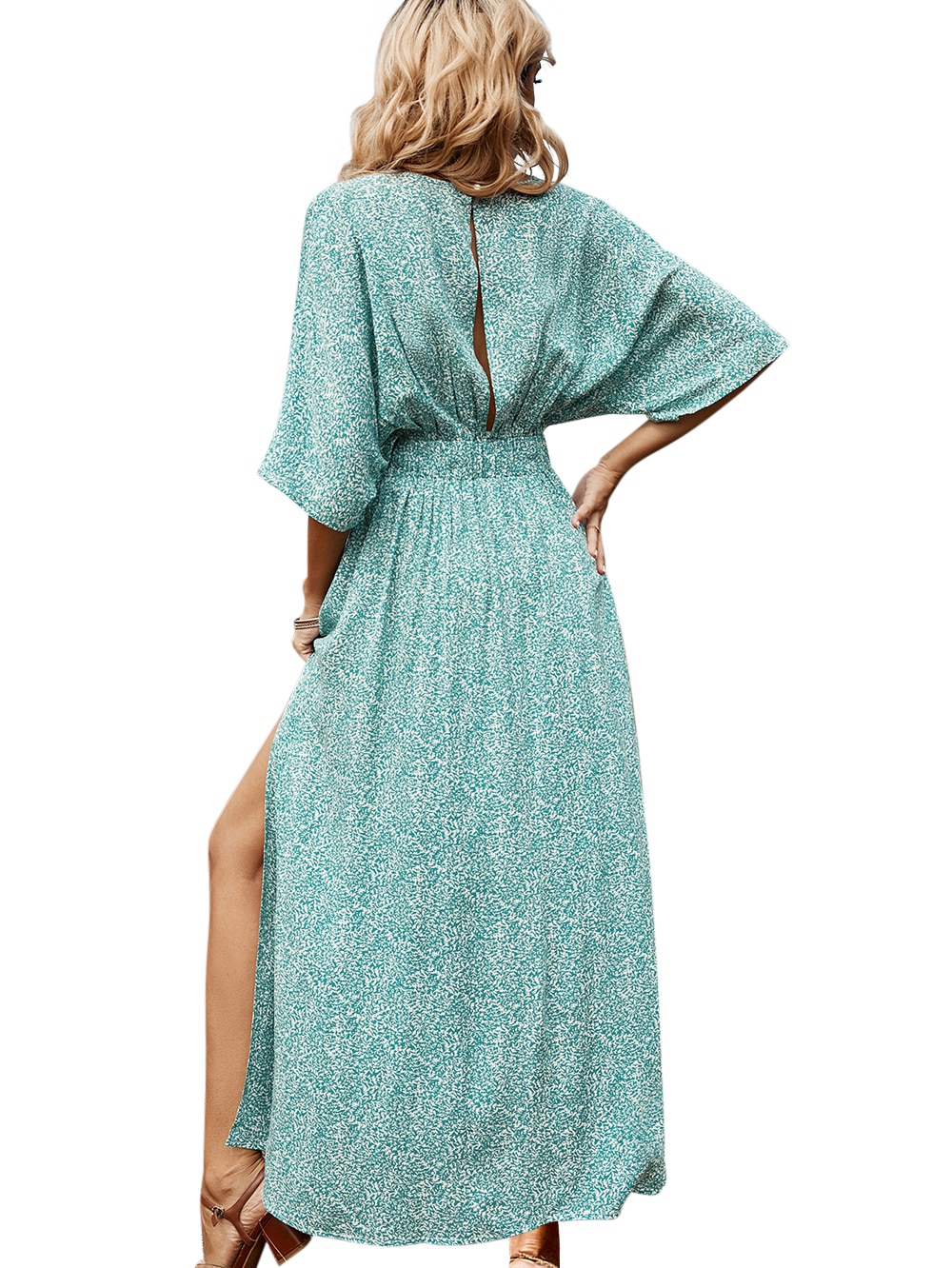 Spring Ladies Green Floral V-Neck Chic Dress Women Mid-Sleeve Long Open Back Irregular Long Dress