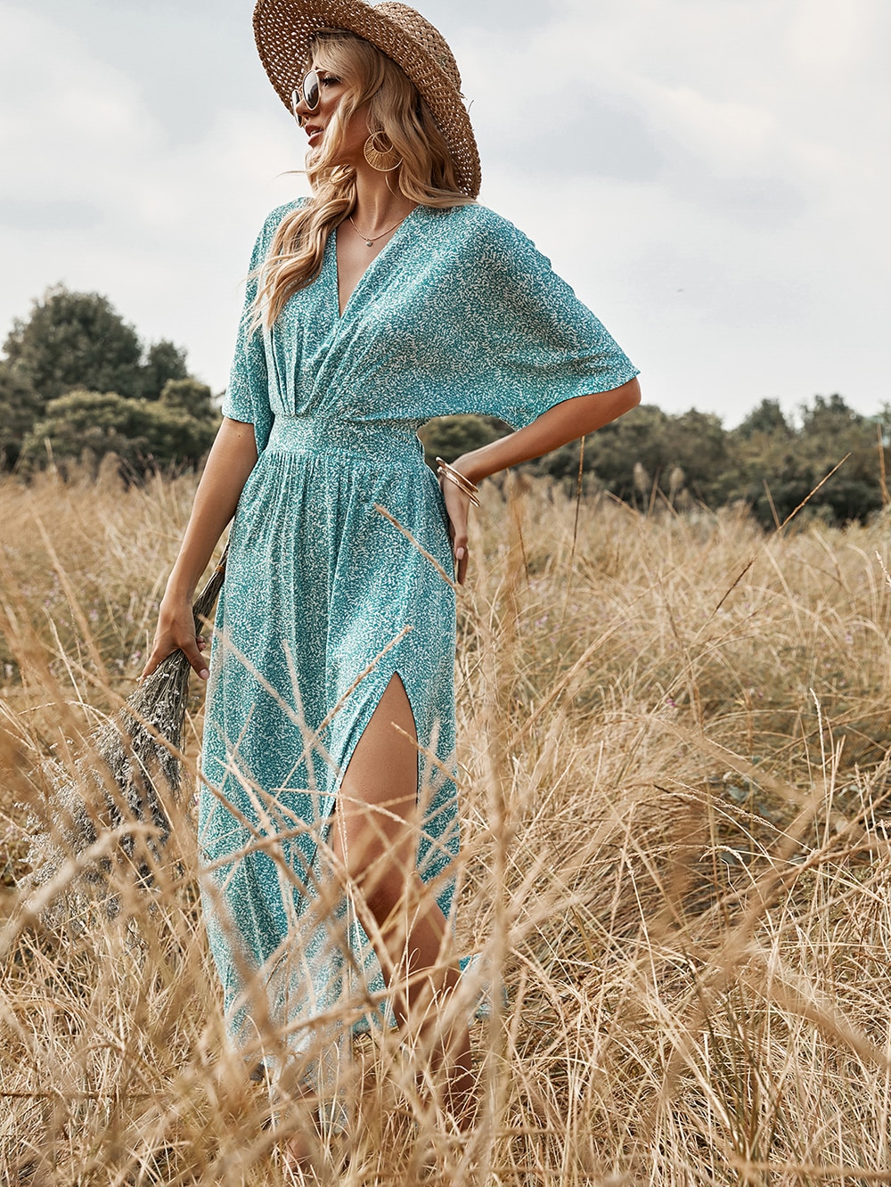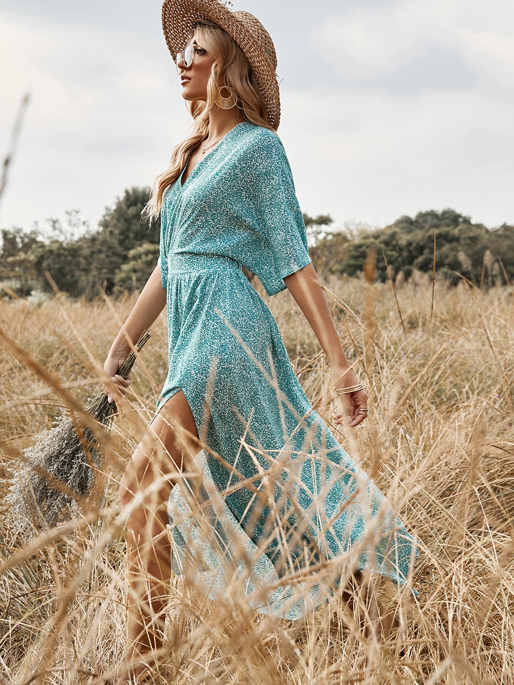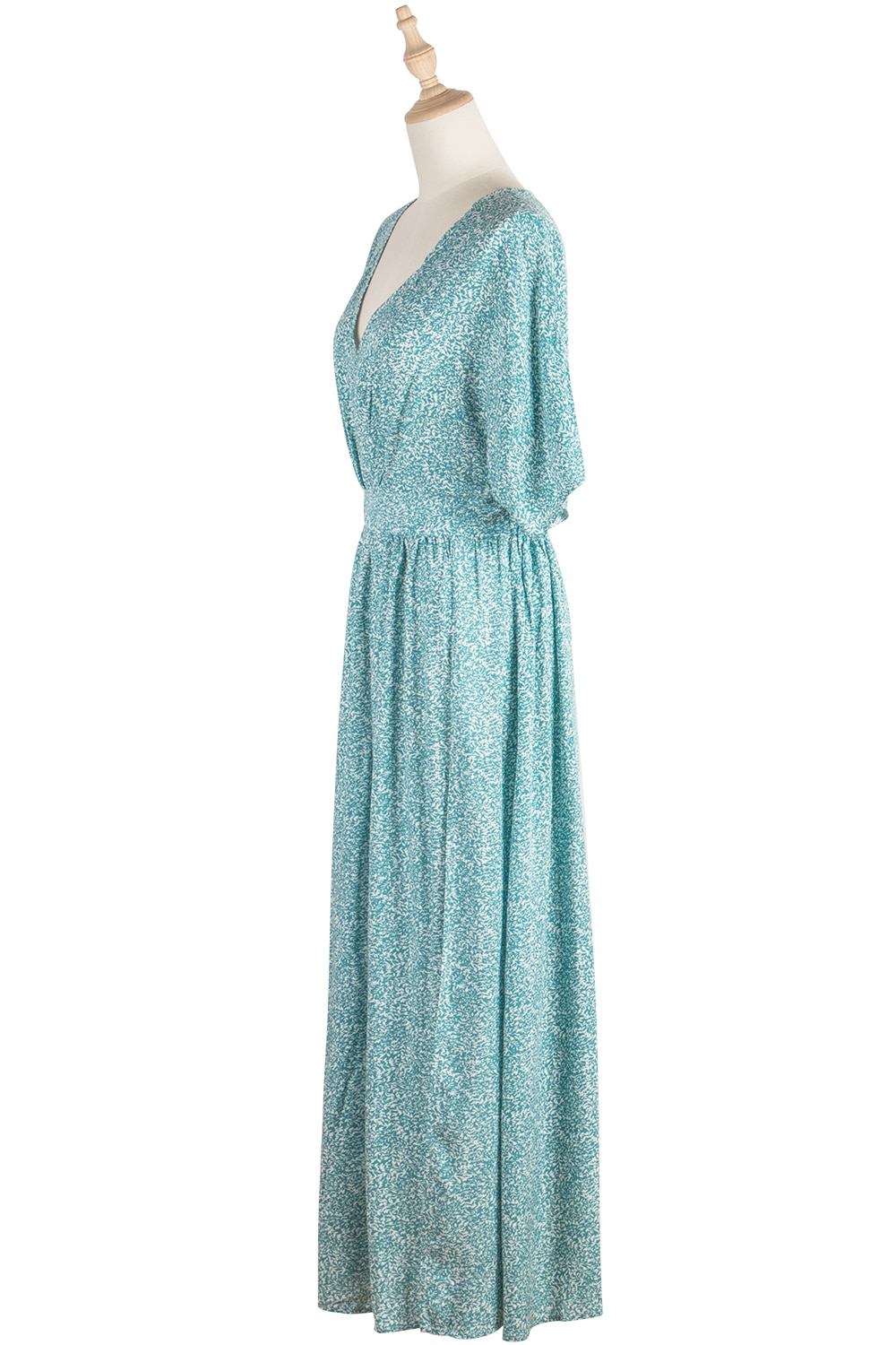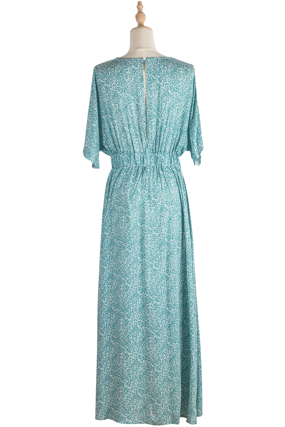 Spring Ladies Green Floral V-Neck Chic Dress Women Mid-Sleeve Long Open Back Irregular Long Dress