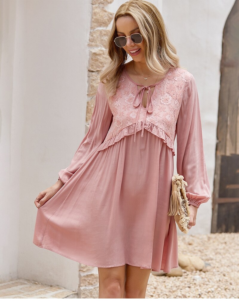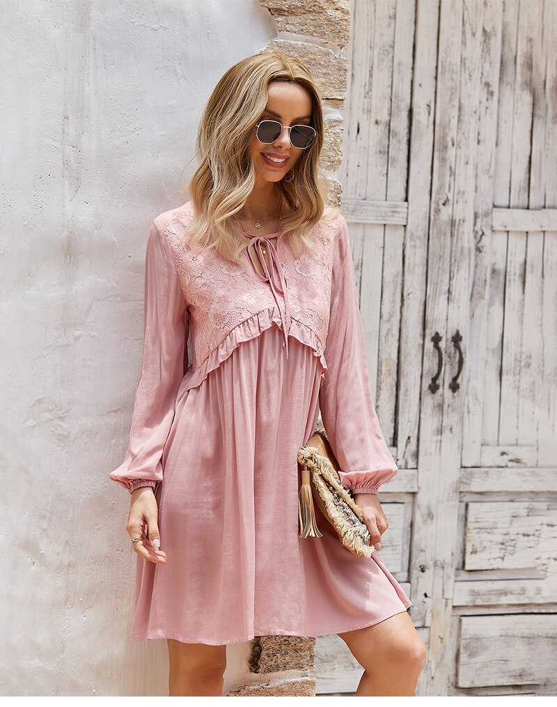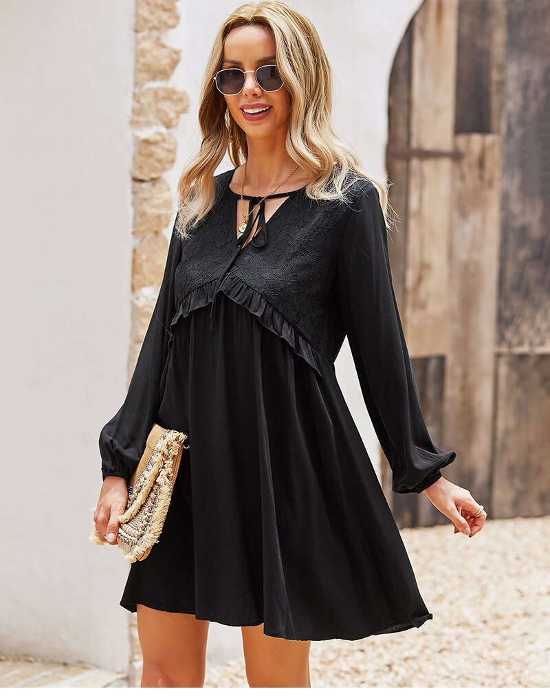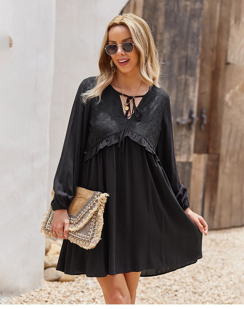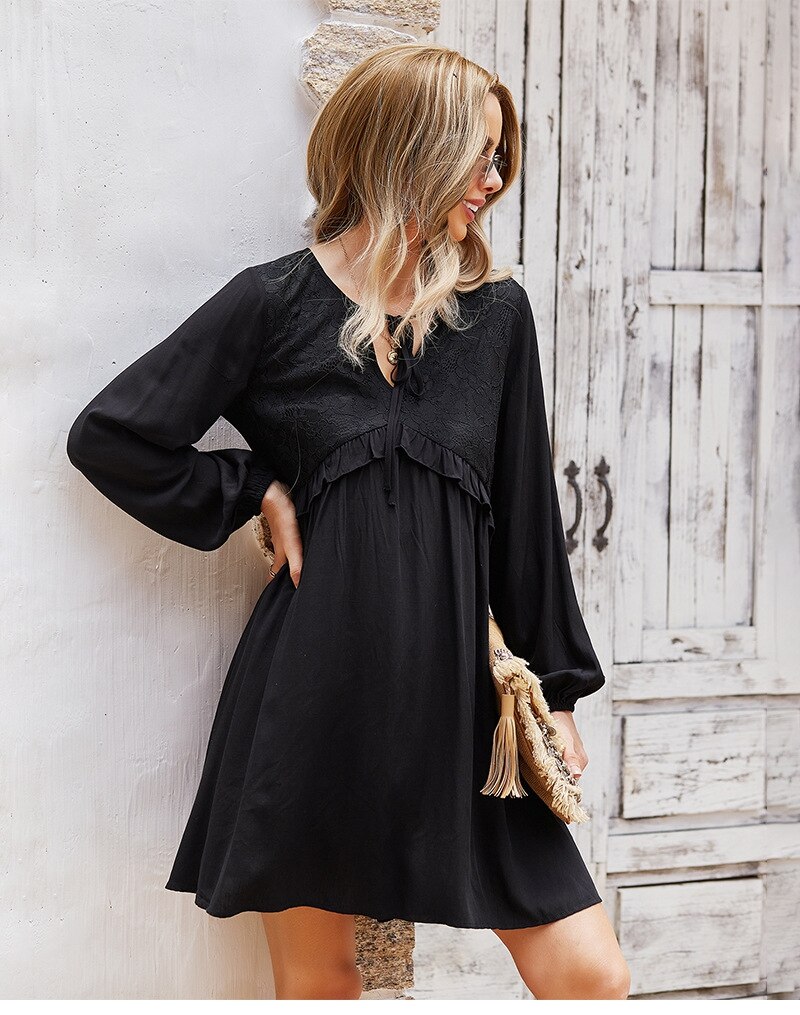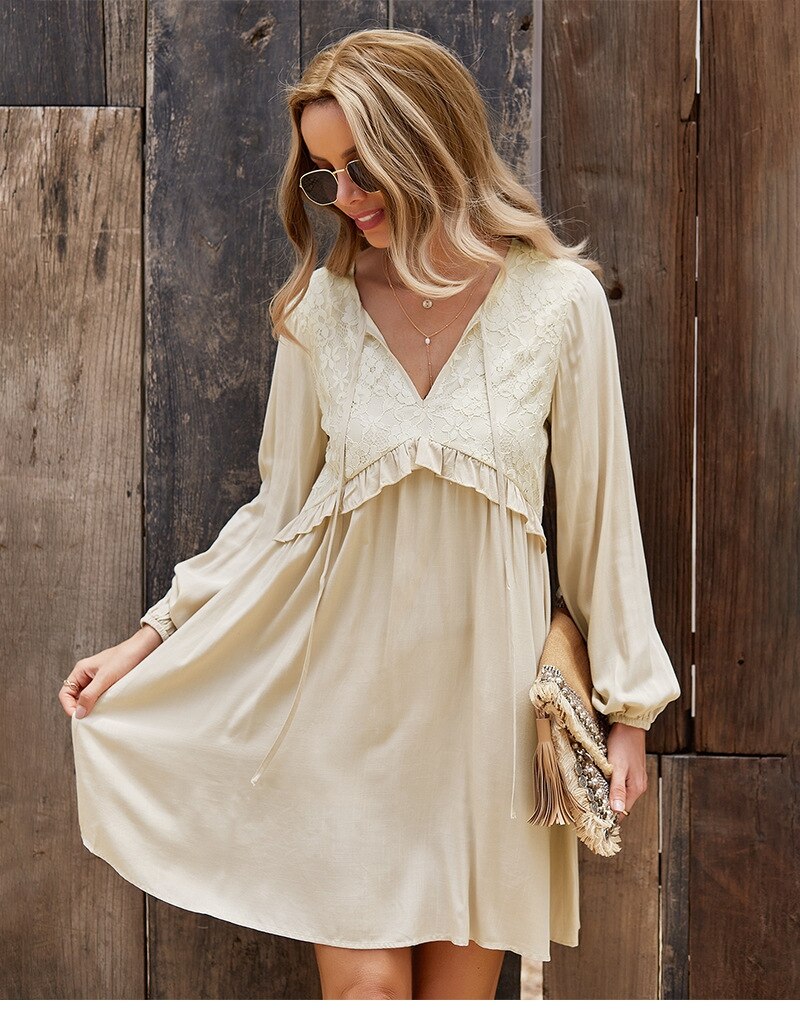 Spring Summer Fashion Chic Womne Dress Ruffles V Neck Long Sleeve High Waist Solid Ladies Dress