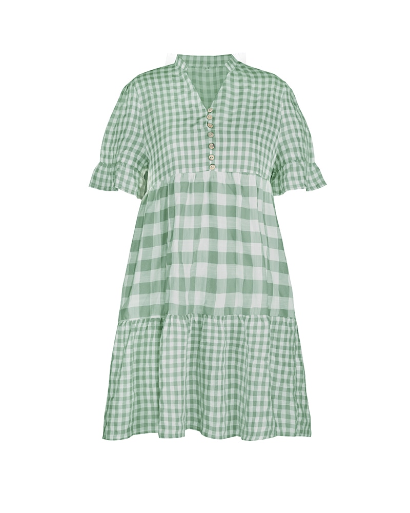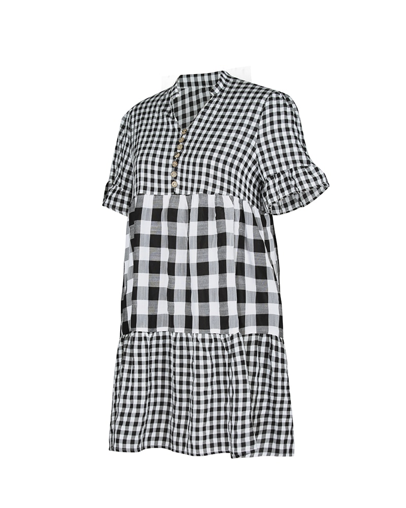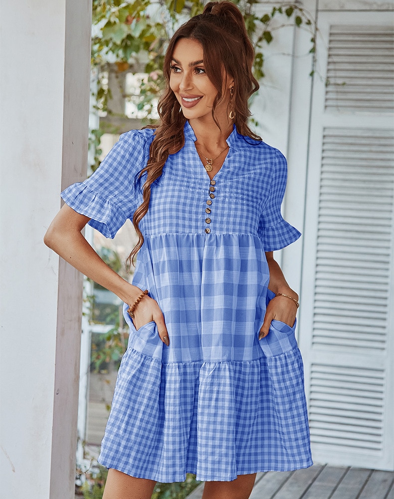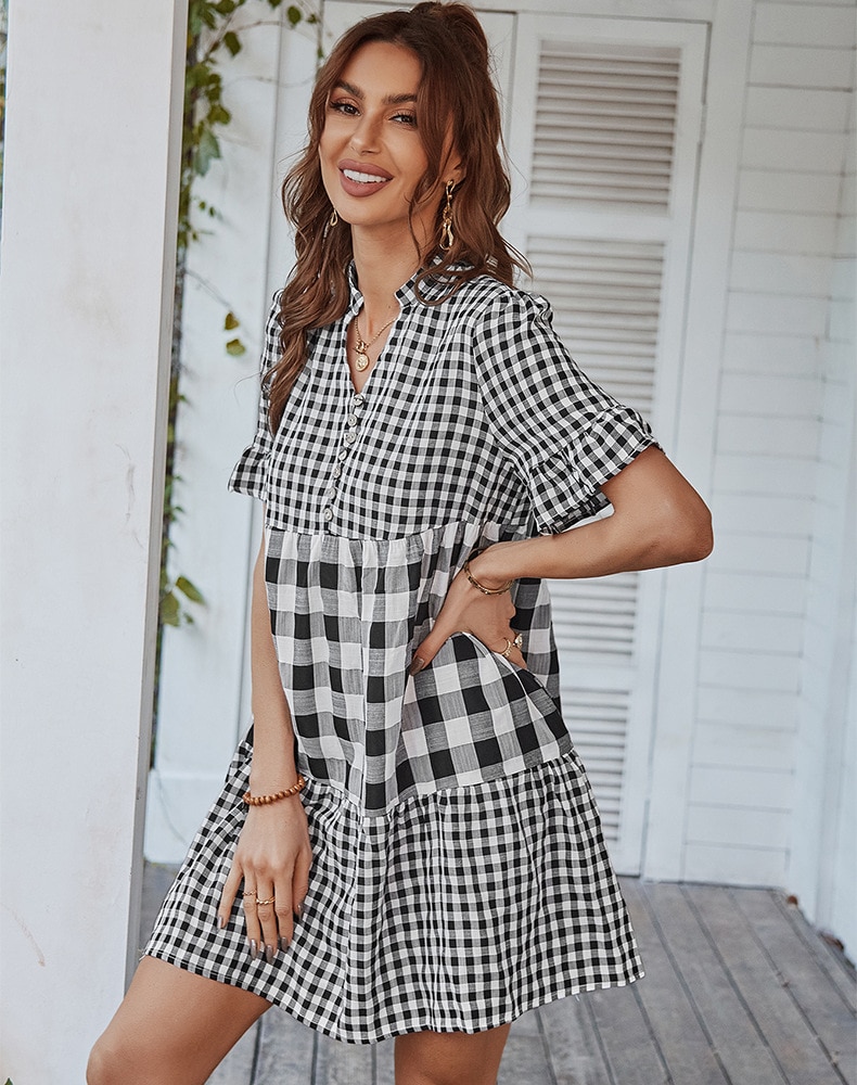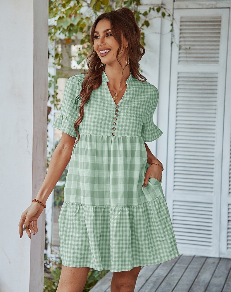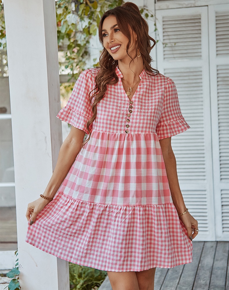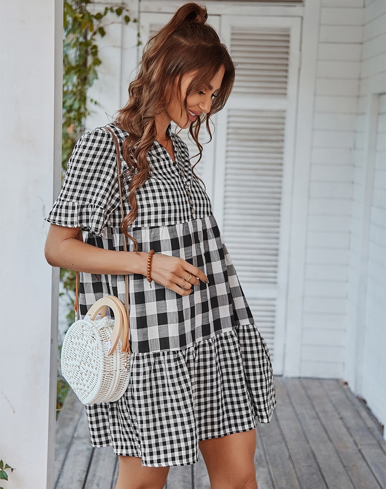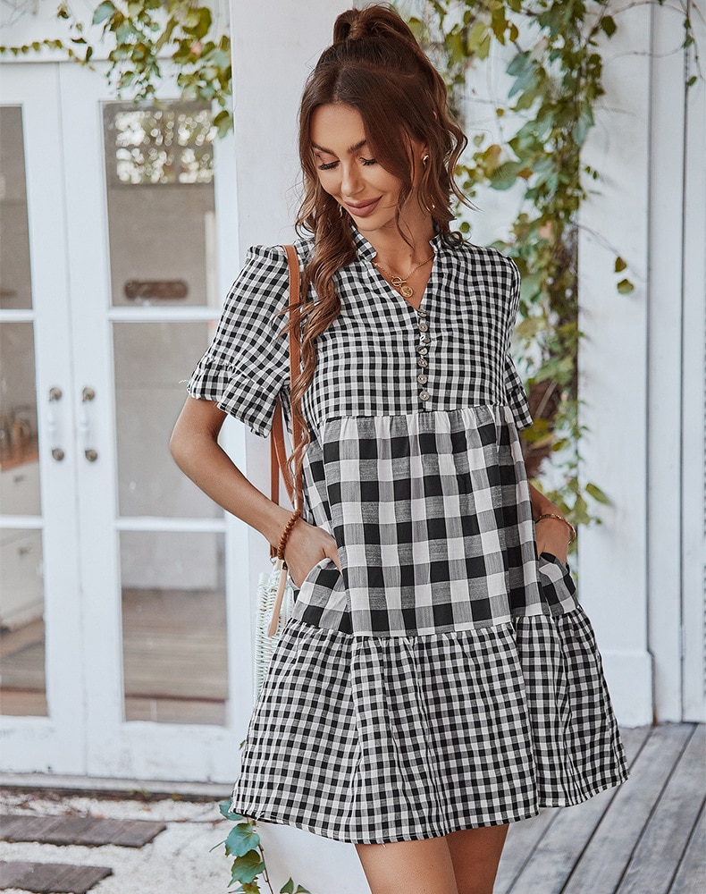 Spring Summer Loose Short Plaid Dress Women Casual Button V-Neck Temperament Patchwork Short Sleeve Mini Dress