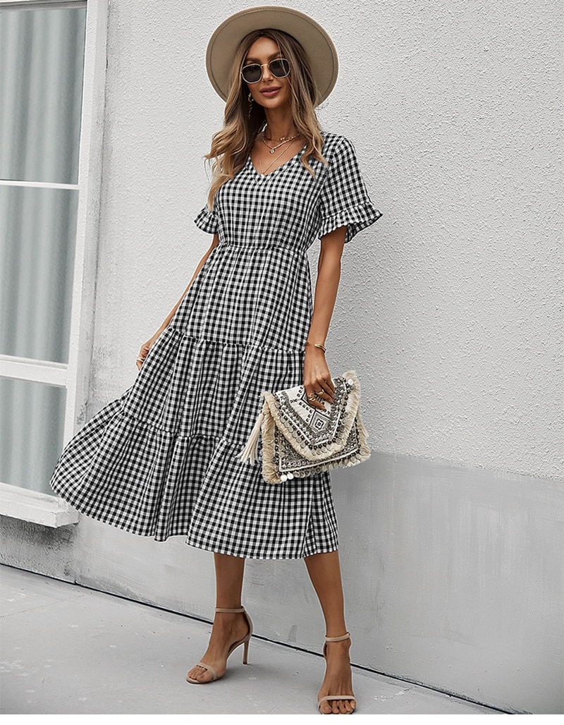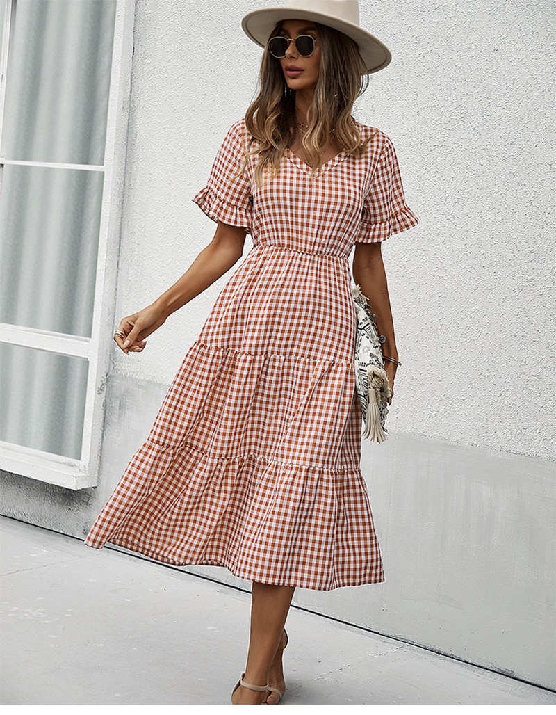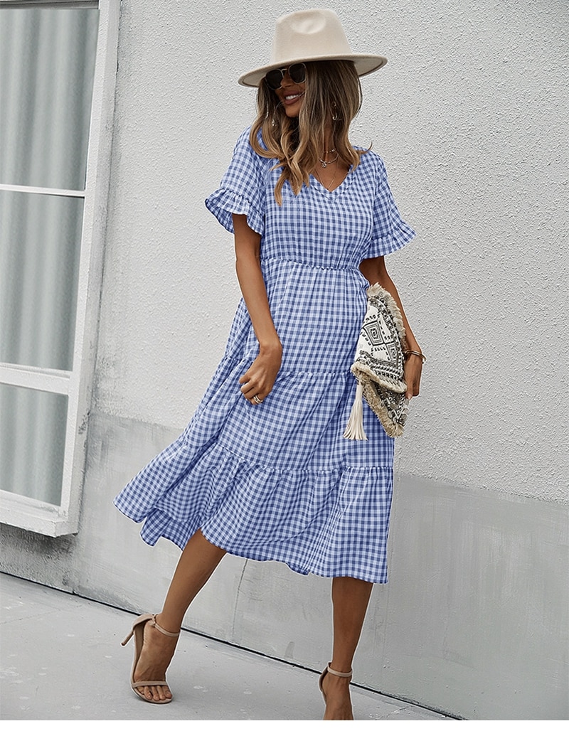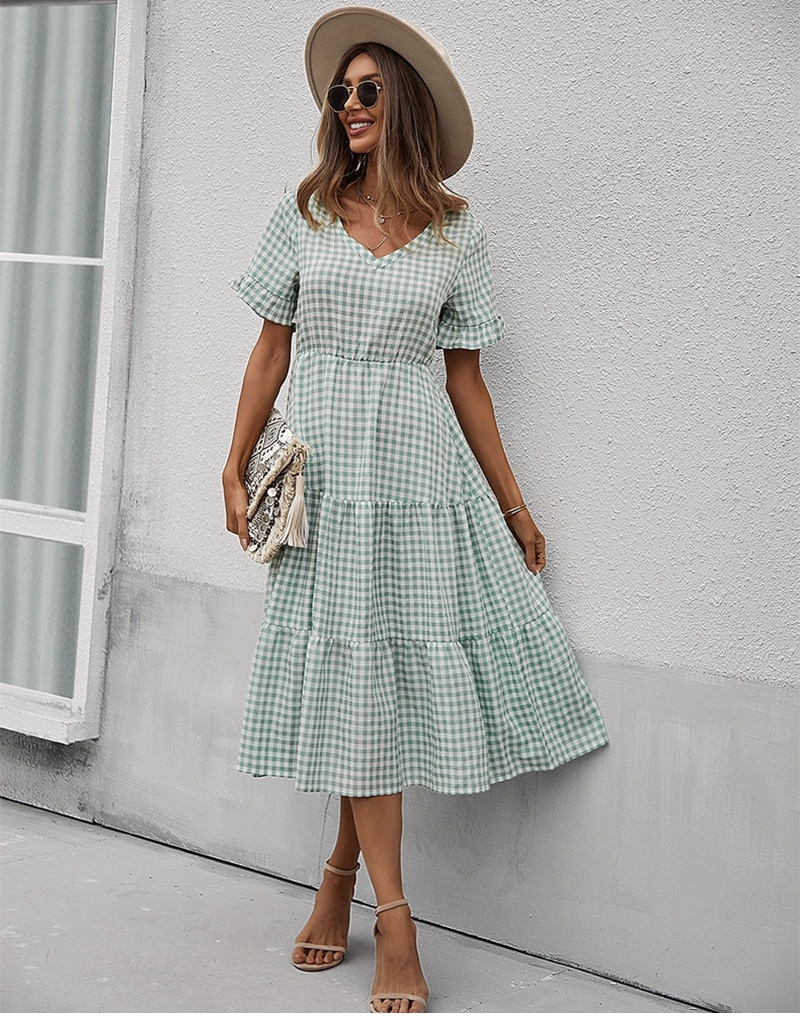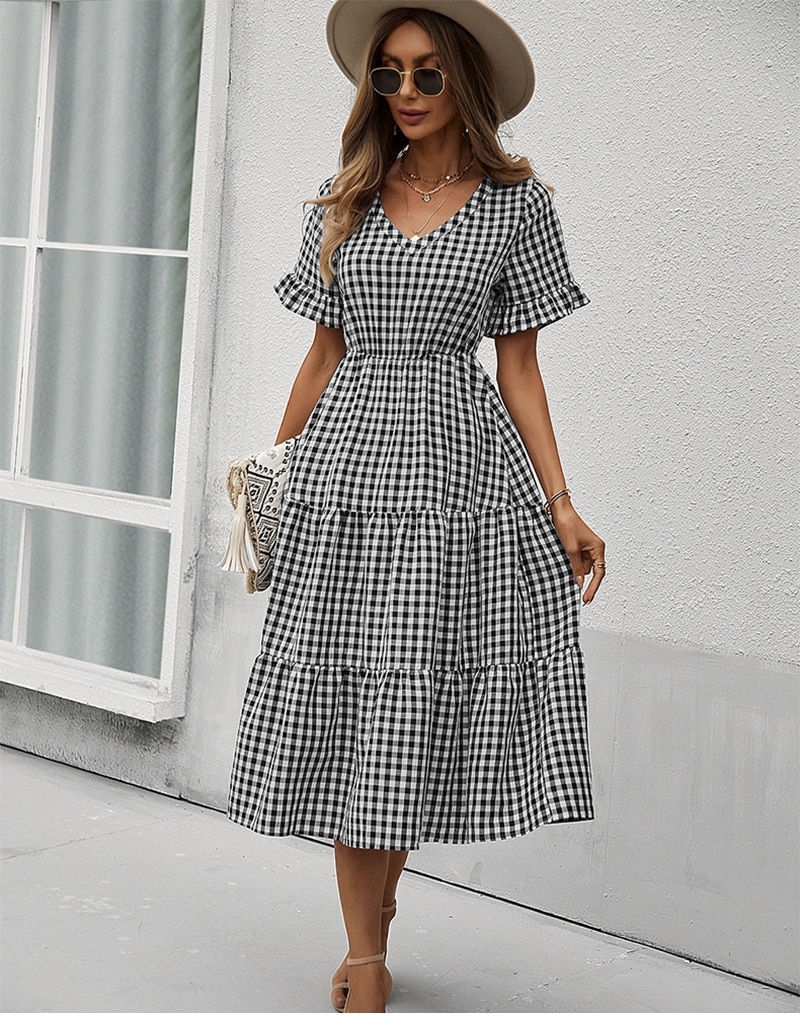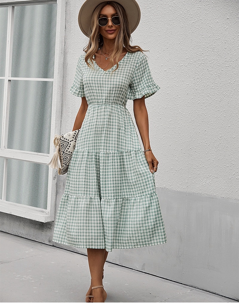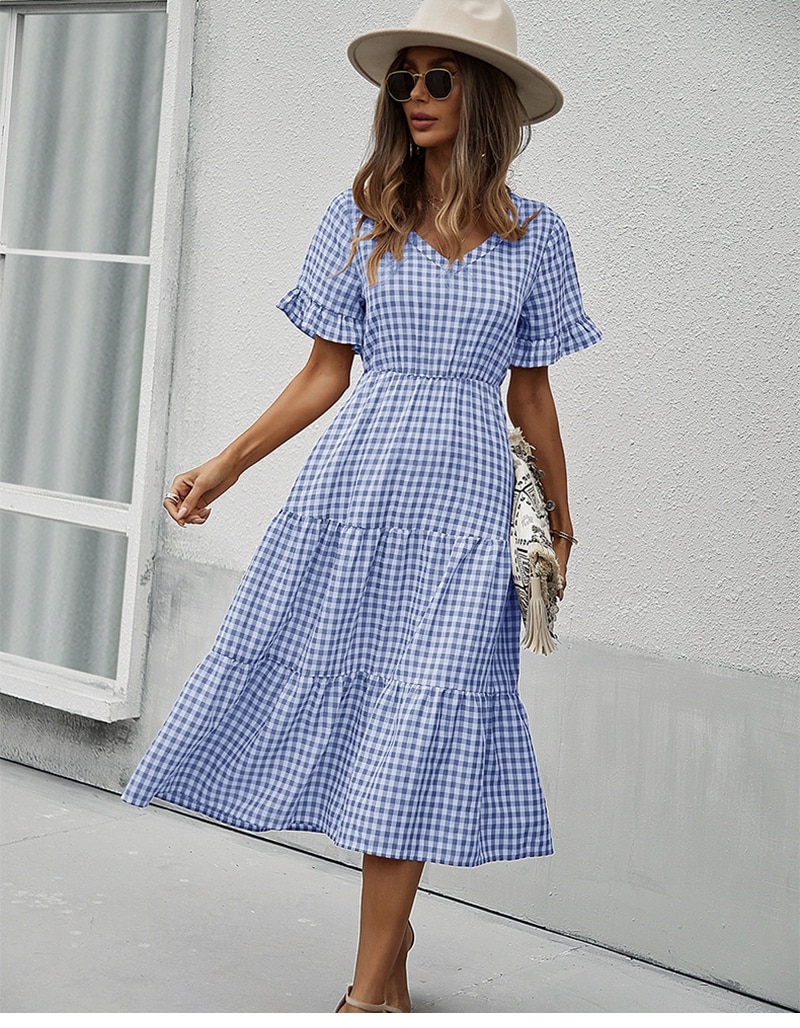 Spring Summer Plaid Casual Long Dress Women V Neck Slim High Waist Ladies A Line Party Maxi Dress