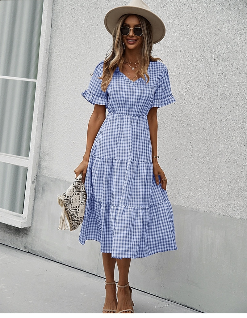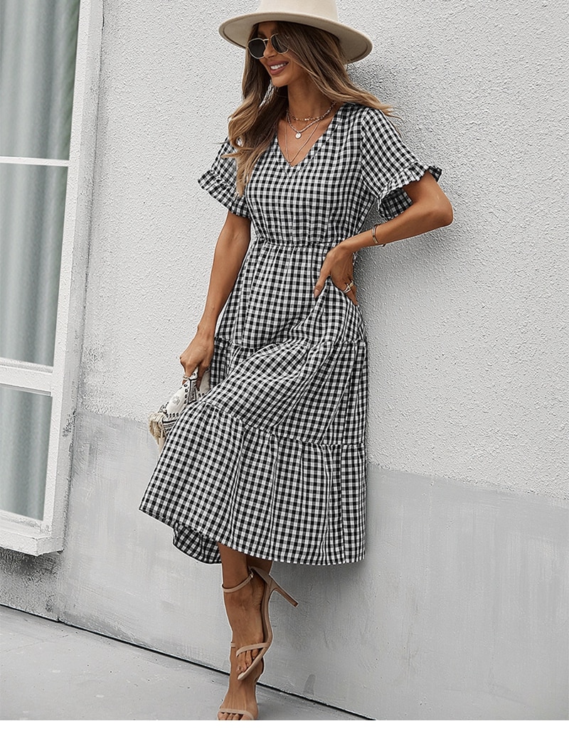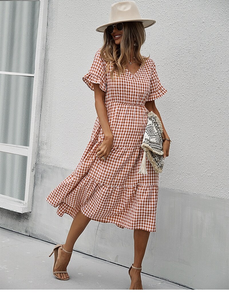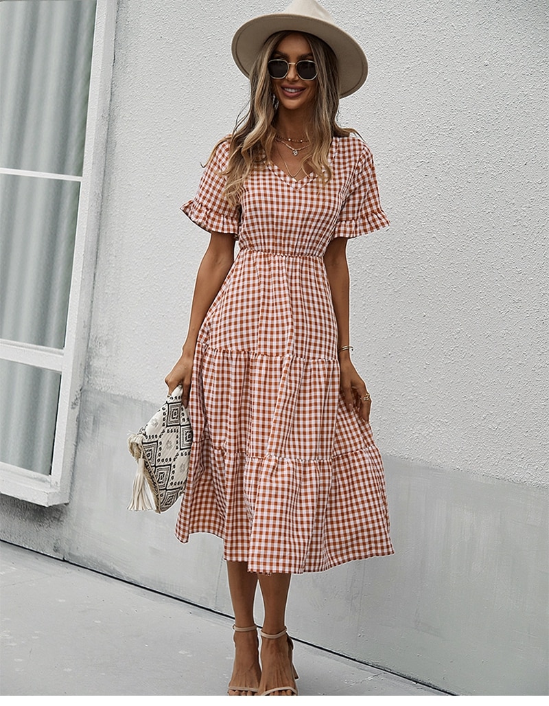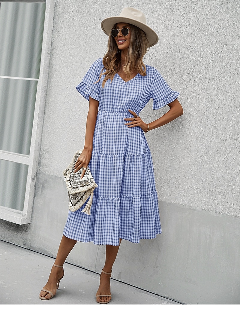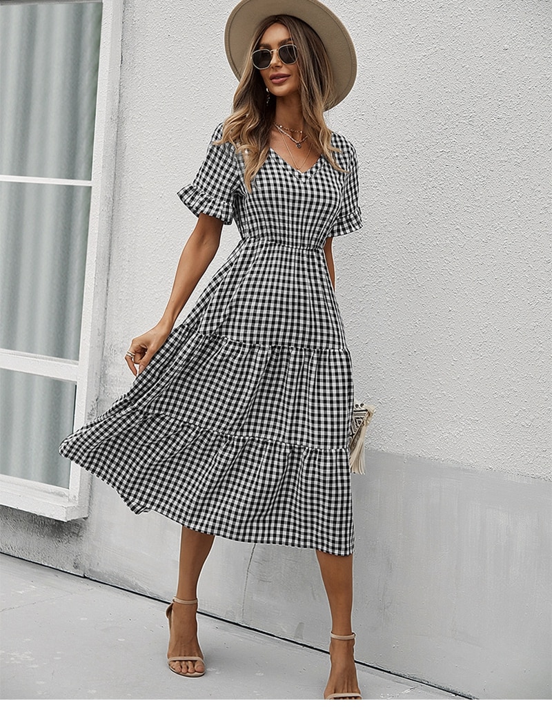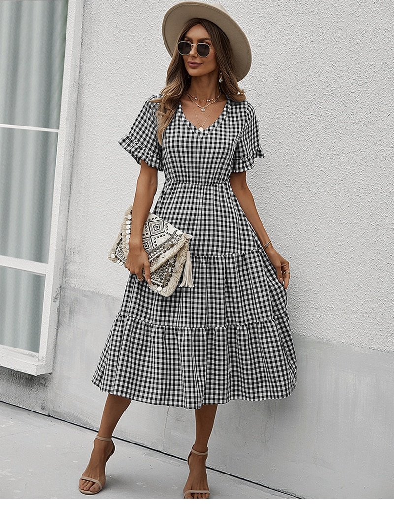 Spring Summer Plaid Casual Long Dress Women V Neck Slim High Waist Ladies A Line Party Maxi Dress