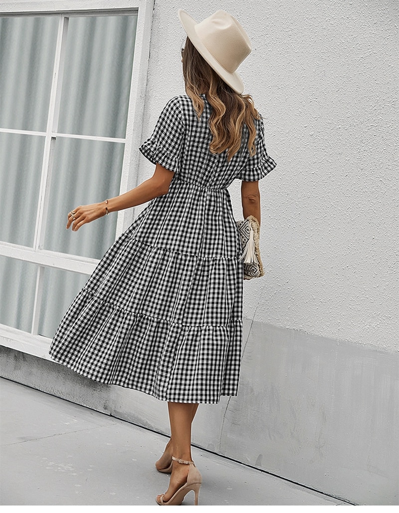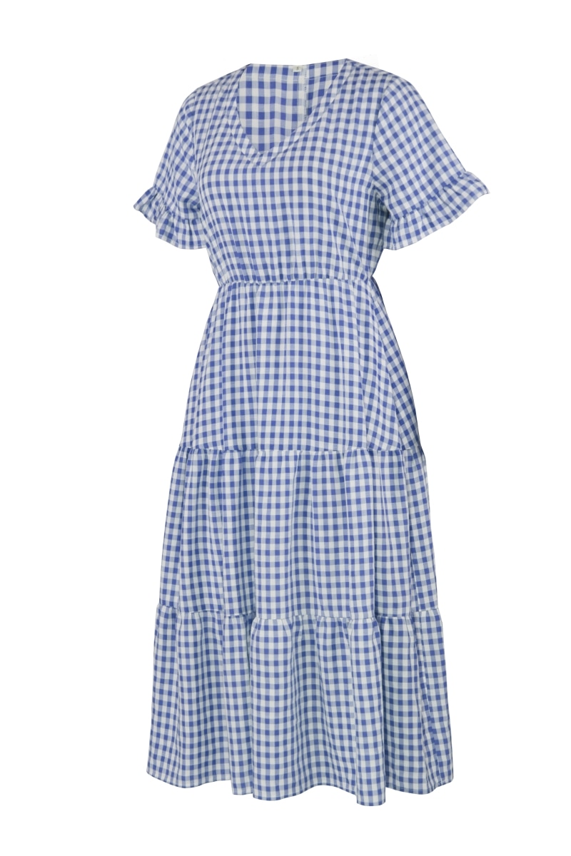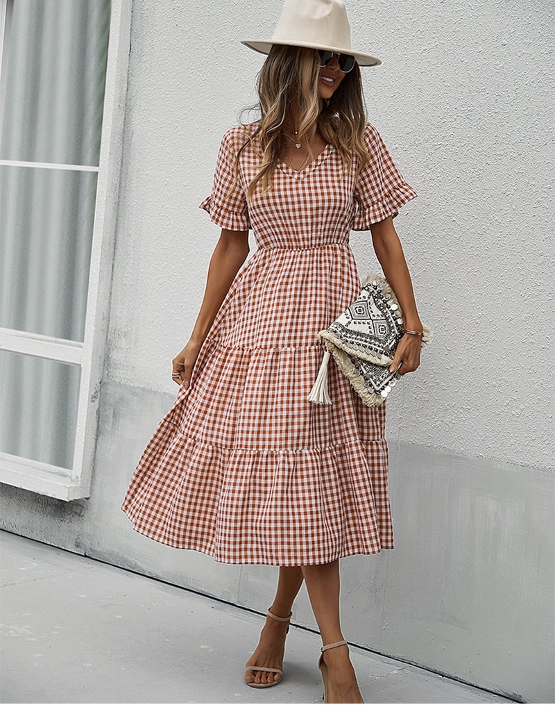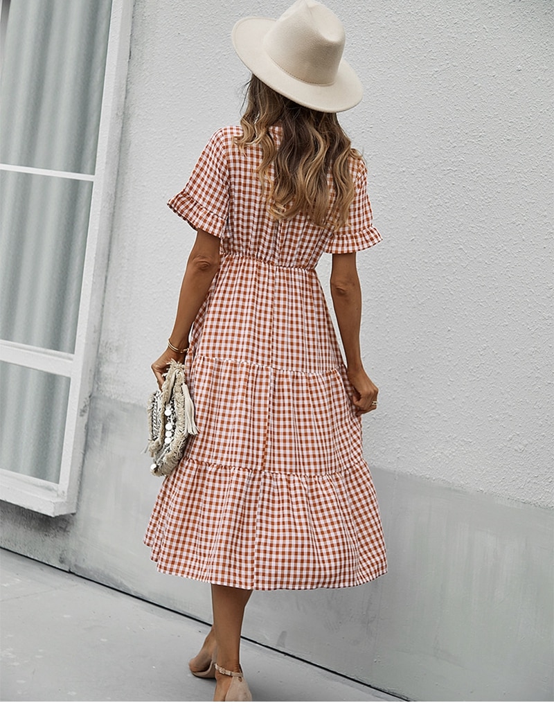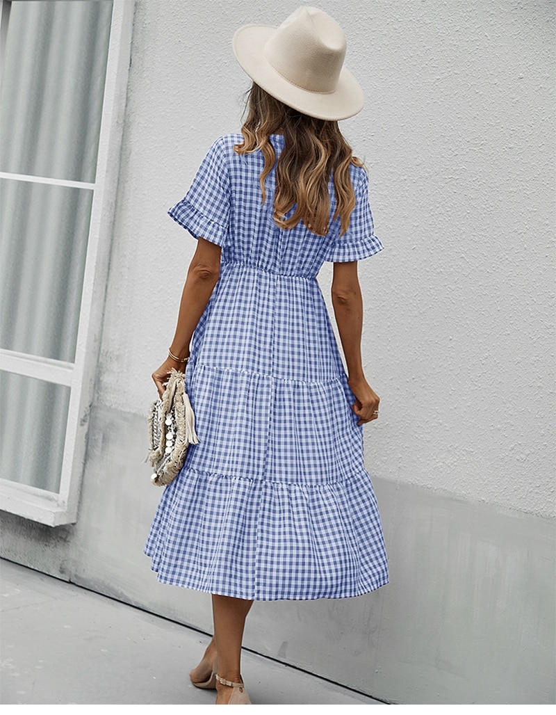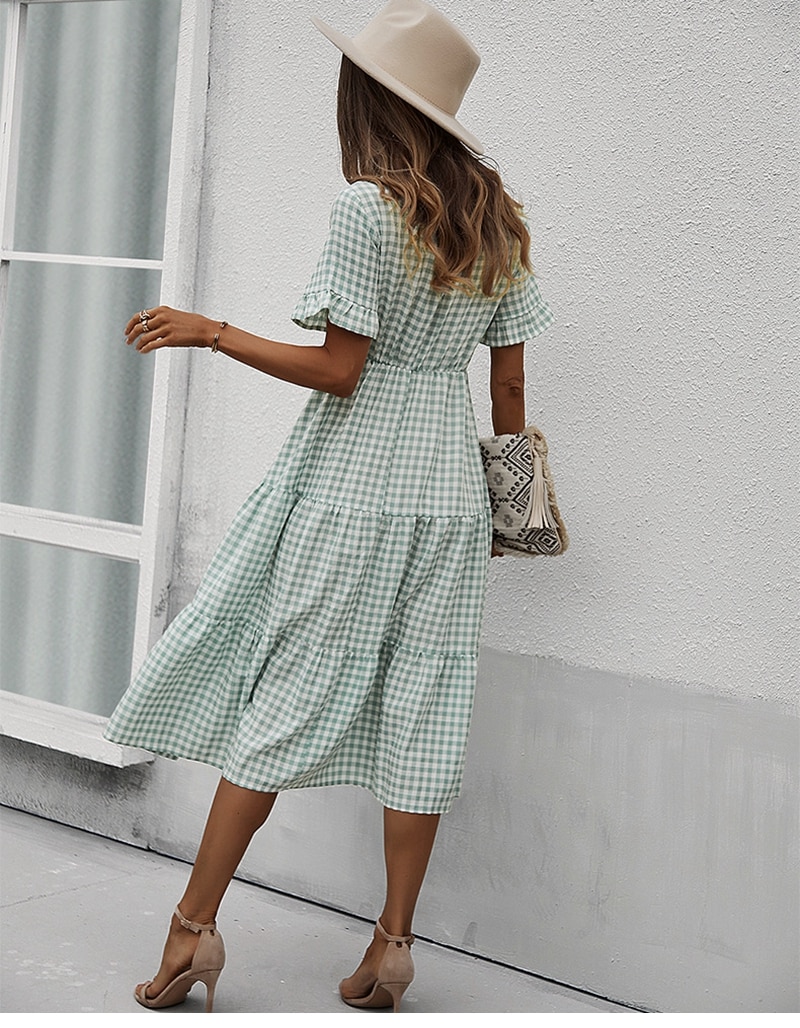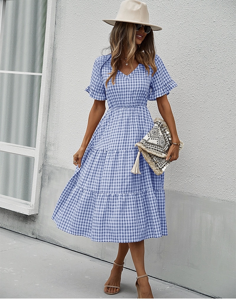 Spring Summer Plaid Casual Long Dress Women V Neck Slim High Waist Ladies A Line Party Maxi Dress