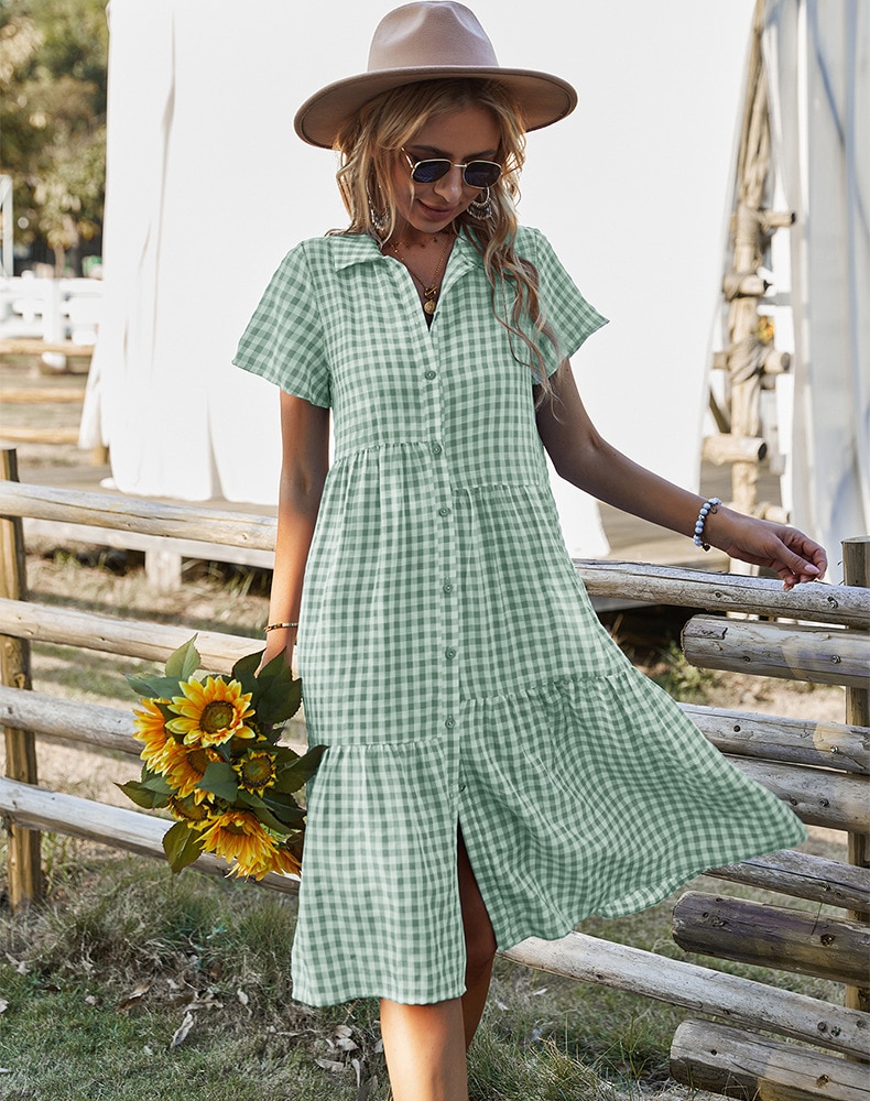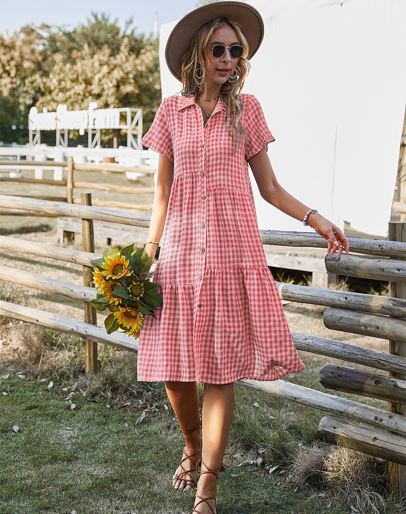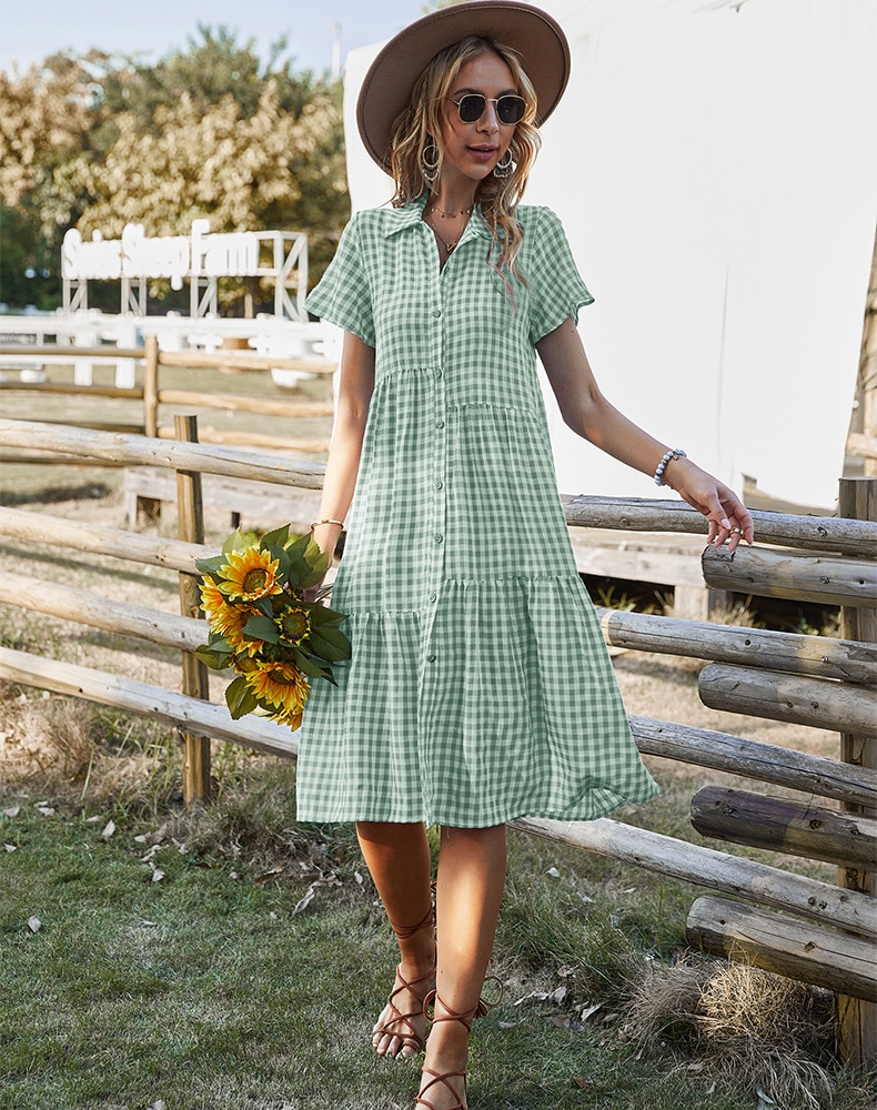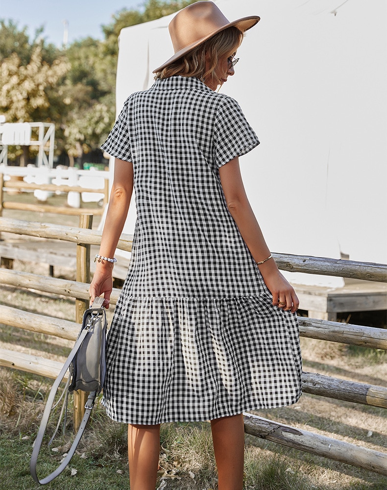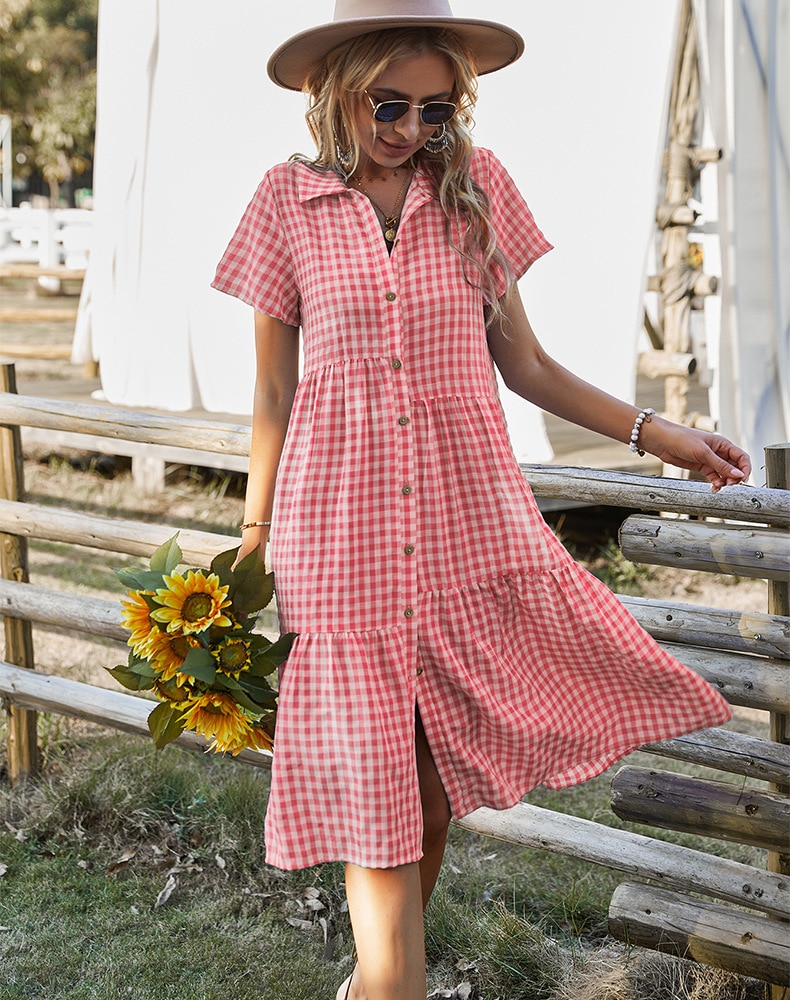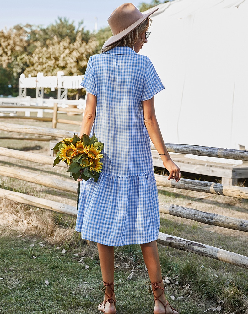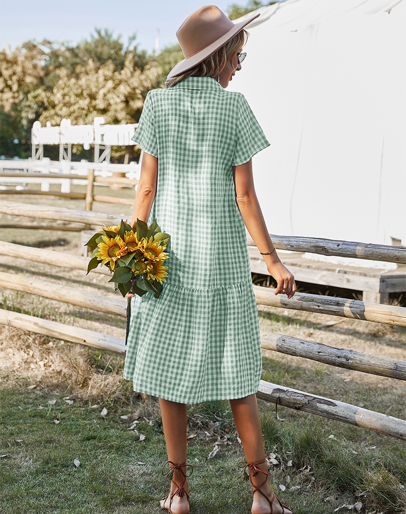 Spring Summer Plaid Shirt Dress Women Casual Short Sleeve High Waist Loose Dresses For Ladies Leisure Medium Long Dress