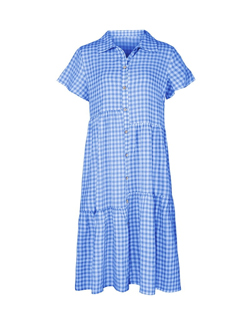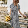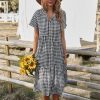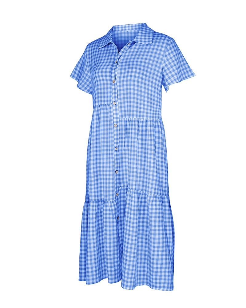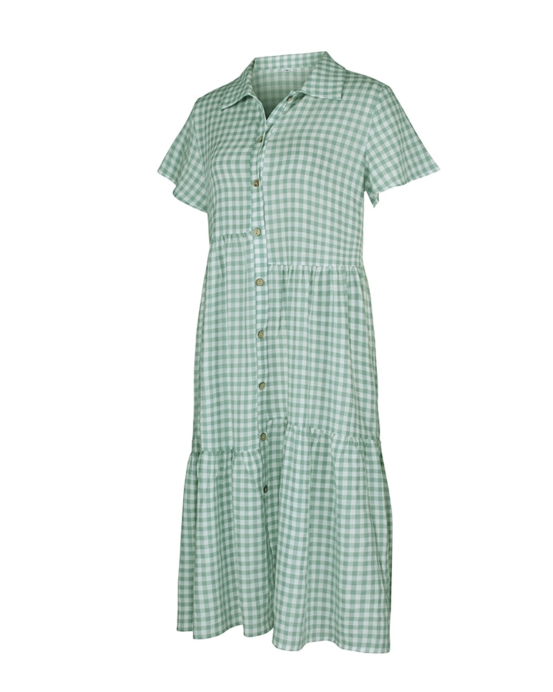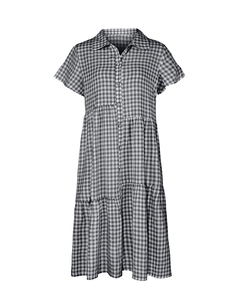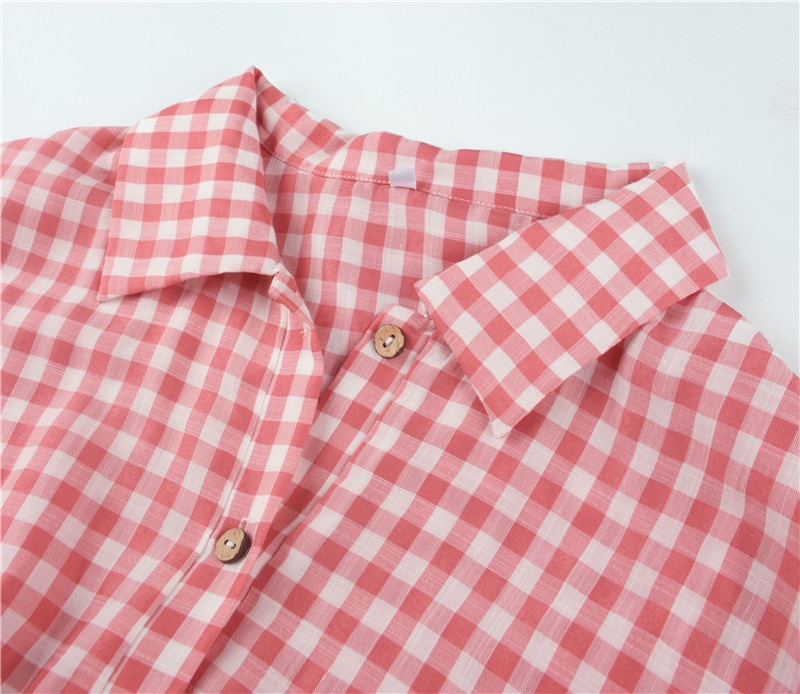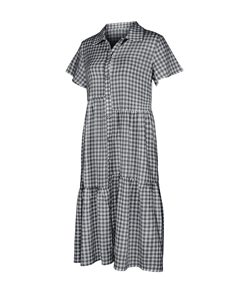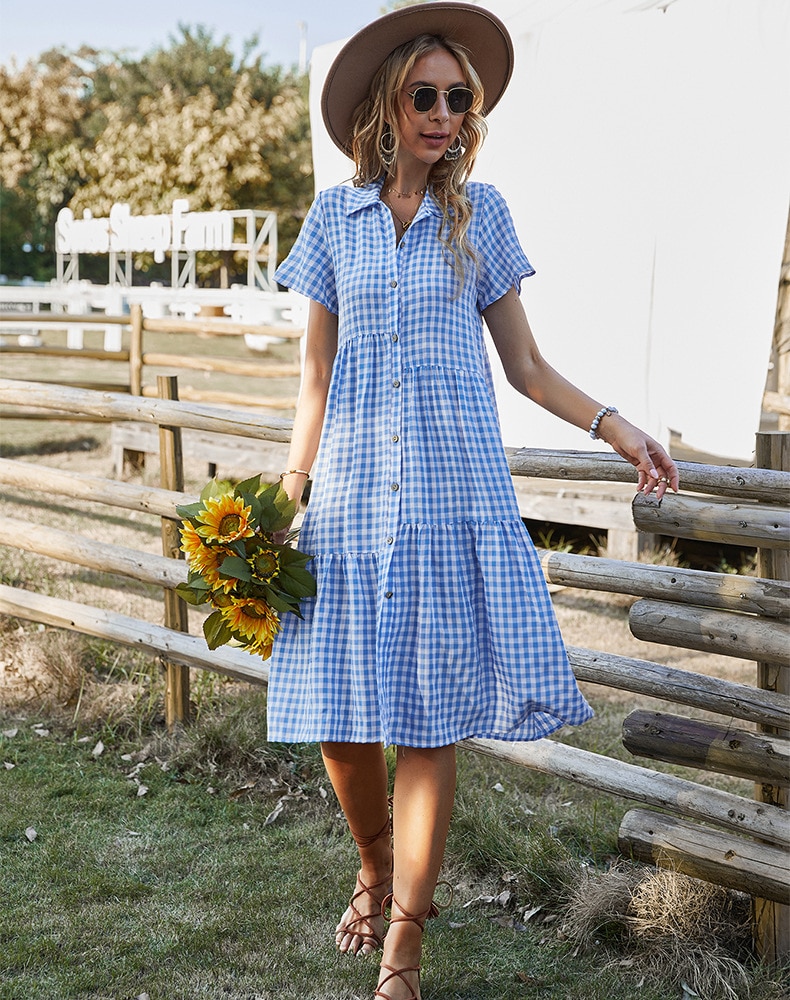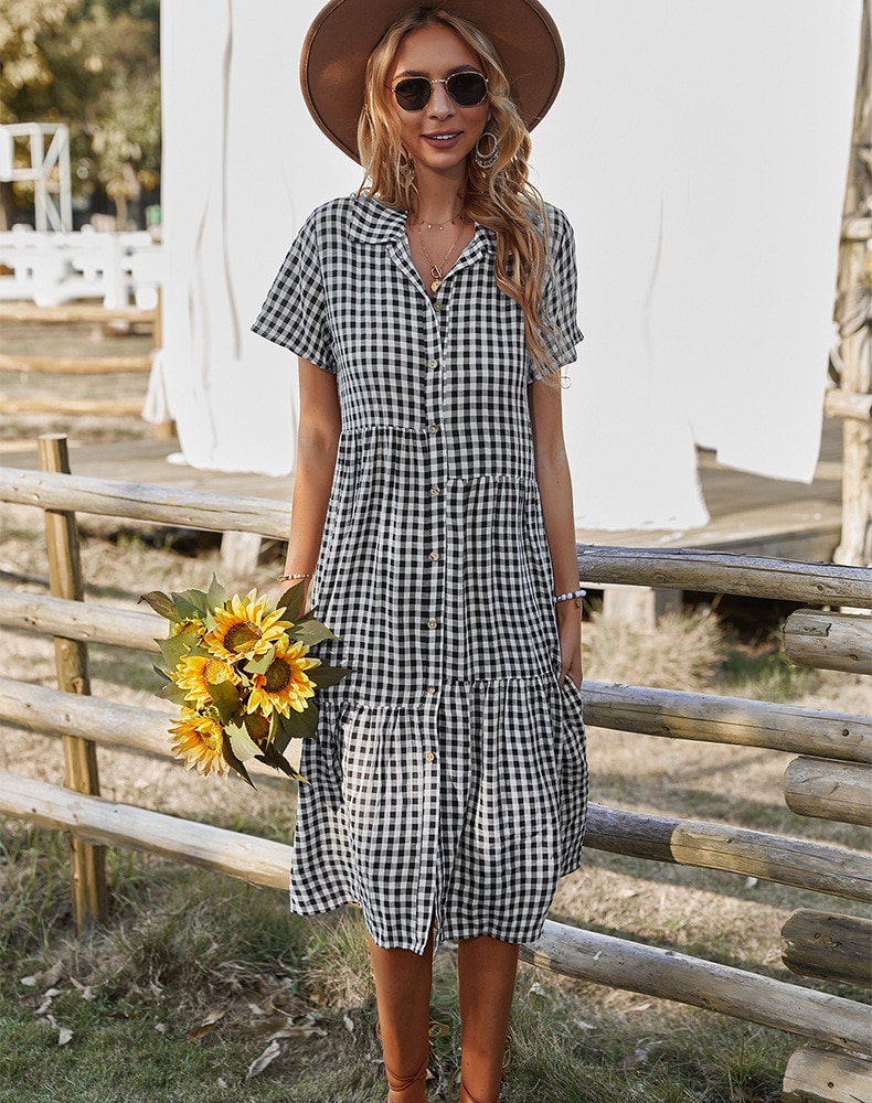 Spring Summer Plaid Shirt Dress Women Casual Short Sleeve High Waist Loose Dresses For Ladies Leisure Medium Long Dress