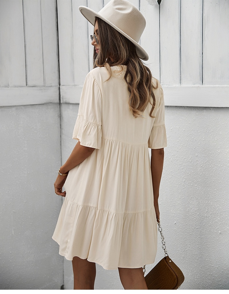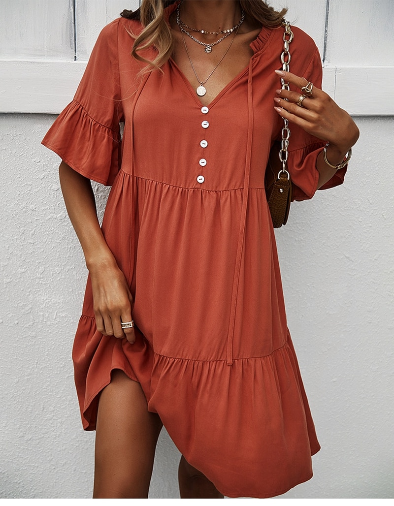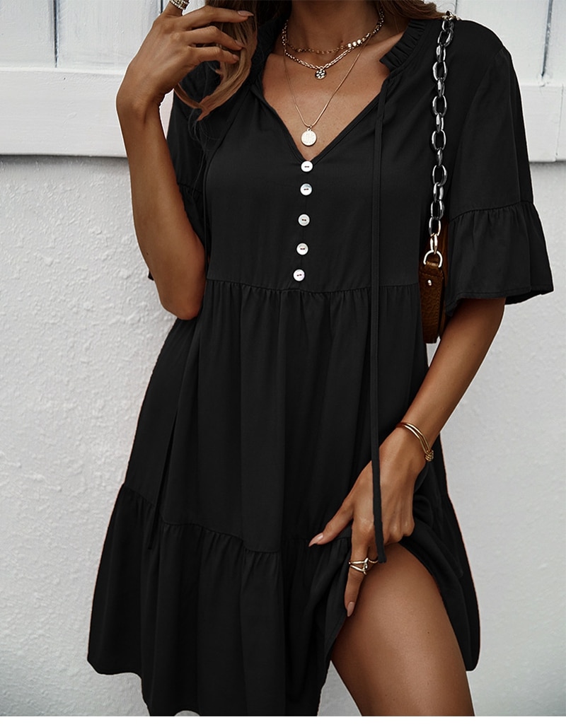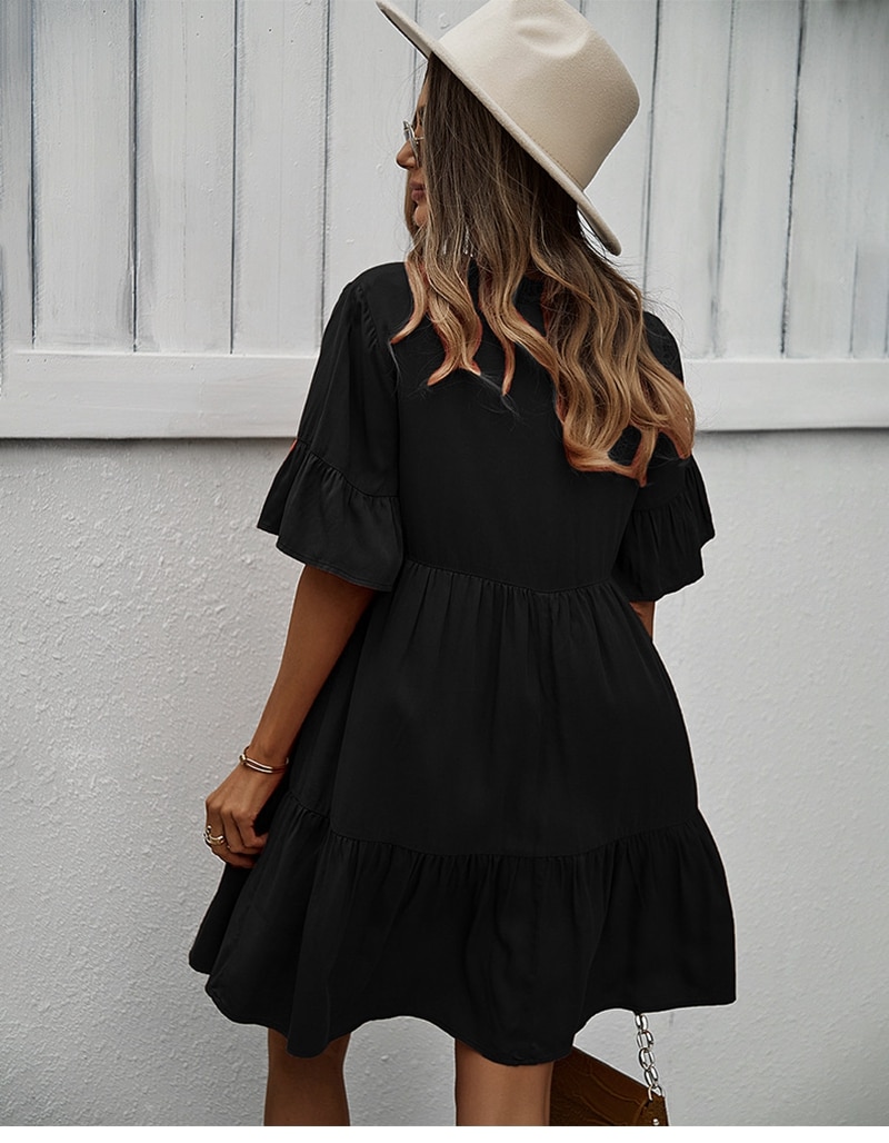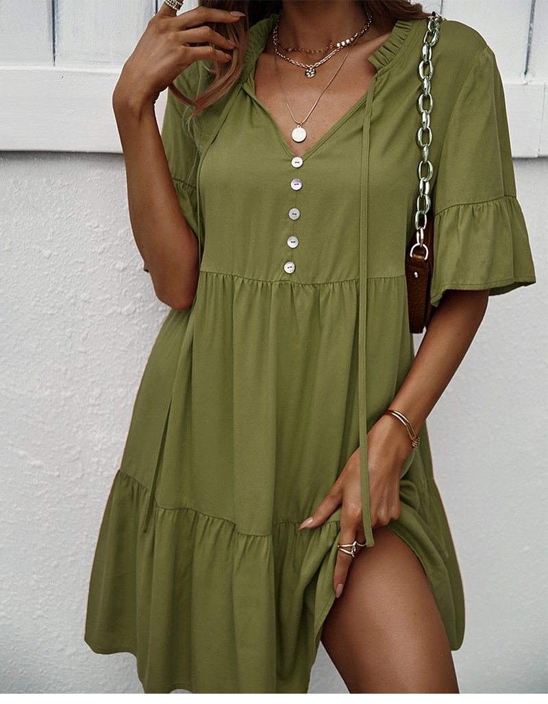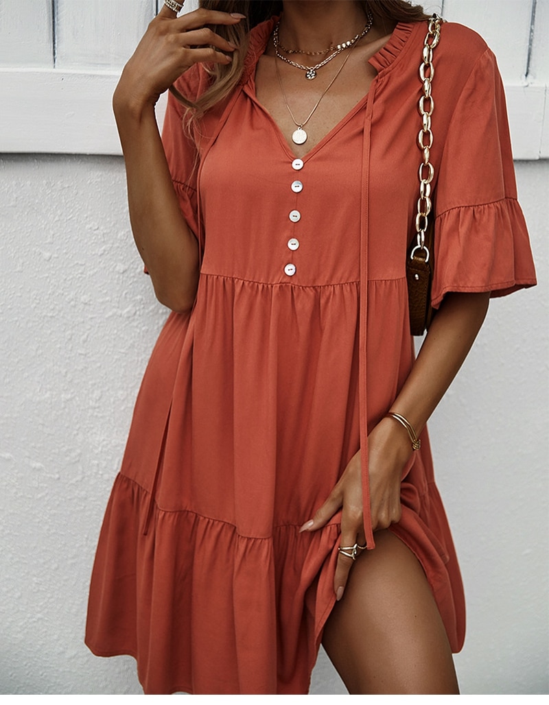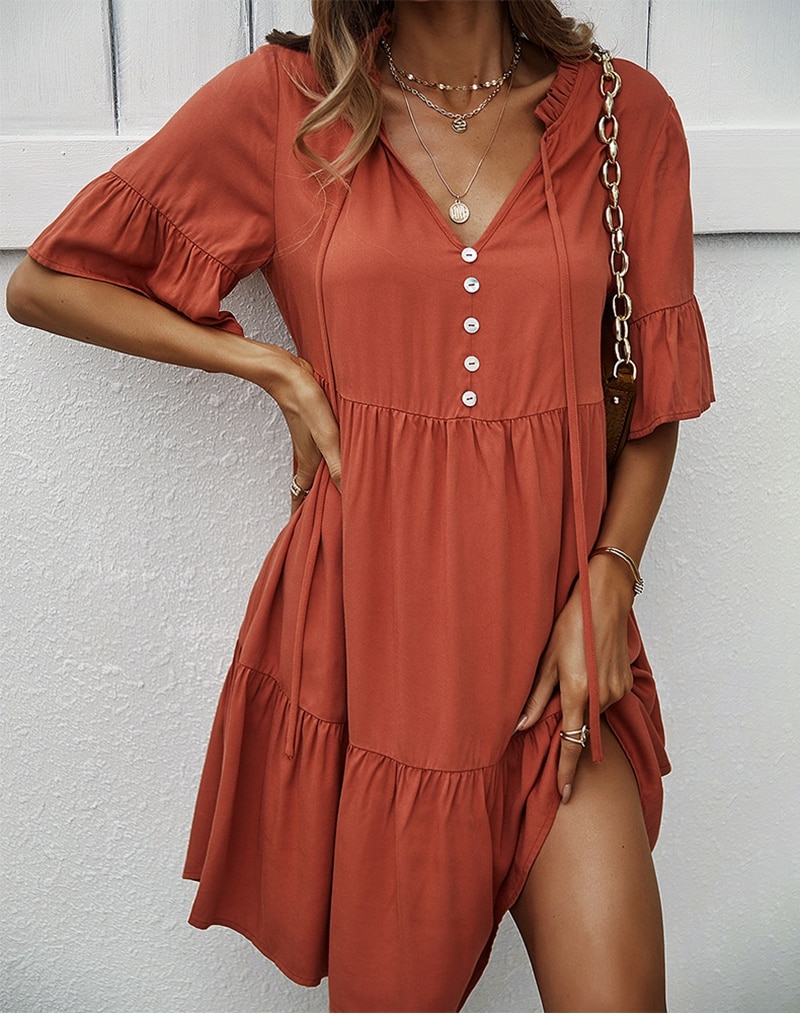 Spring Summer Solid Short Dress Women Casual Single Breasted Half Sleeve Ladies Temperament High Wasit Party Dresses New