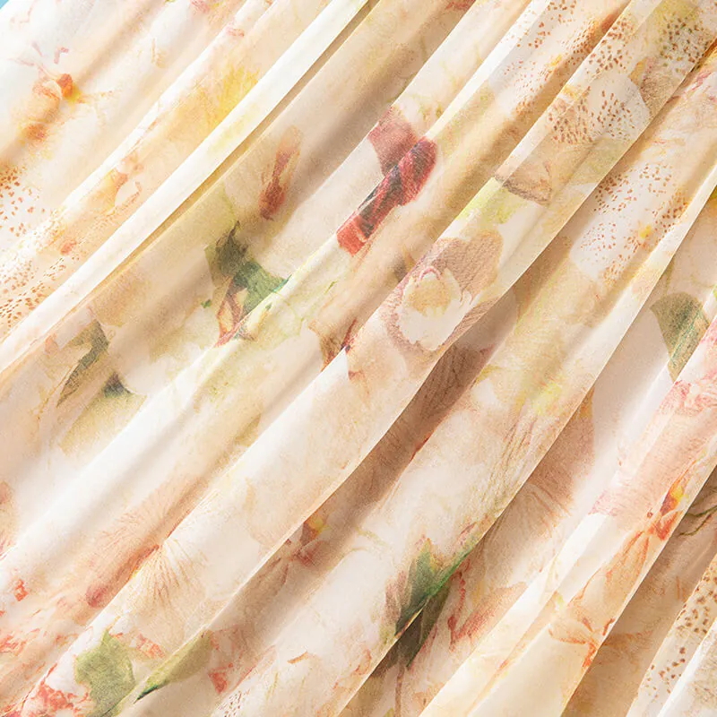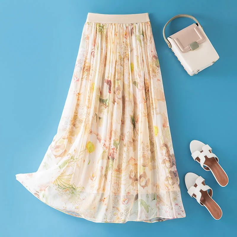 Summer Beige Floral Silk Midi Skirt Elastic Waist Flowy Elegant