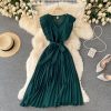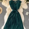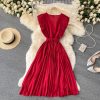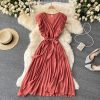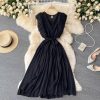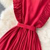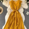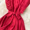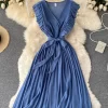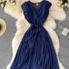 Designed with a flattering V-neck and graceful butterfly sleeves, this mid-calf length dress boasts a gentle A-line silhouette, enhancing your natural beauty with a touch of vintage-inspired style. The delicate ruffles and solid pattern accentuate its feminine allure, adding a subtle yet enchanting detail to your ensemble.