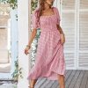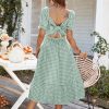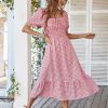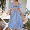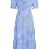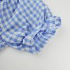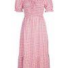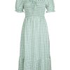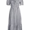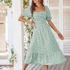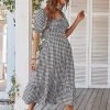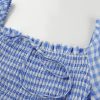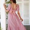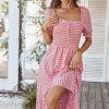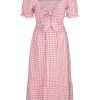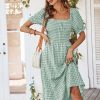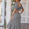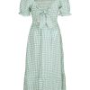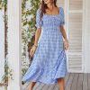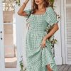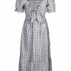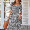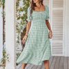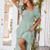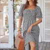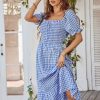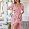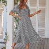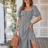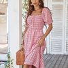Summer Fashion Plaid French Square Neck Short Sleeve Waist Lace Up Causal All Match Chic Dress