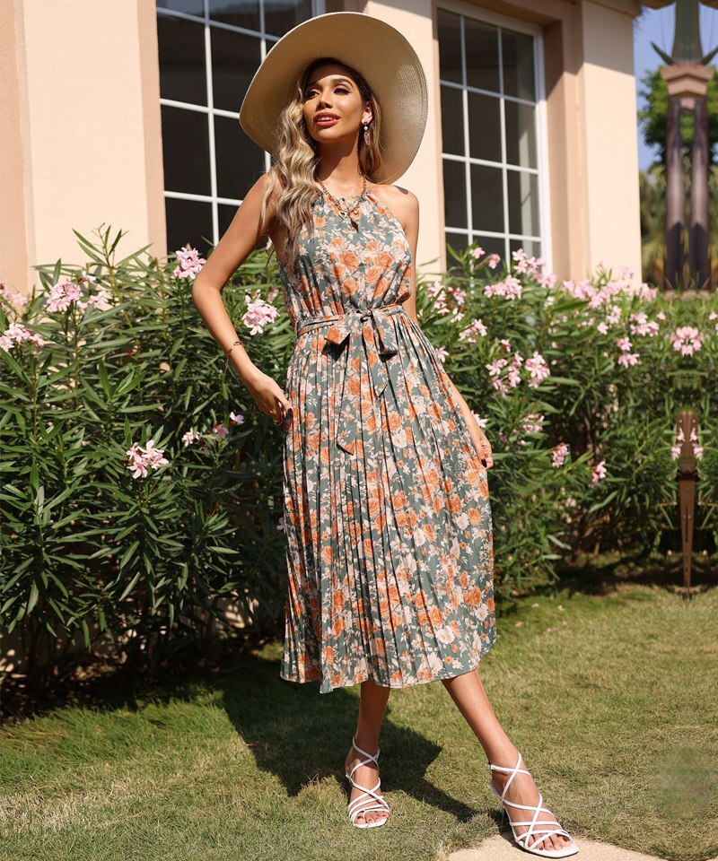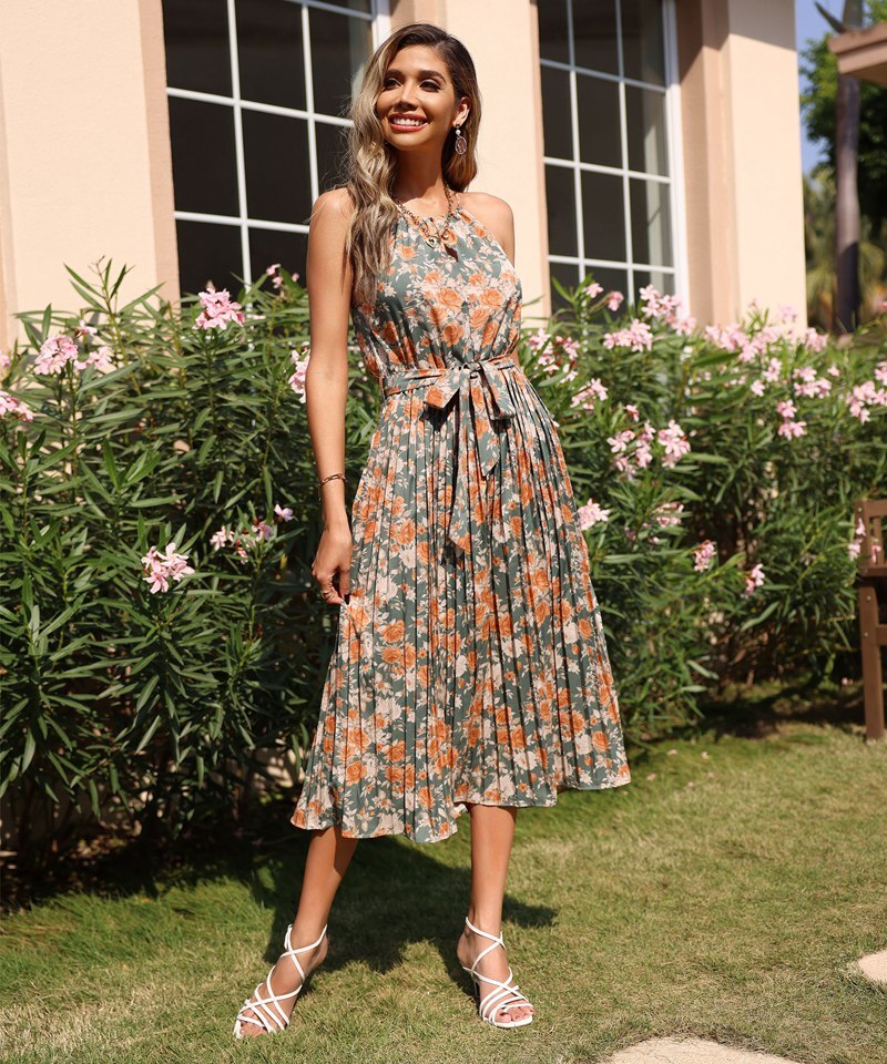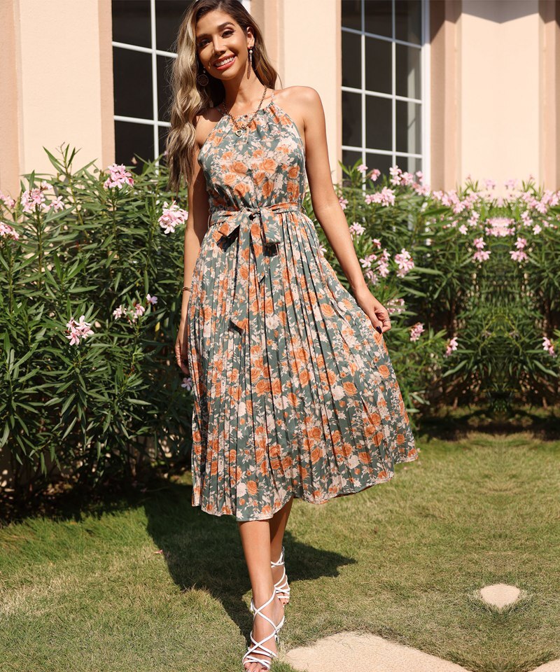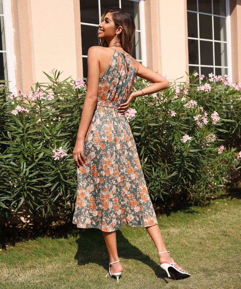 Summer Halter Neck Sleeveless Small Floral Sling Dress Lace High Waist Green Long Chic Dress