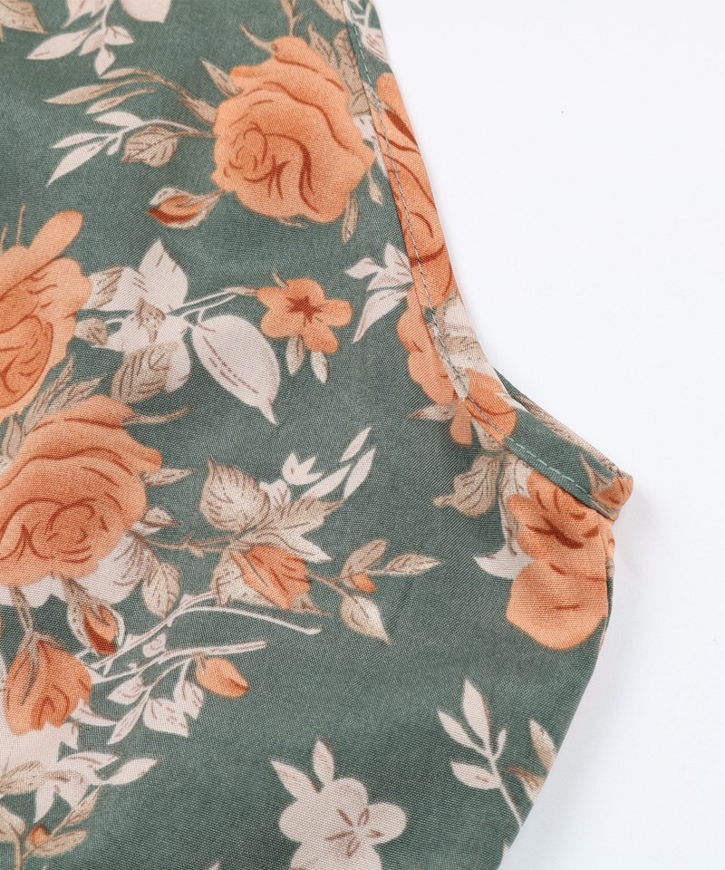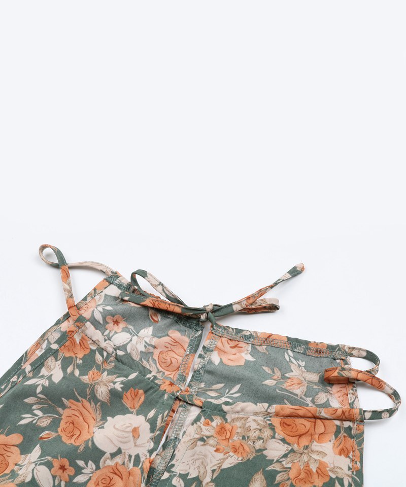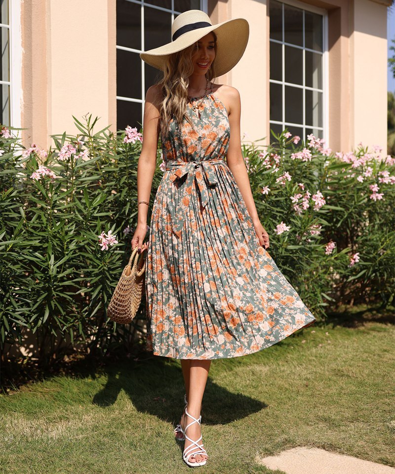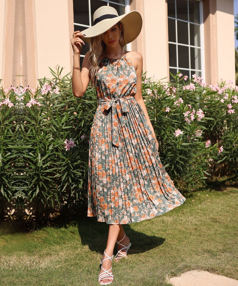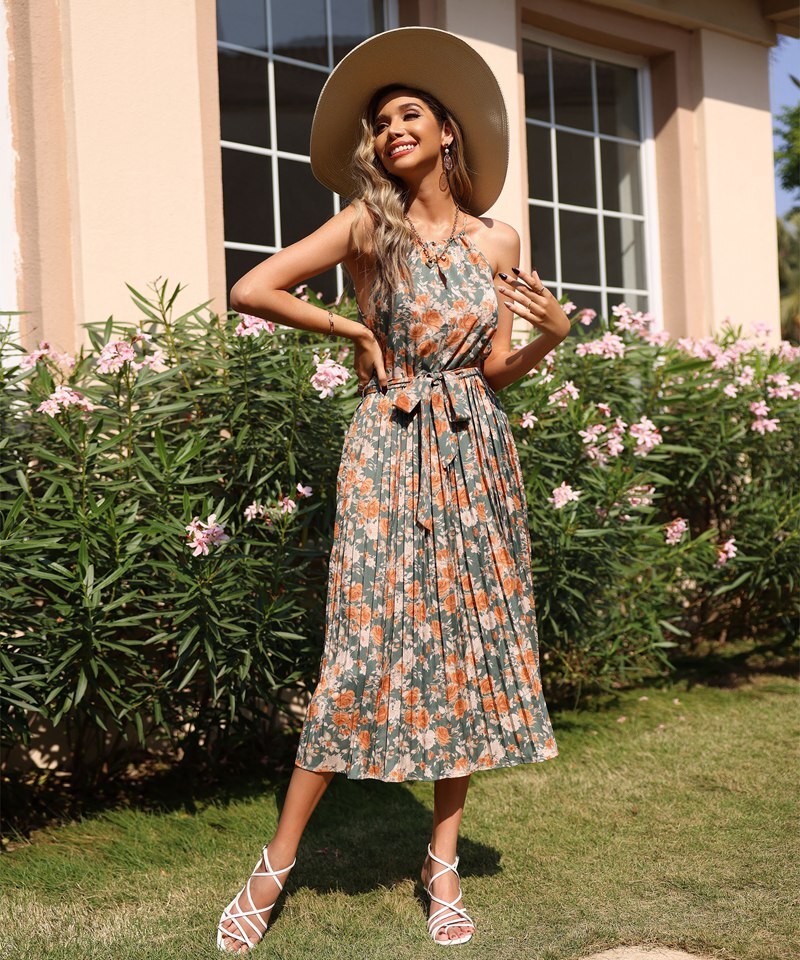 Summer Halter Neck Sleeveless Small Floral Sling Dress Lace High Waist Green Long Chic Dress