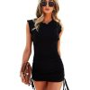 Summer Lace Up Shirring Hip Dress For Women Sexy Sleeveless O Neck Solid Ladies Short Knitted Tank Dress