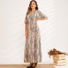 Print Loose Elastic Waist Flared Sleeves V-neck Long Sweet Big A-line Dress - Image 4