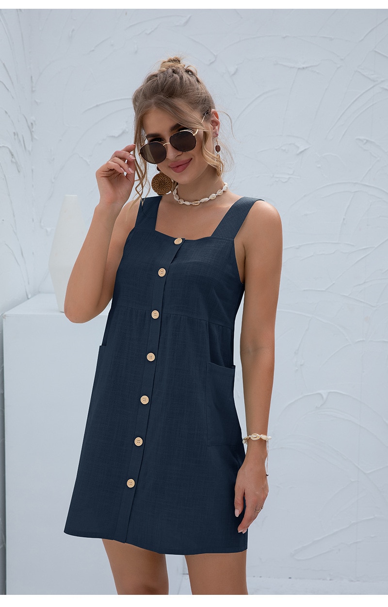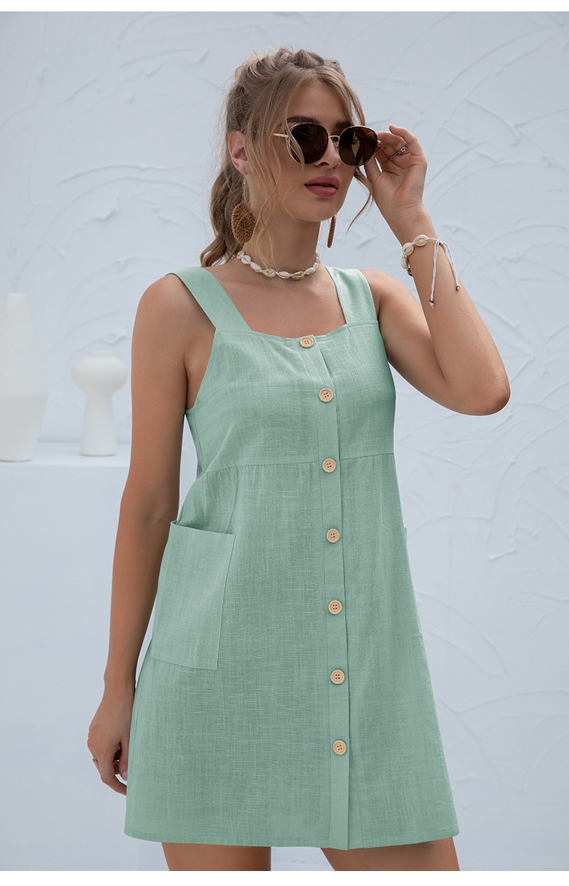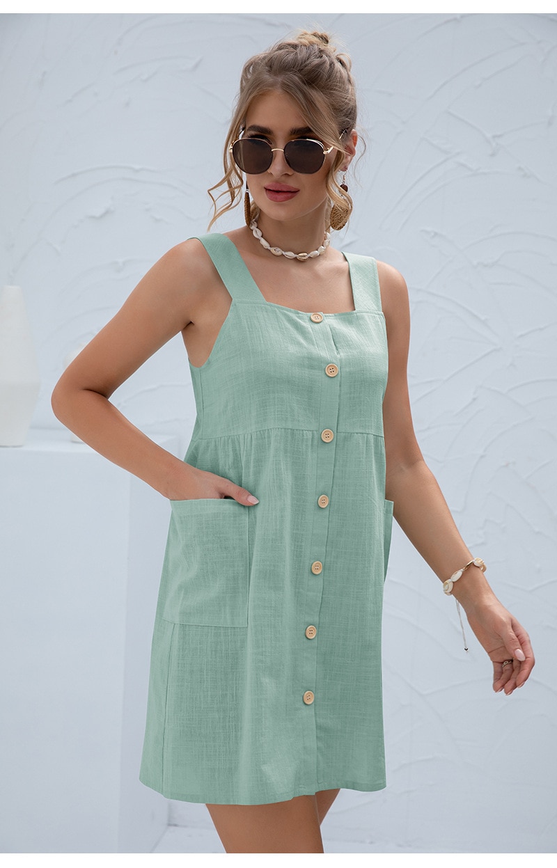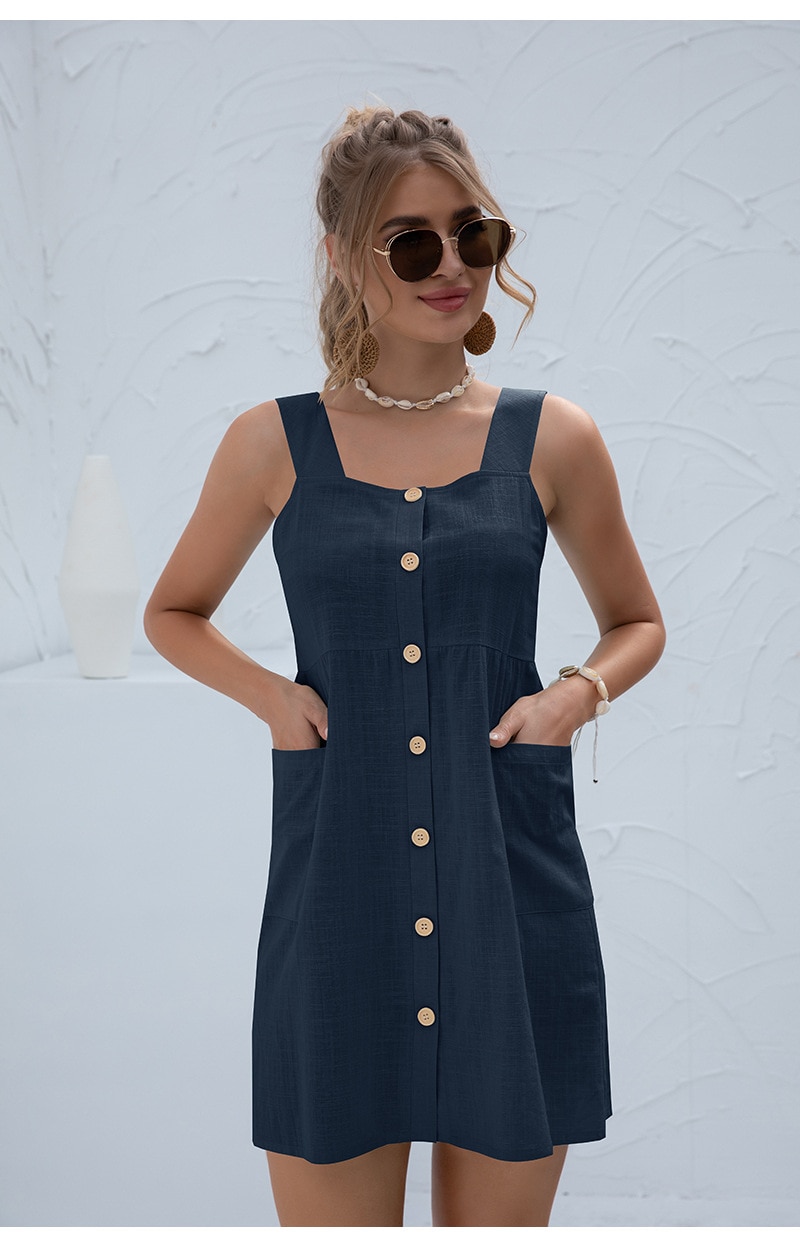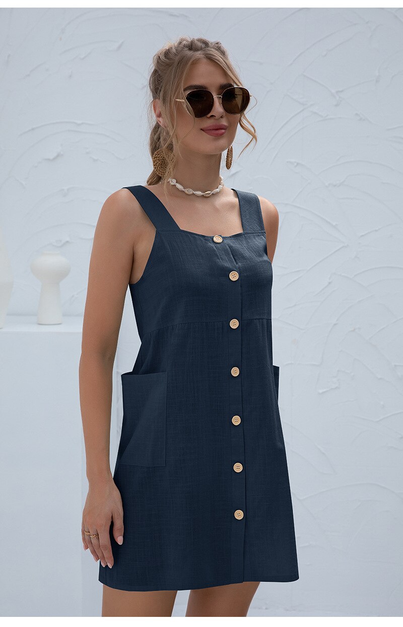 Summer Sleeveless Short Tank Dress Women Square Collar Pockets Button Vintage Mini Ladies Solid Sweet Sling Dresses