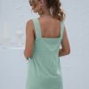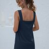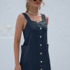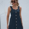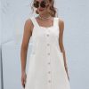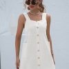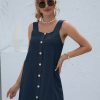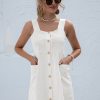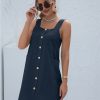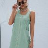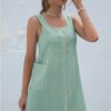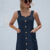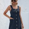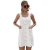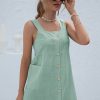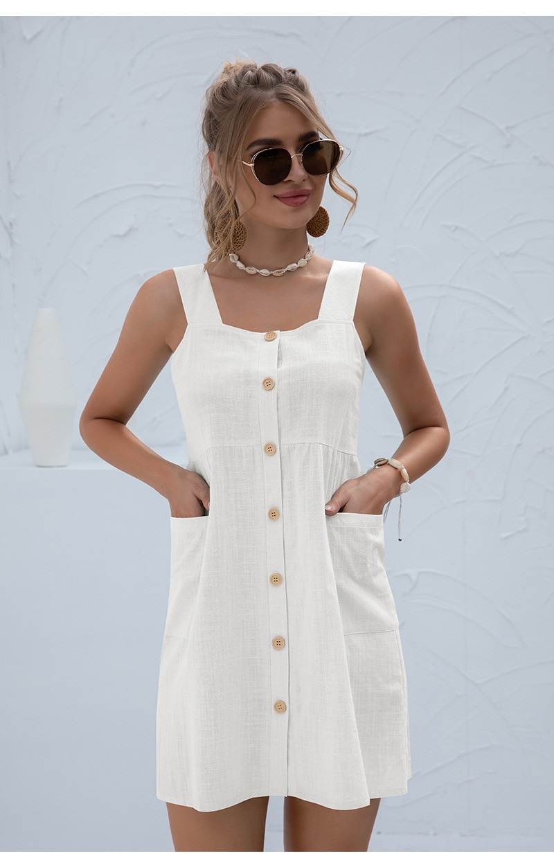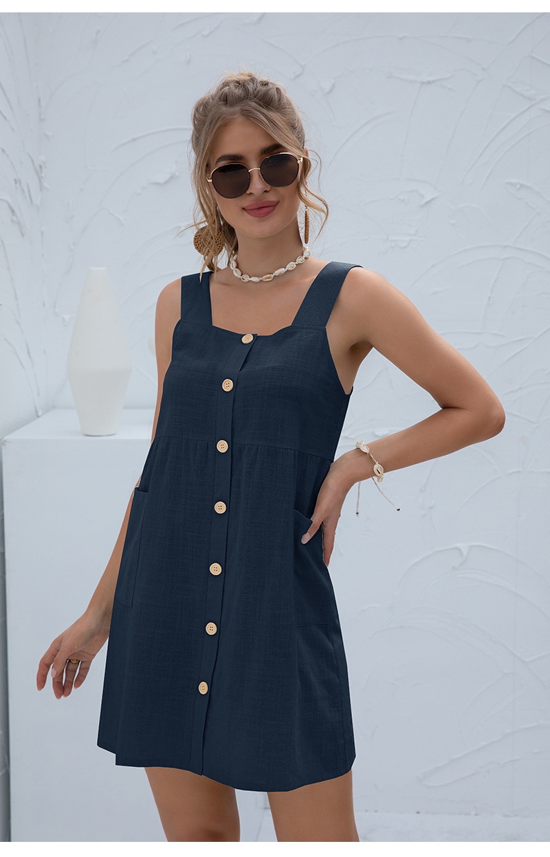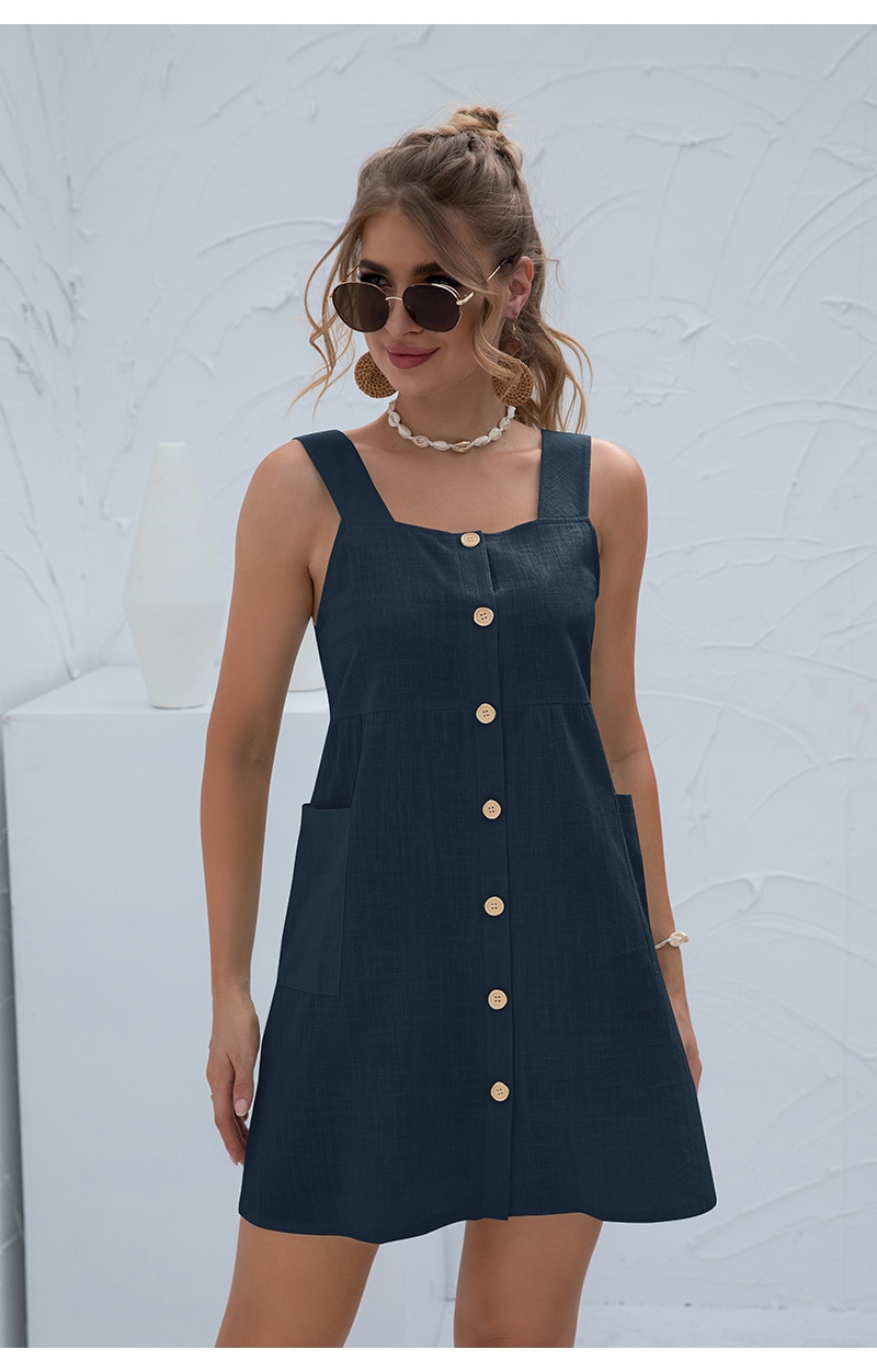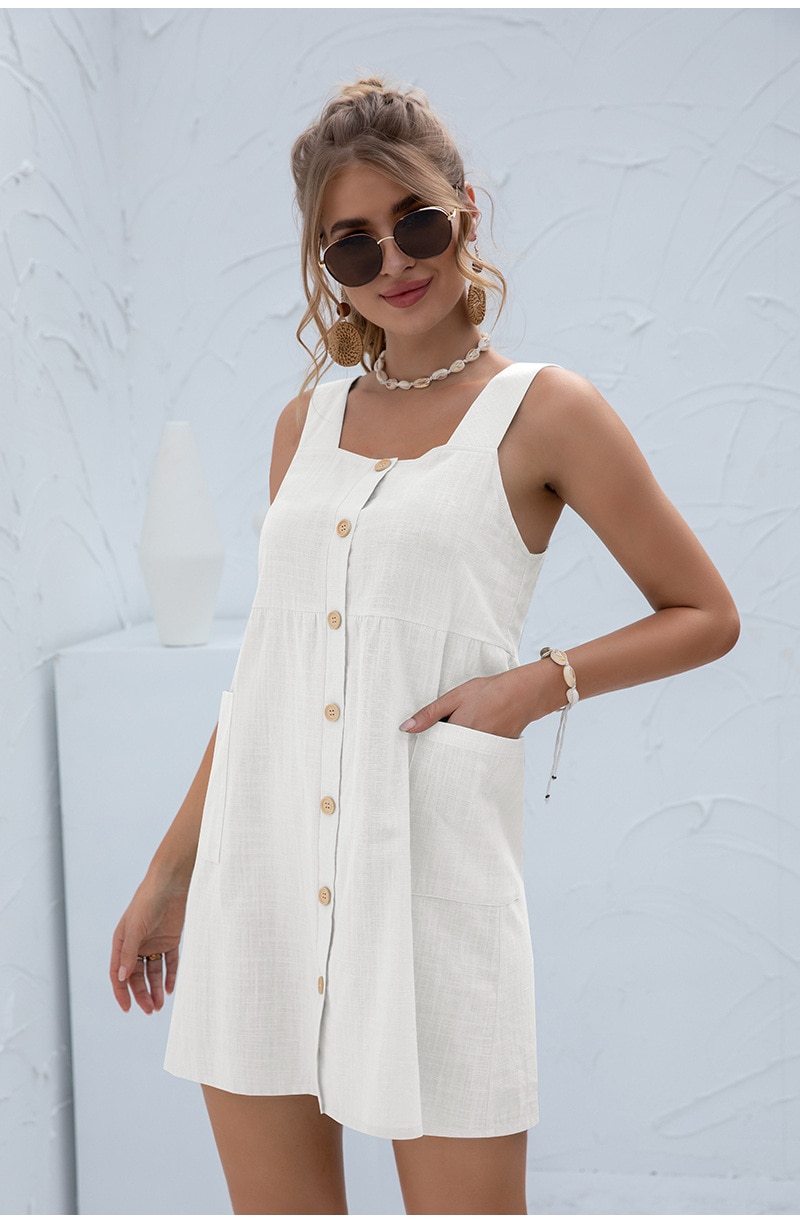 Summer Sleeveless Short Tank Dress Women Square Collar Pockets Button Vintage Mini Ladies Solid Sweet Sling Dresses