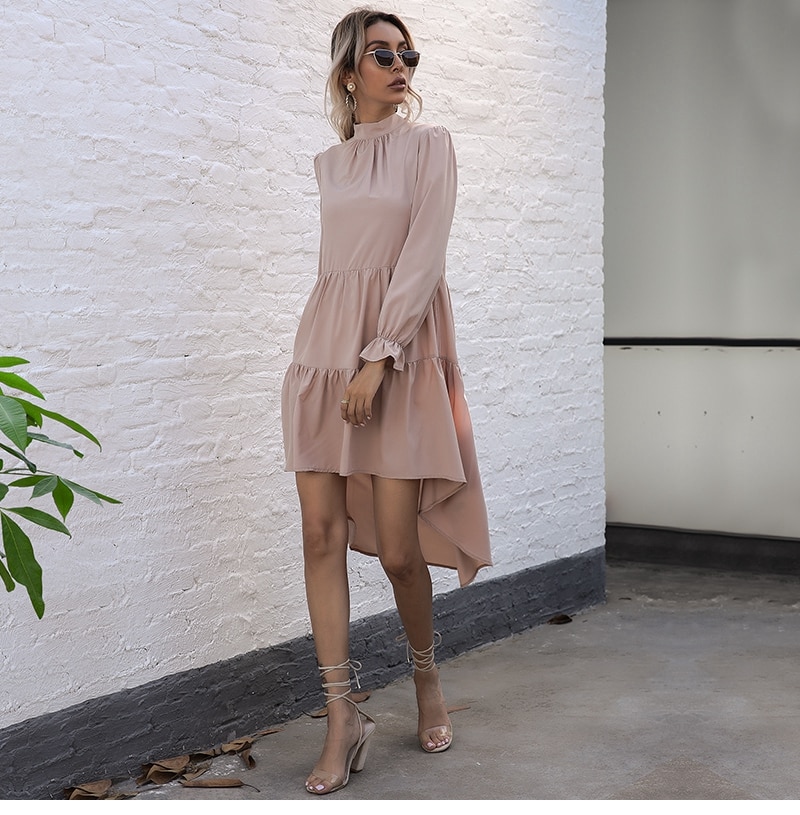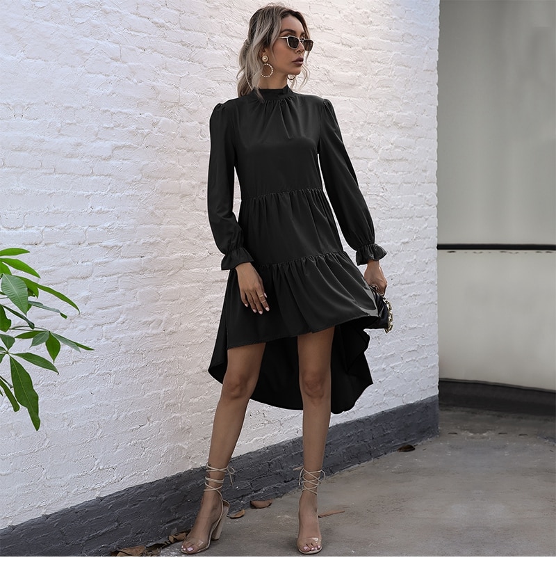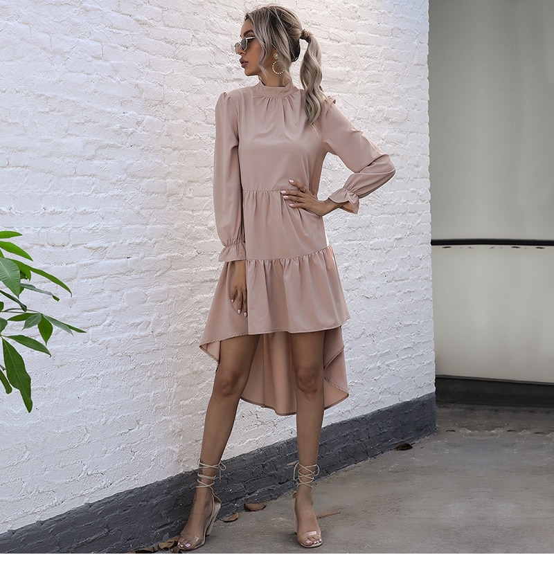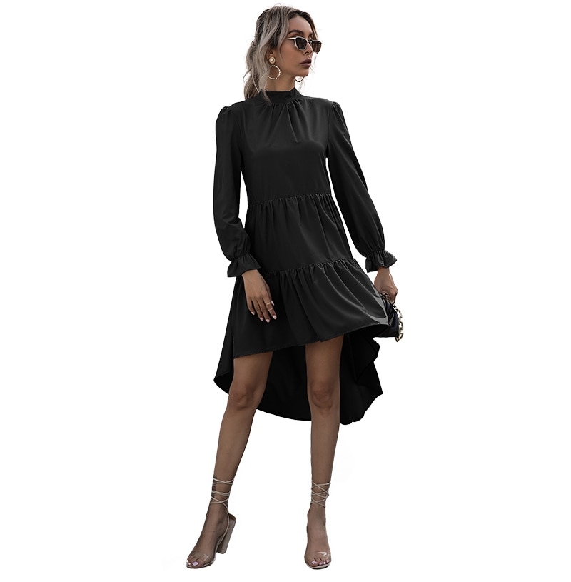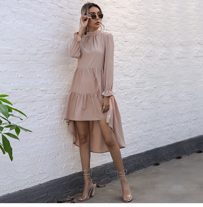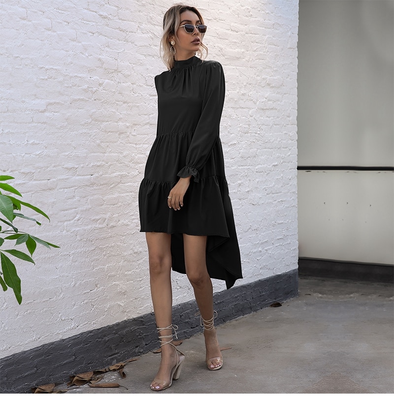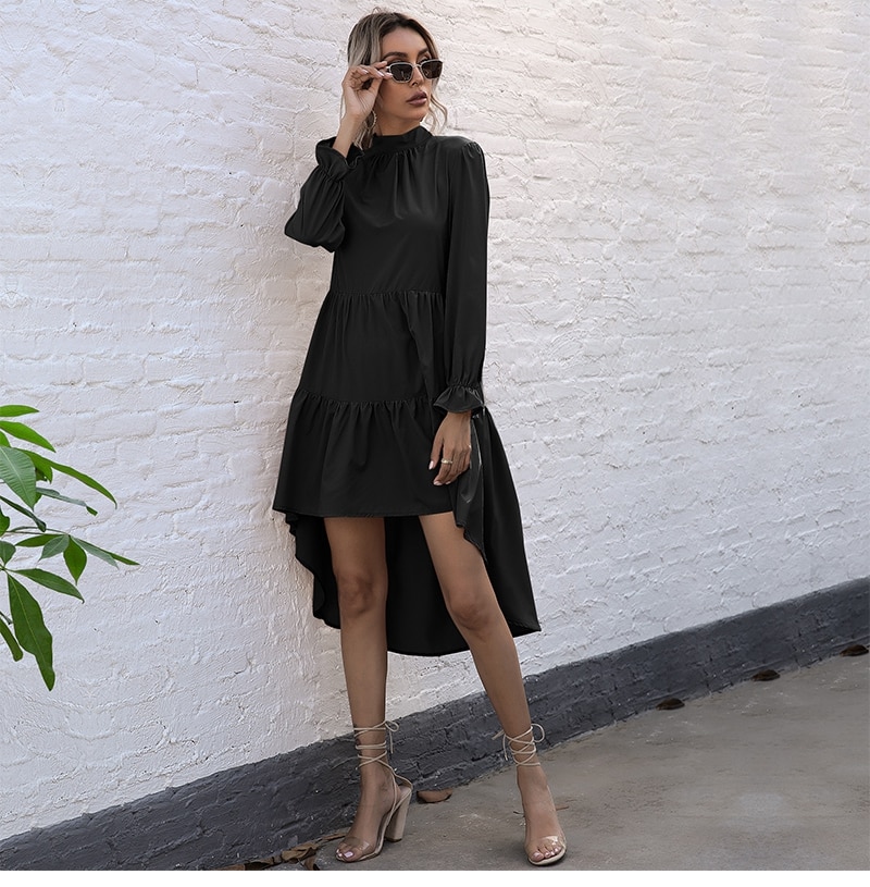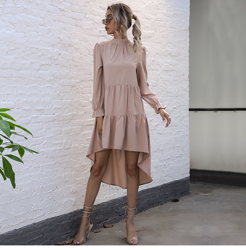 Summer Solid High-Low Dress Women Casual Flare Sleeve Half High Collar Ladies Shirring Asymmetrical Dress