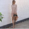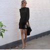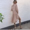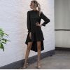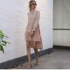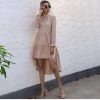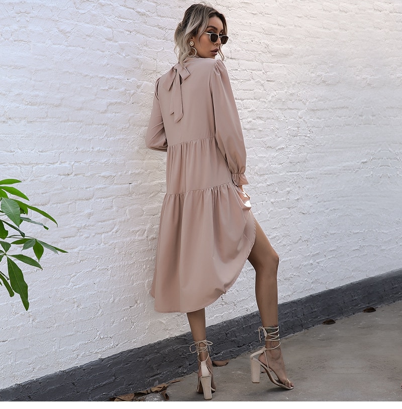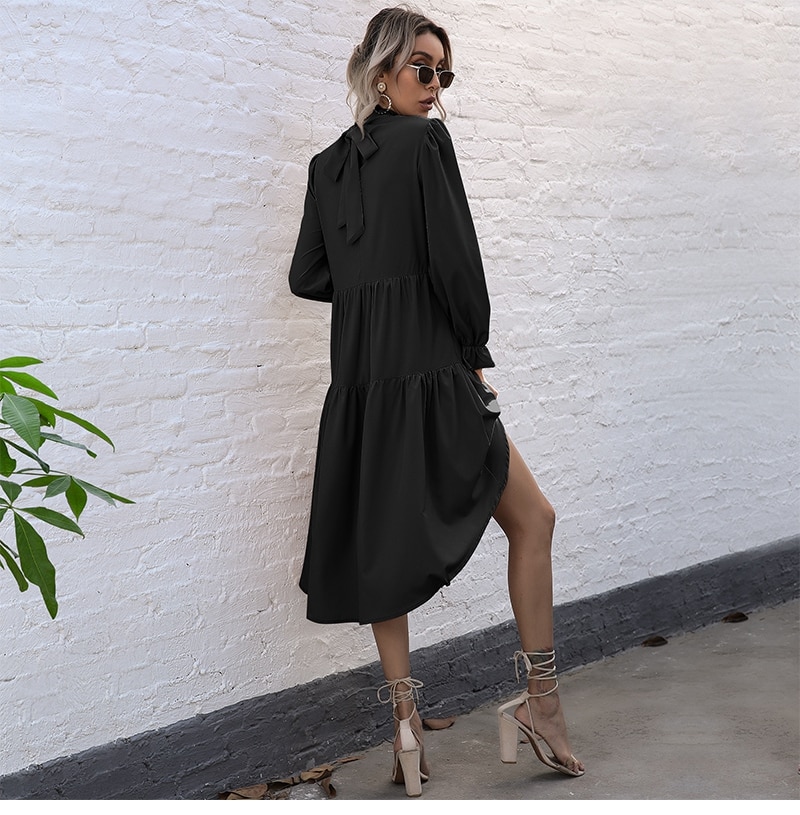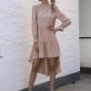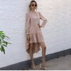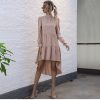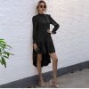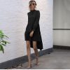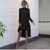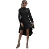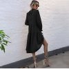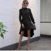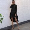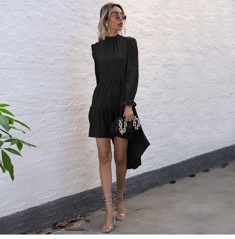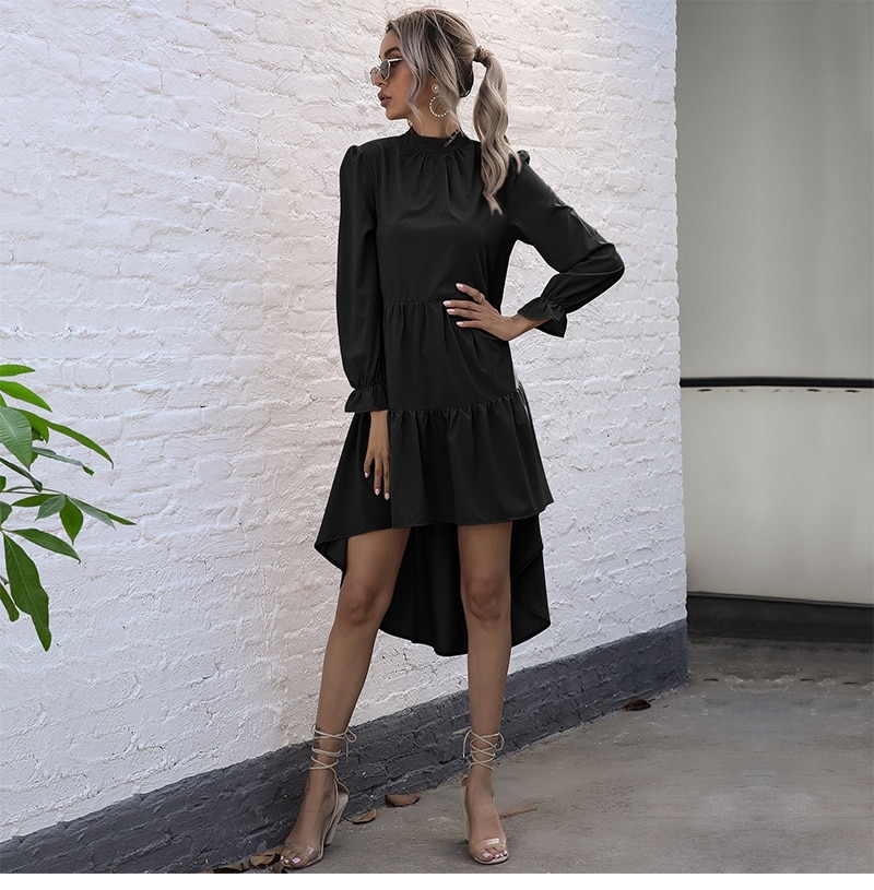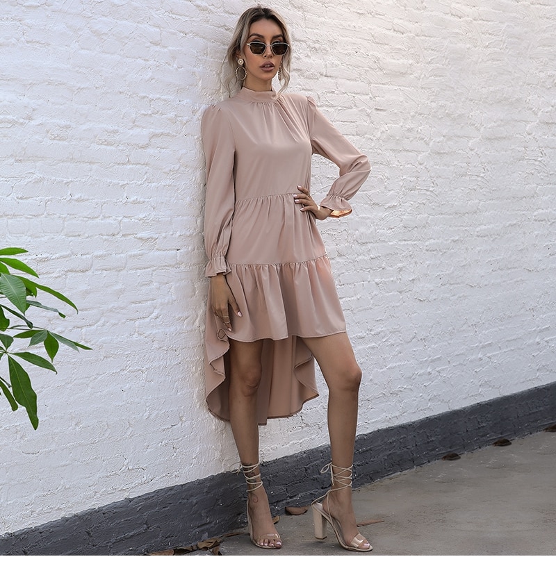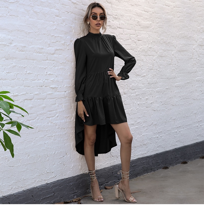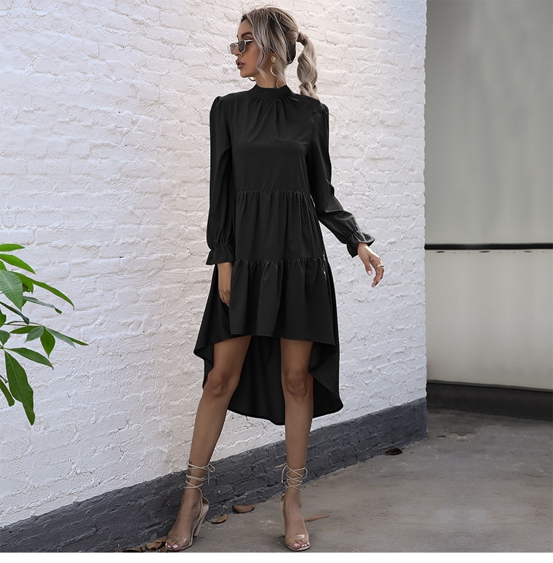 Summer Solid High-Low Dress Women Casual Flare Sleeve Half High Collar Ladies Shirring Asymmetrical Dress