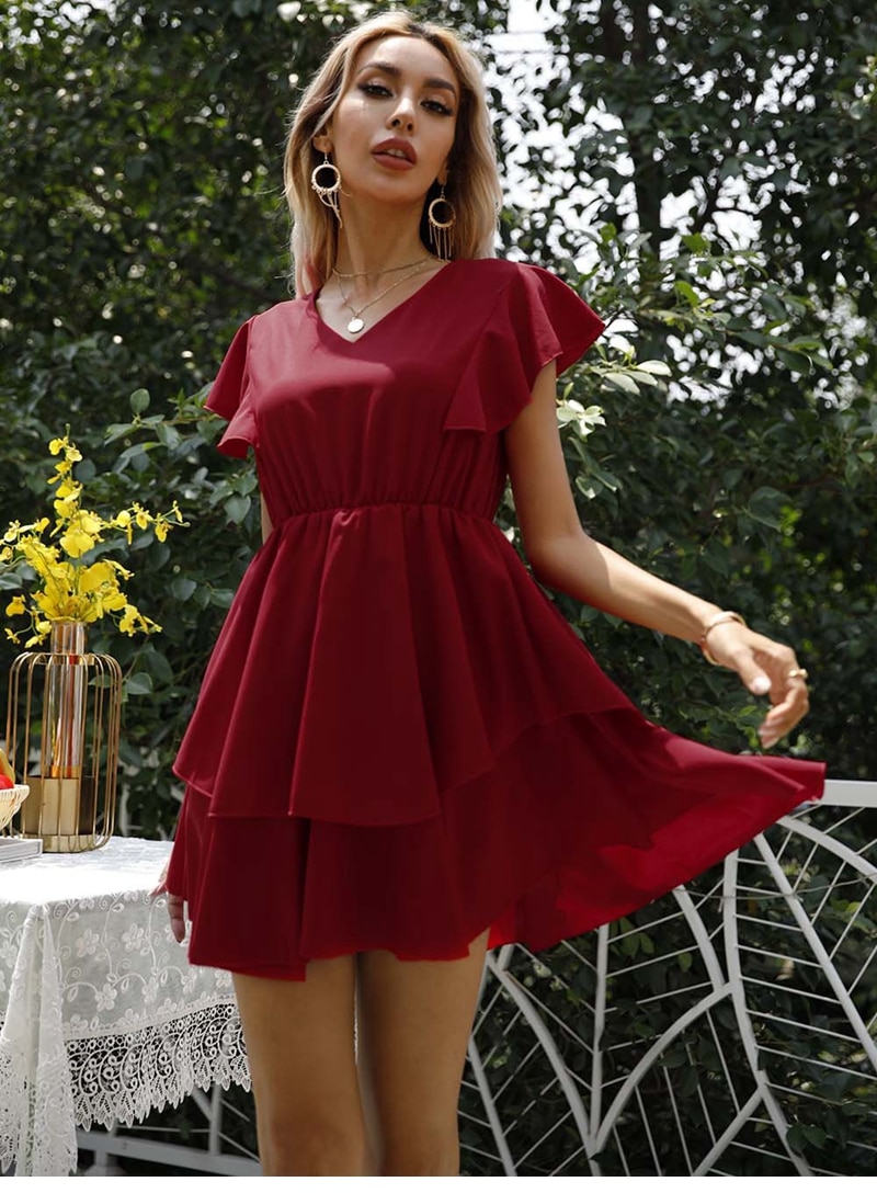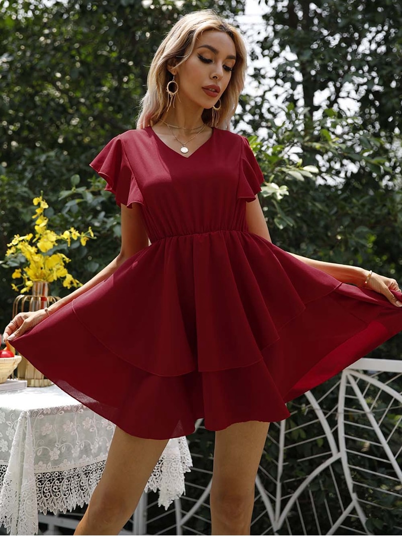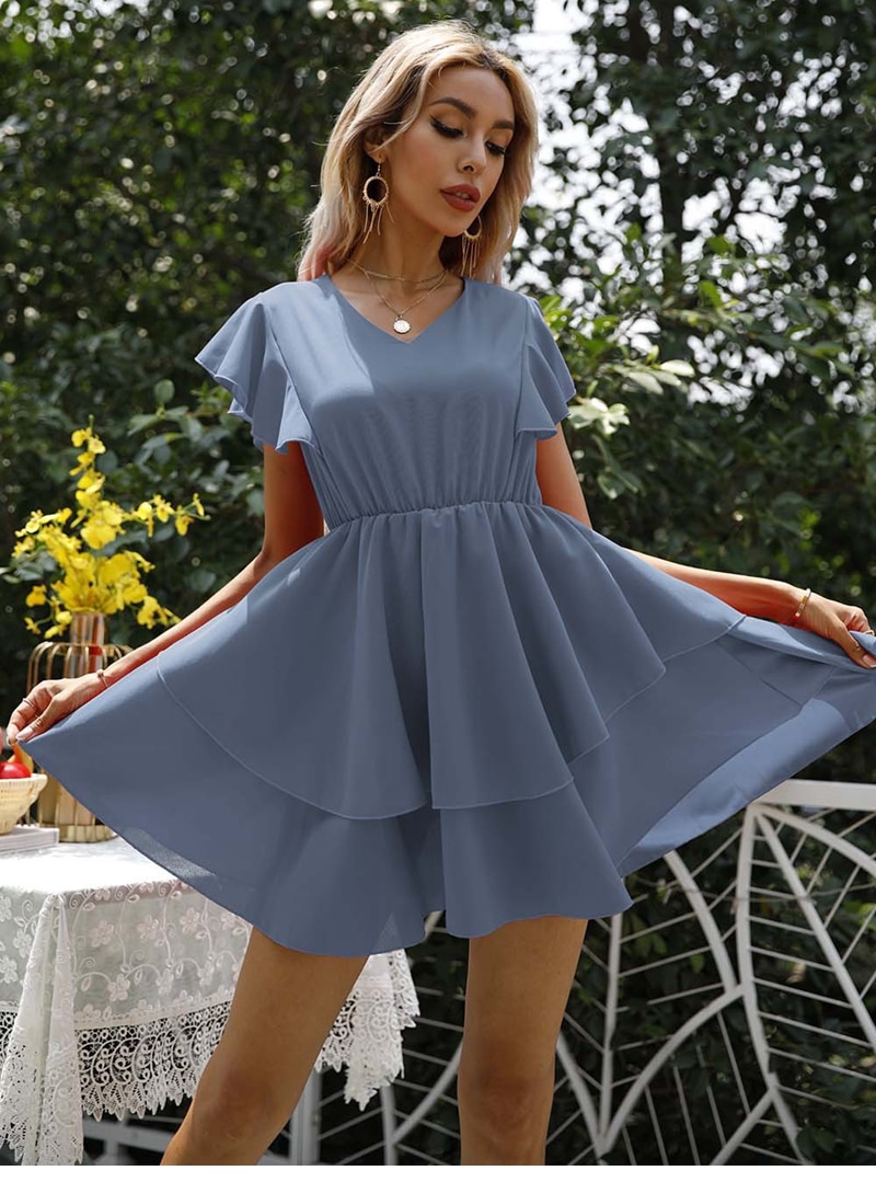 Summer Solid V Neck Cascading Ruffle Dress Women Casual Butterfly Sleeve V Neck Elegant Ladies Slim Wasit Short Dress New