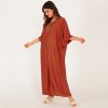 Summer Women Orange Long Dress Vintage Slit V-neck Webbing Half Sleeve Batwing Sleeve Loose Fashion Dress - Image 2