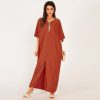 Summer Women Orange Long Dress Vintage Slit V-neck Webbing Half Sleeve Batwing Sleeve Loose Fashion Dress - Image 5