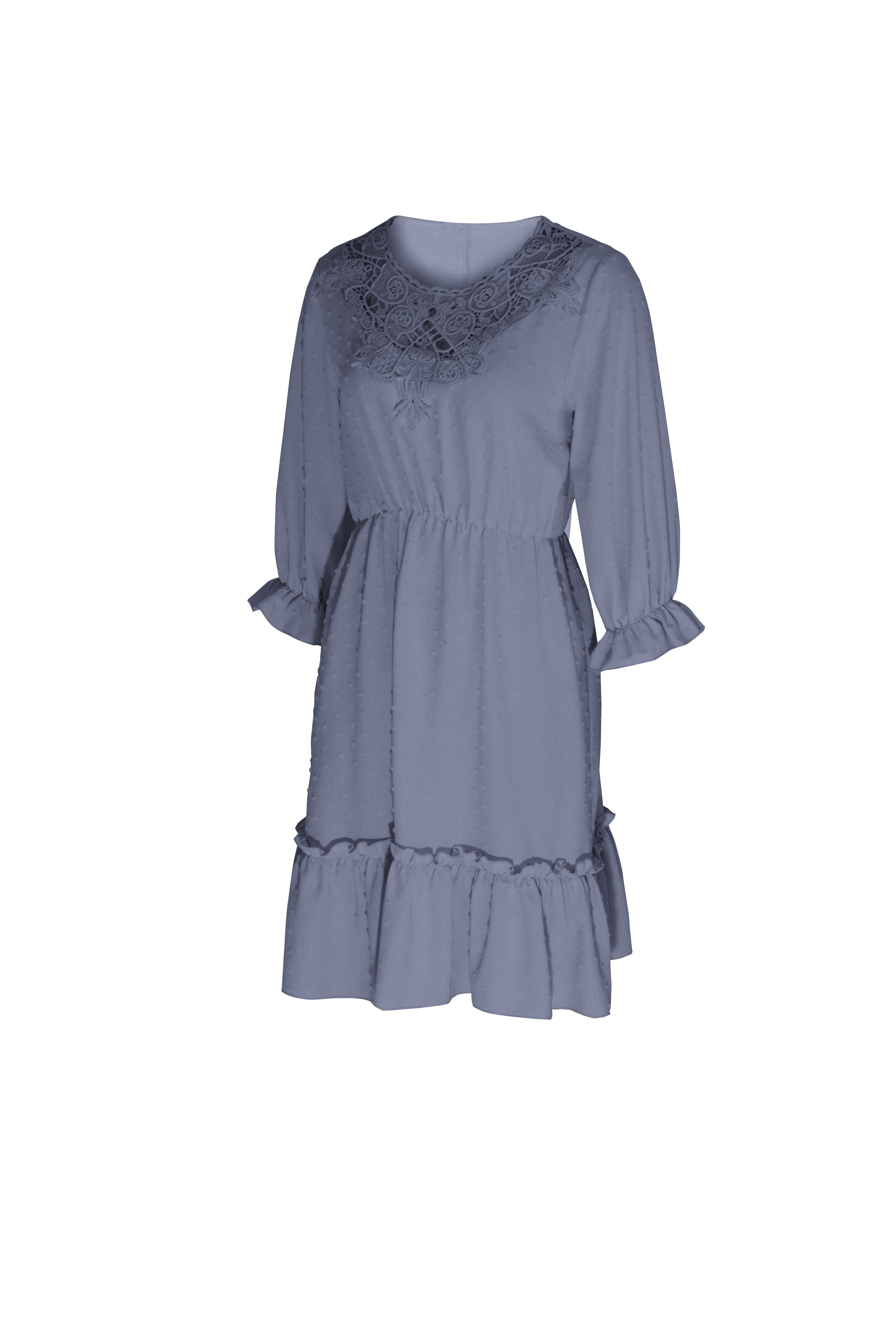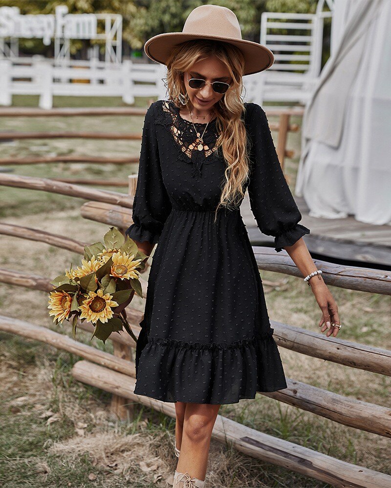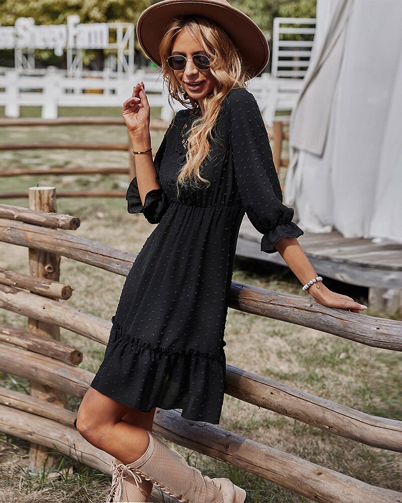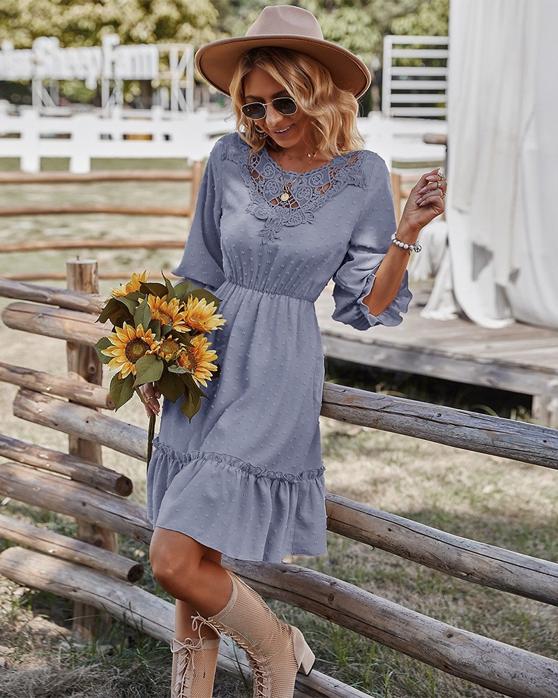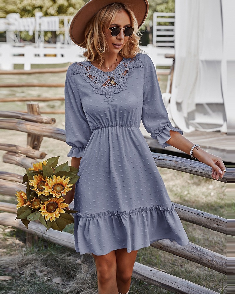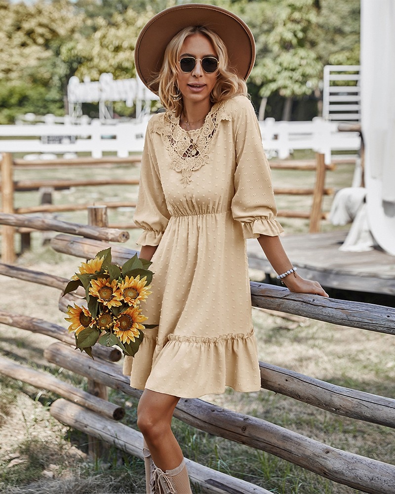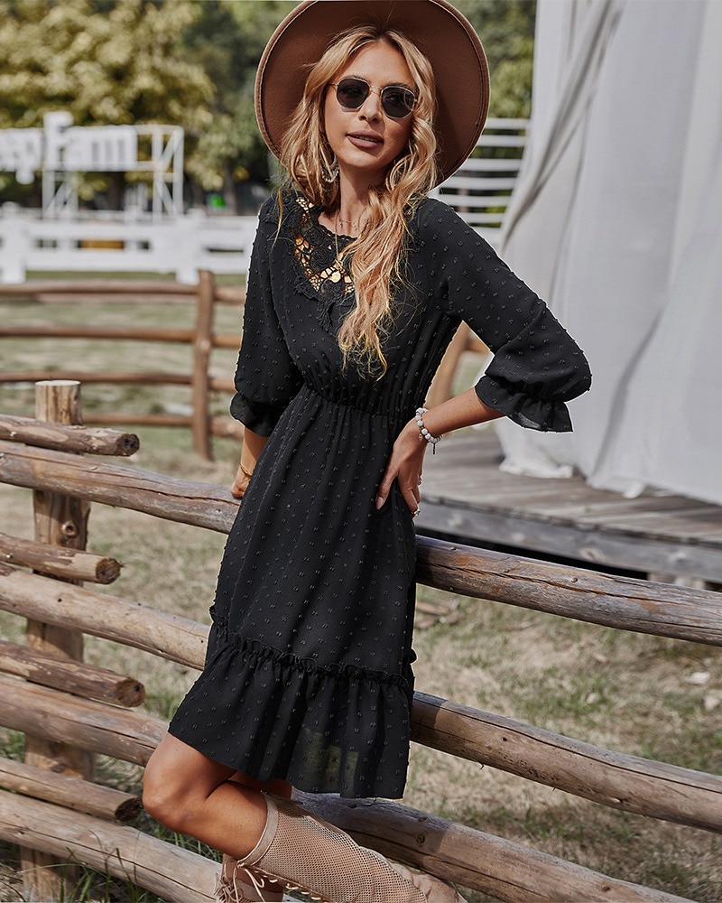 Temperament Women Summer V Neck Three Quarter Solid Color A Line Lace All Match Dresses For Fashion