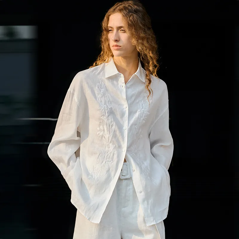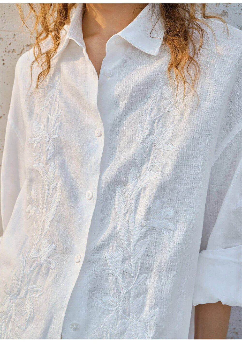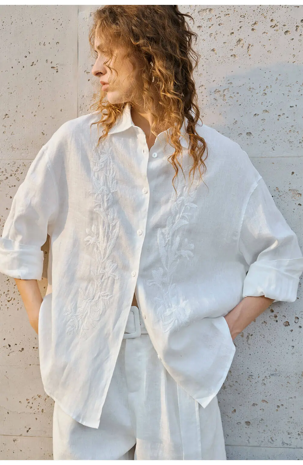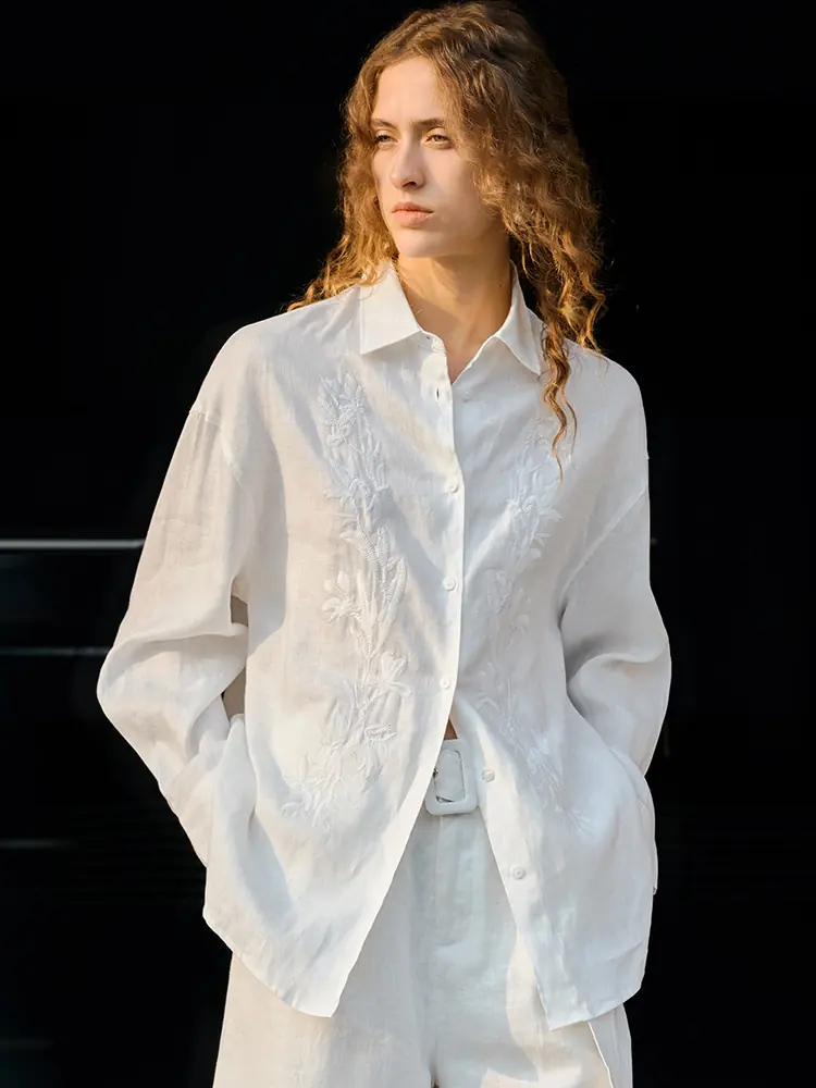 Timeless Breathable Pure Linen Floral Embroidery Long Sleeve Shirt