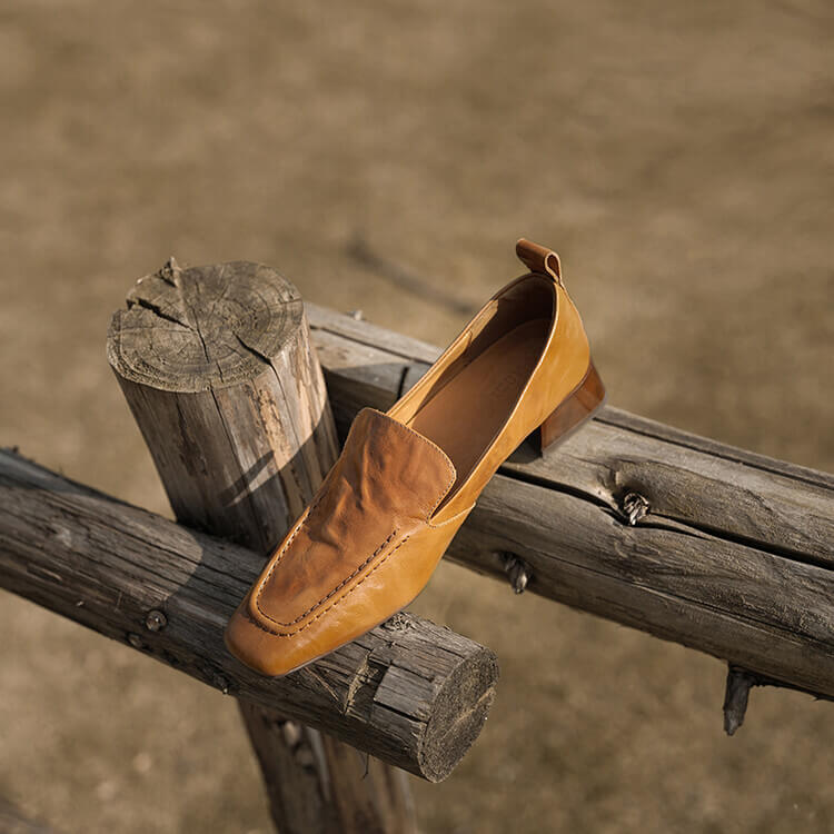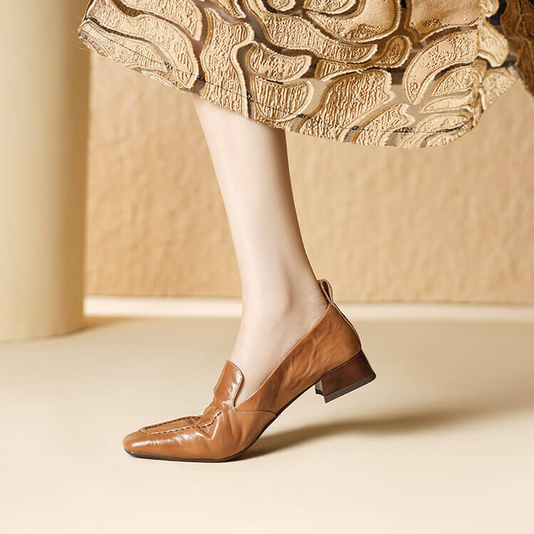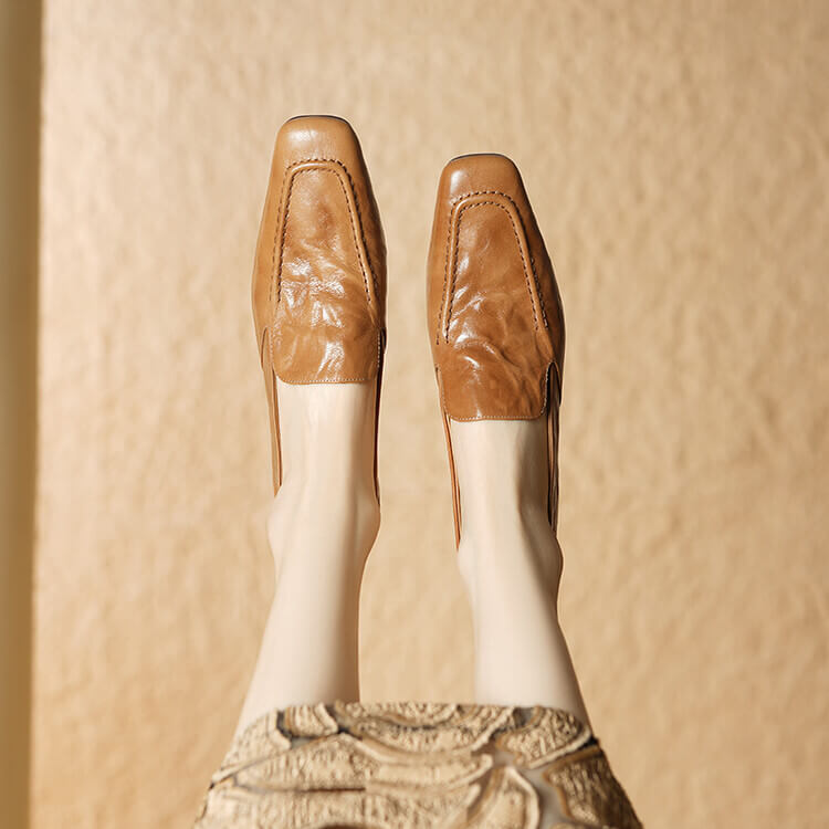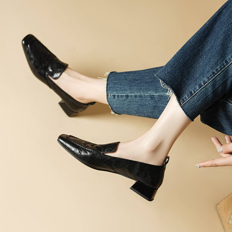 Timeless Crinkled Sheepskin Womens Square Toe Block Heel Loafers