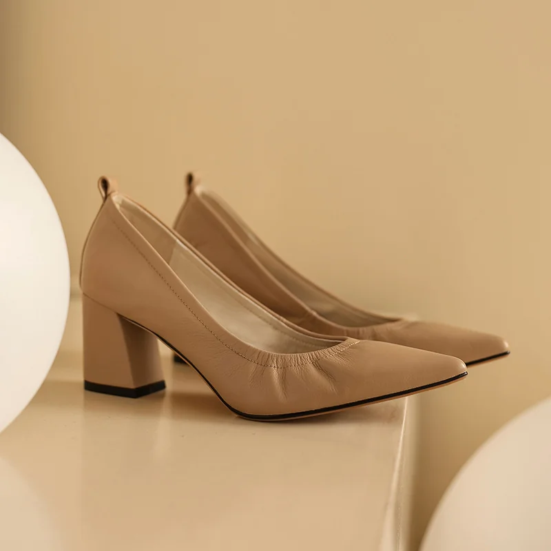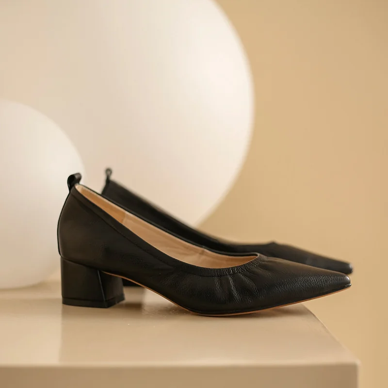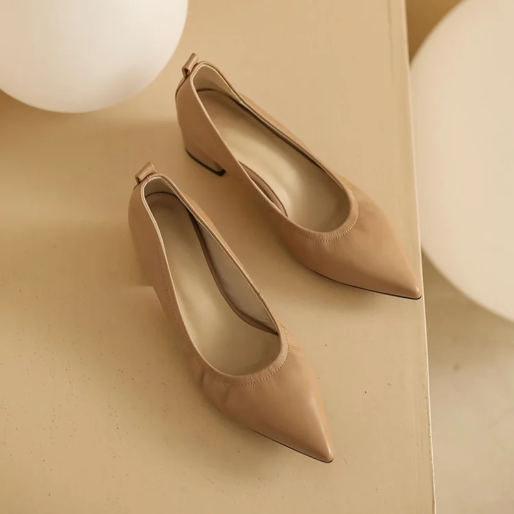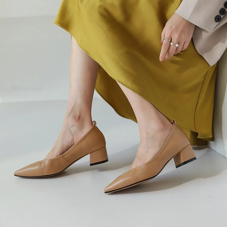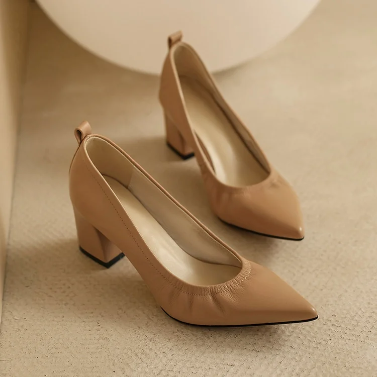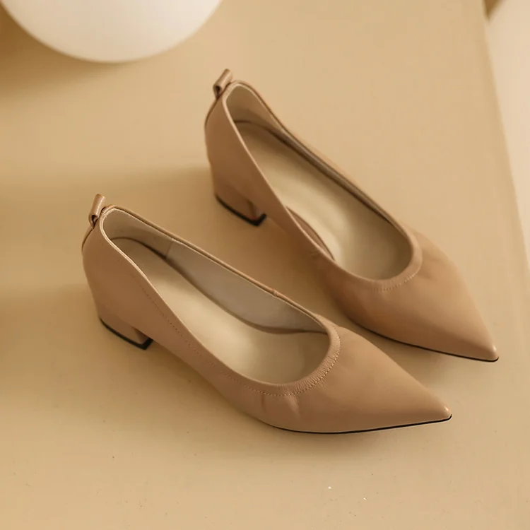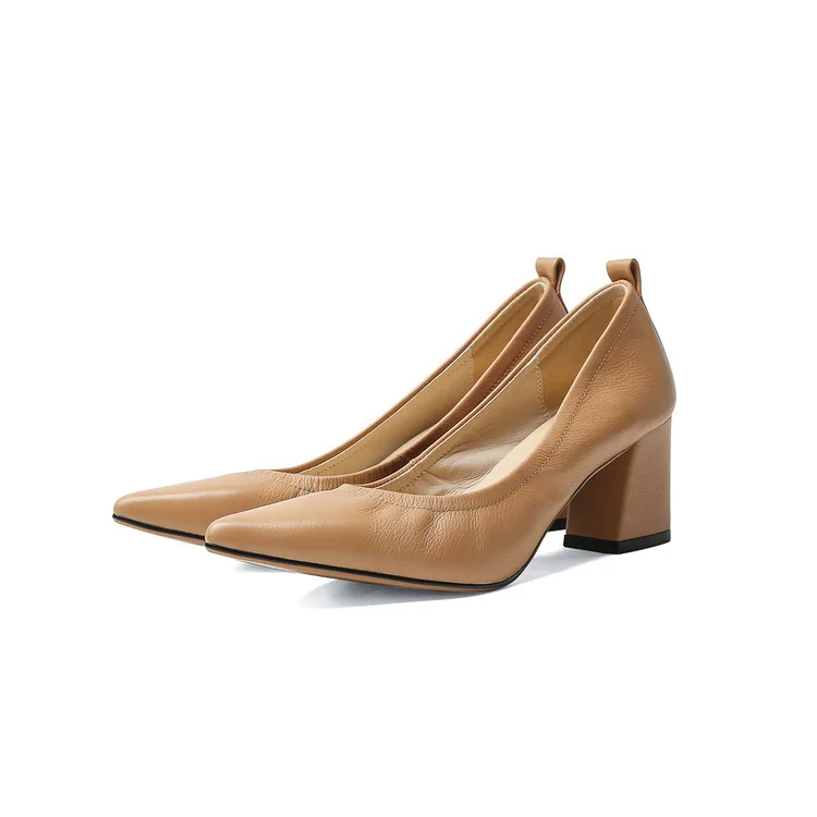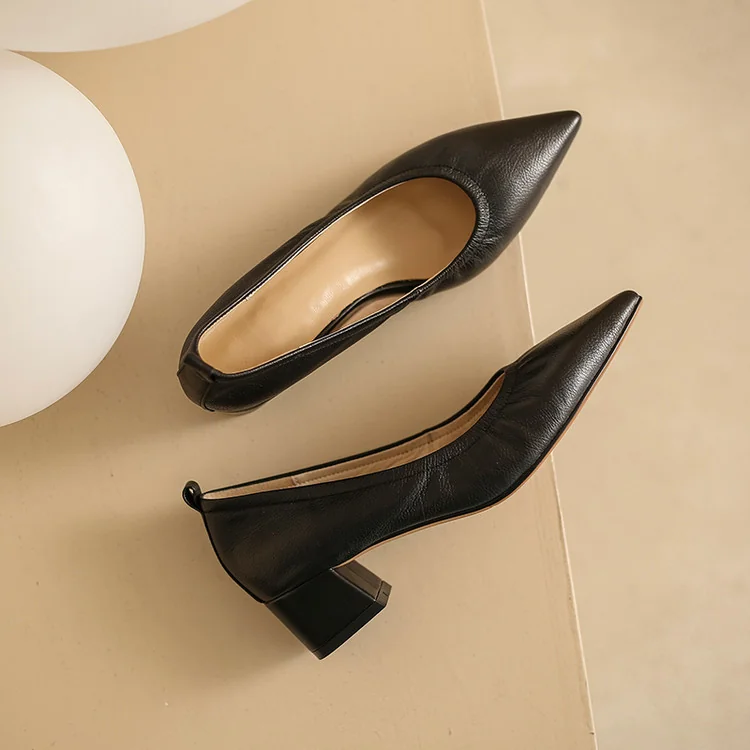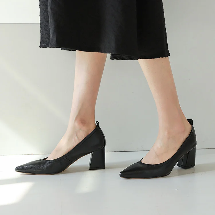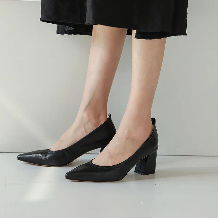 Timeless Grained Cow Leather Womens Pointed Toe Block Heel Court Shoes