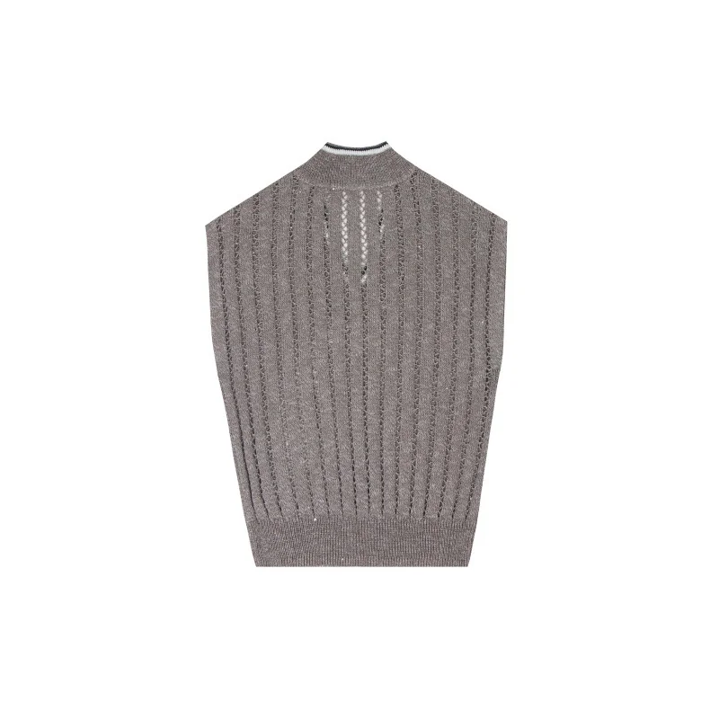 - Design: Contrast trim V-neck, sleeveless cut, pointelle cutout detail, ribbed hem, regular fit, available in khaki apricot and grey apricot