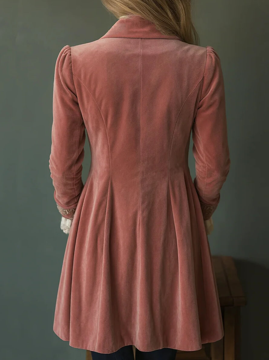 Slip into this velvet coat and feel the soft-handled fabric skim your skin with every movement, its subtle lustre catching soft indoor and street light as you walk. The mid-length cut falls gently to your mid-thigh, with a structured fit that holds its shape all day for an effortlessly put-together look, rooted in Romantic Bohemian sensibilities.