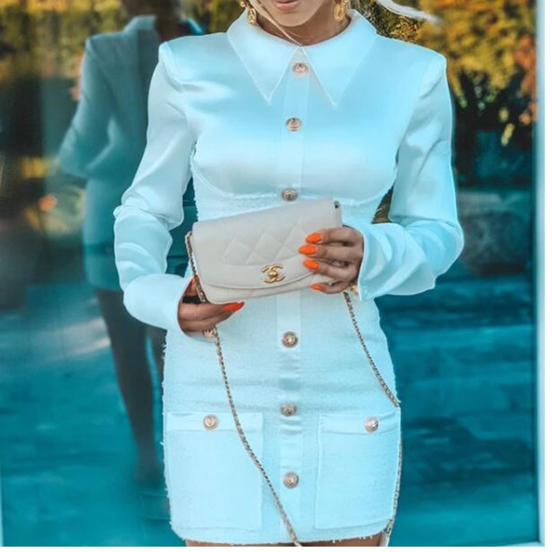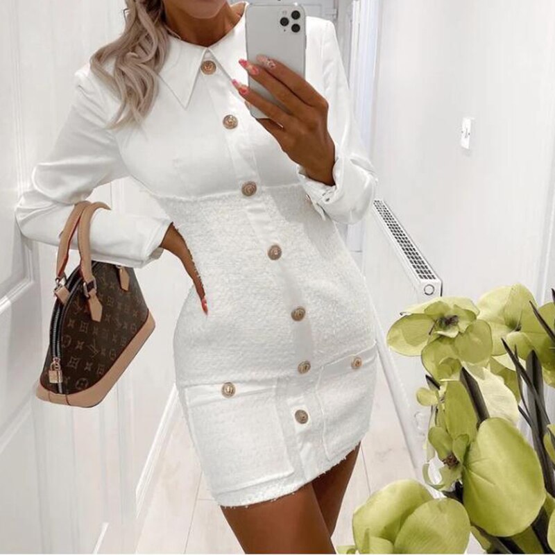 Turn Down Collar Long Sleeve Dress Winter Single Brested Elegant Office Ladies Party Dress Slim Fit White Bodycon Mini Dresses - Hplify