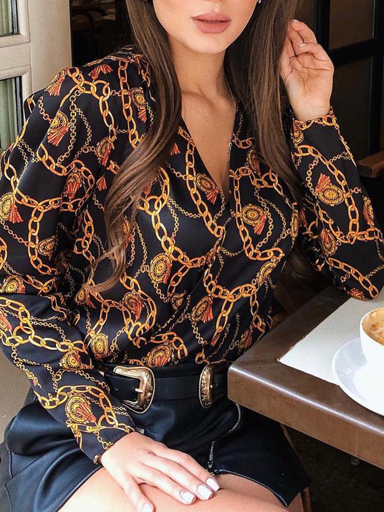 Vintage Chain Print Womens Tops and Blouses Turn Down Collar Long Sleeve Shirt Femme Workwear Shirts Autumn Fashion Blusa