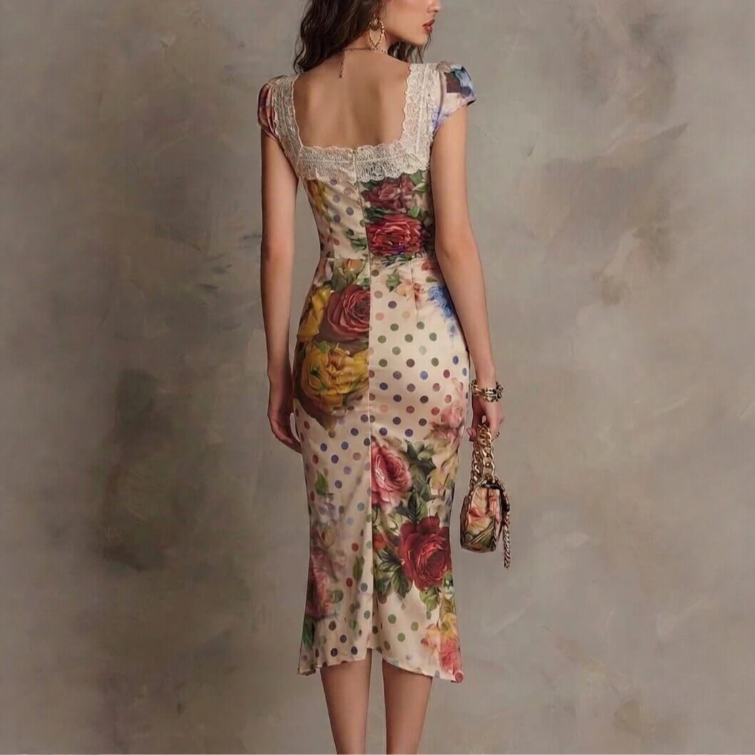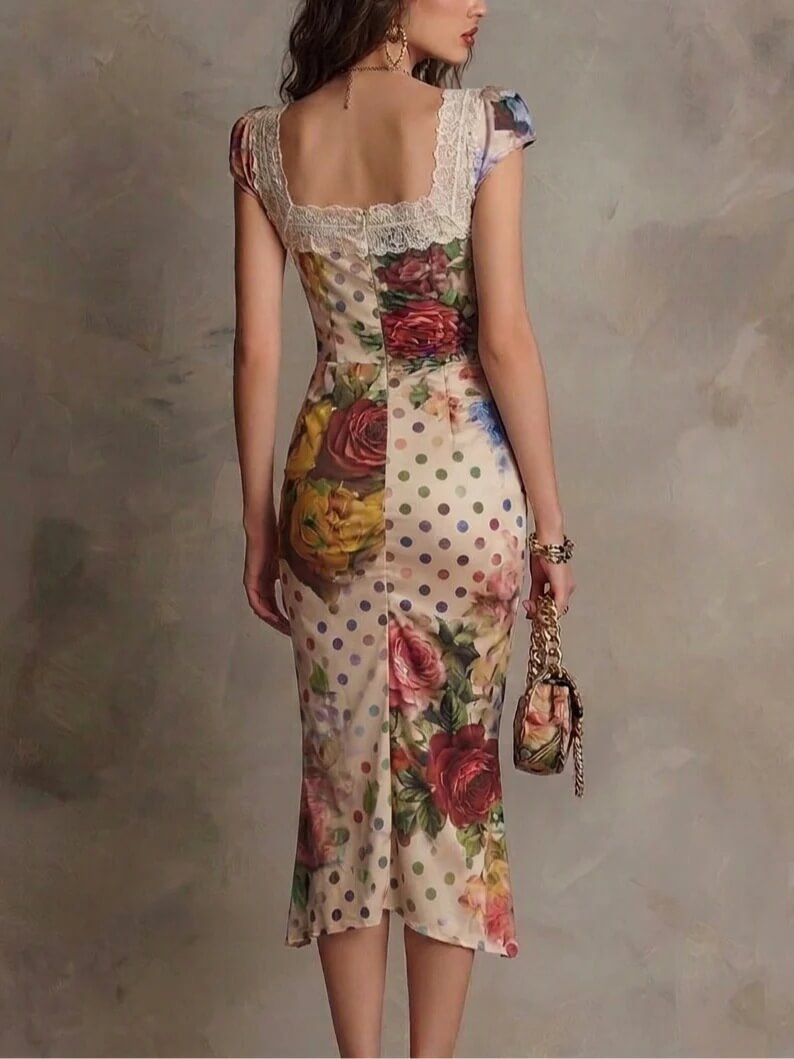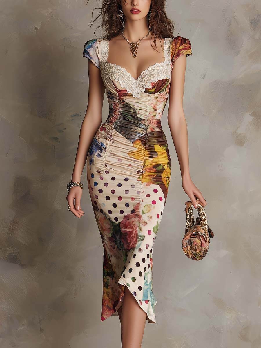 Slip into this midi dress the first time and you feel the soft, stretchy fabric skims the skin with smooth, breathable comfort. Delicate lace trims the square neckline gently against your collarbone, while the ruched bodice hugs your curves to create a sculpted silhouette. The mixed floral and polka dot print catches natural light with a subtle lustre, and the irregular hem flows with ethereal movement as you walk, leaning into a romantic bohemian vibe.