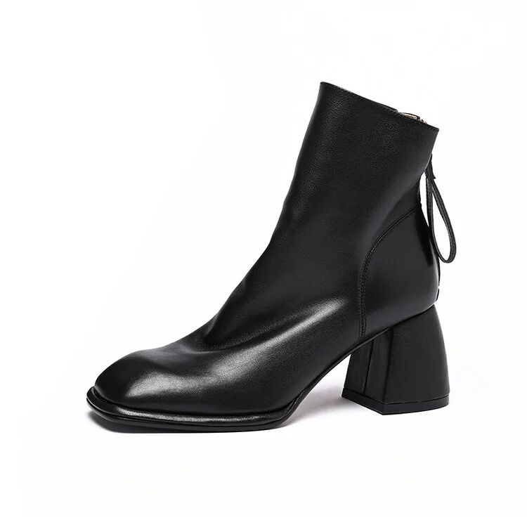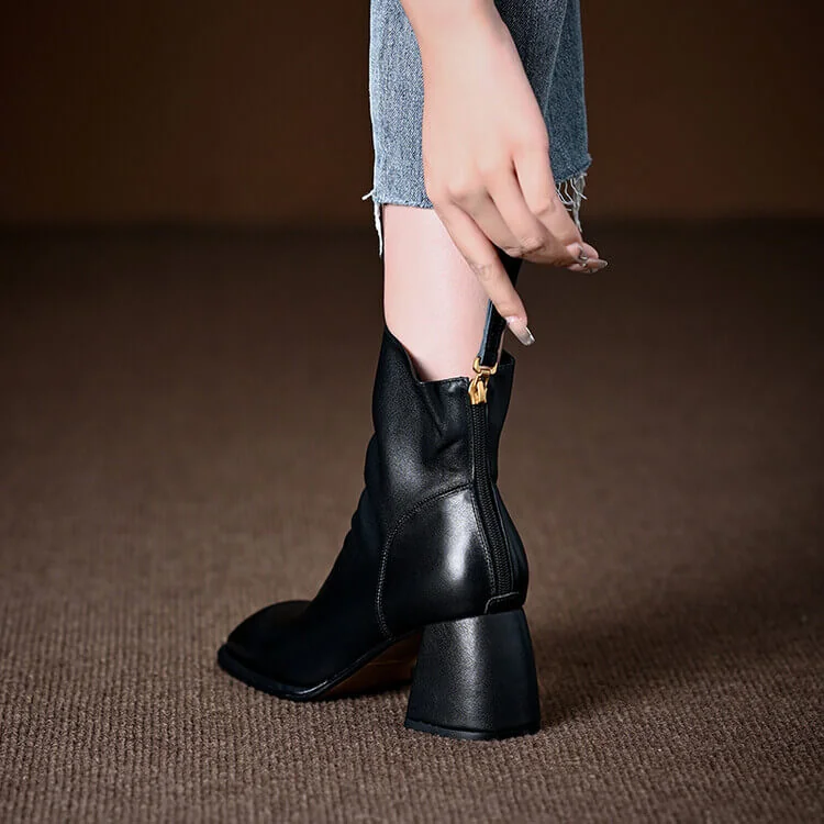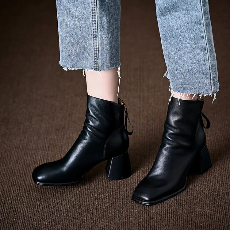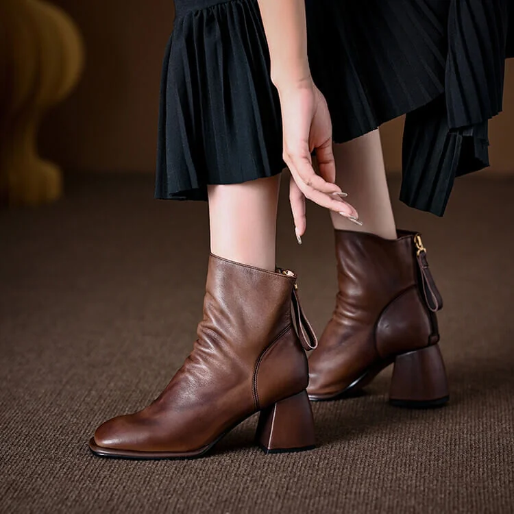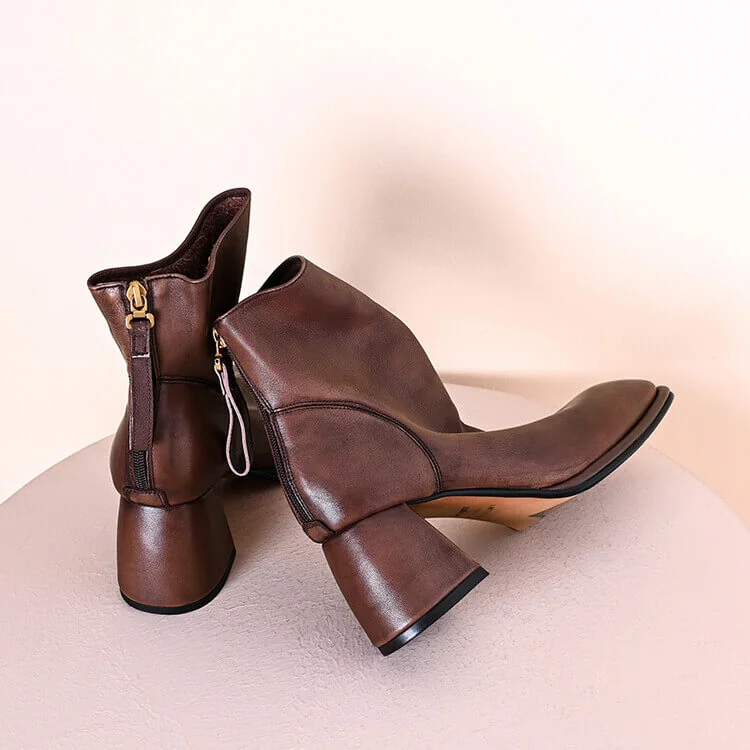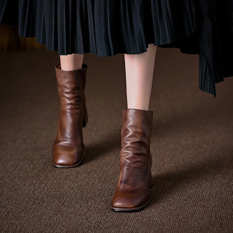 Vintage Top Grain Cowhide Womens Square Toe Block Heel Ankle Boots