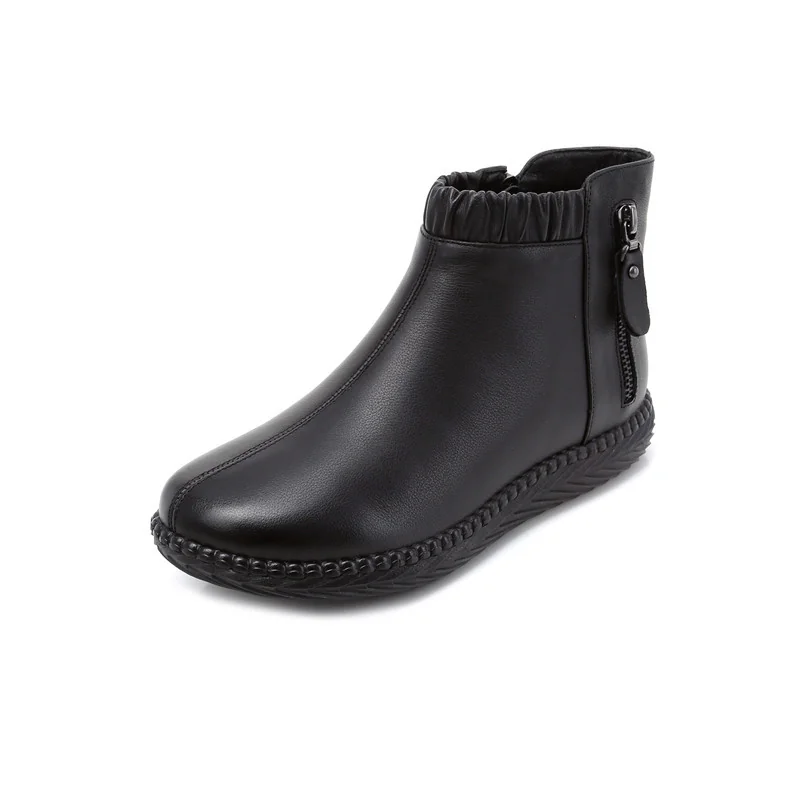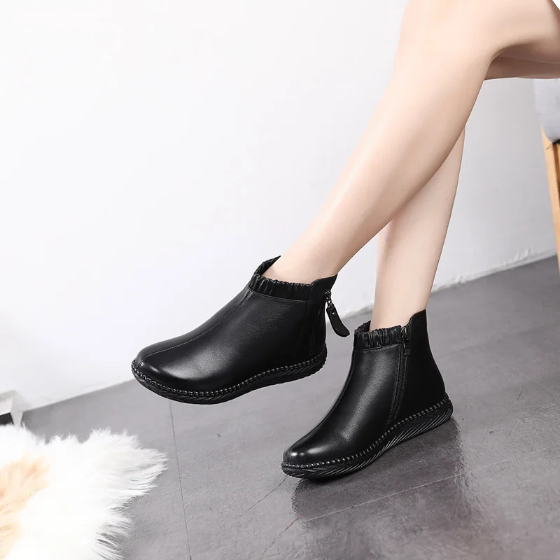 Winter Leather Ankle Moms Boots Wool Lined Non-Slip Rubber Sole Flat Side Zip