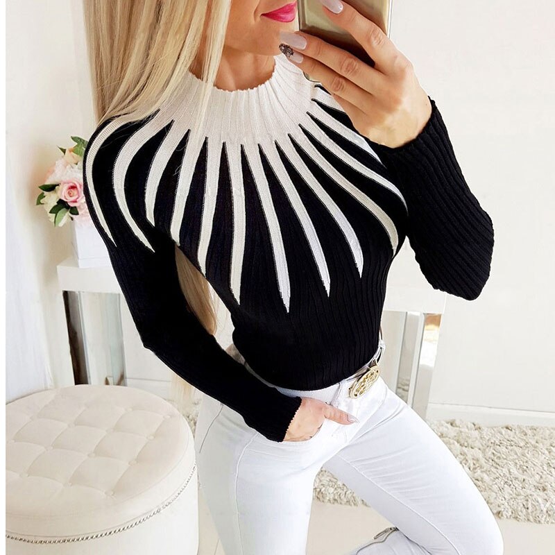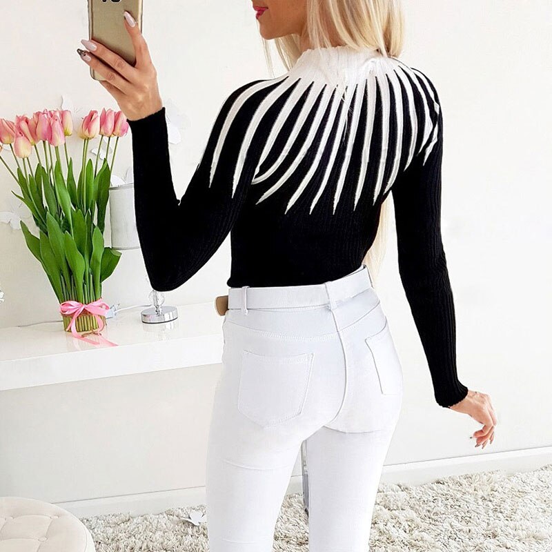Women Casual Slim Striped Print Top Long Sleeve O Neck Sewater Knitted Pulovers Patchwork Top