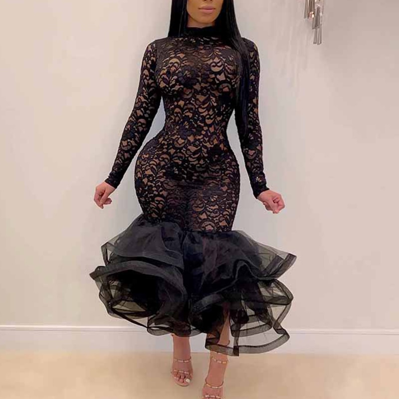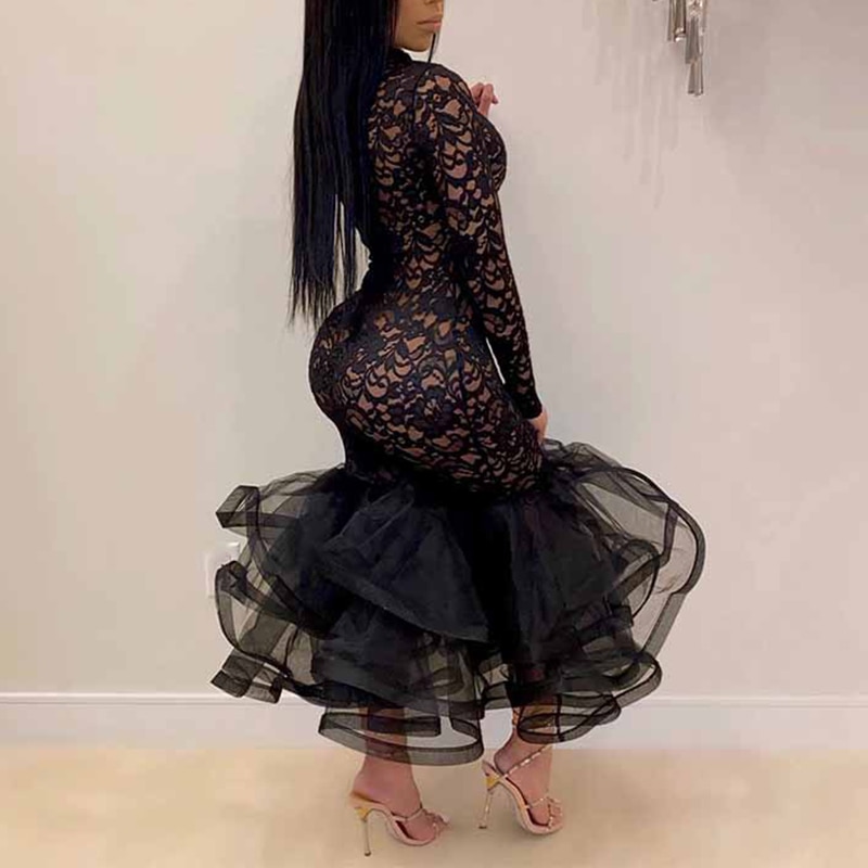 Women Hollow Out Dress Spring Winter Long Sleeve Dress Lace Ruffles High Waist Dresses Formal Party Bodycon Midi Vestidos